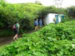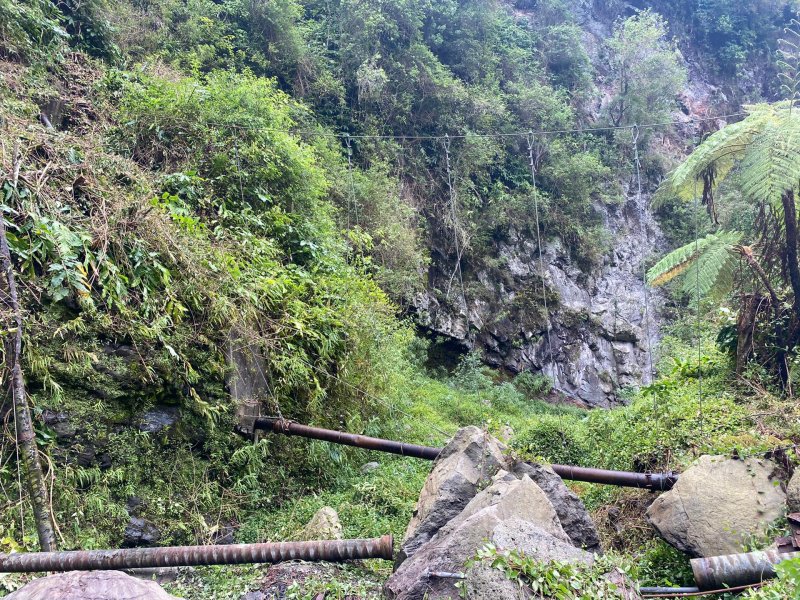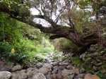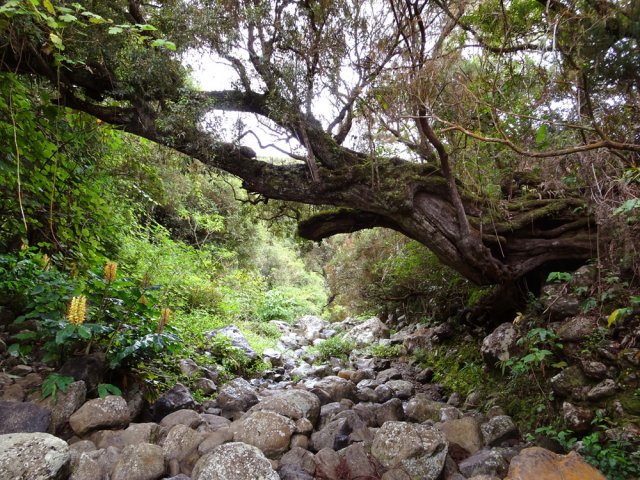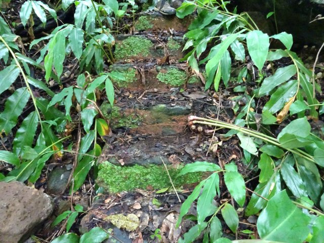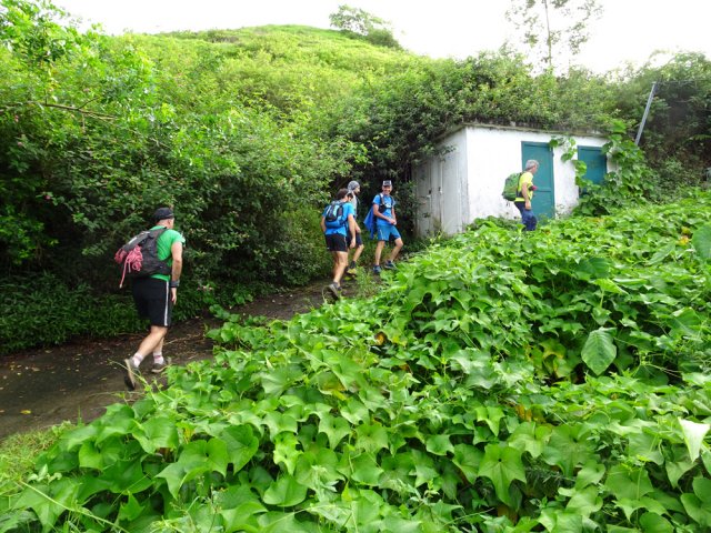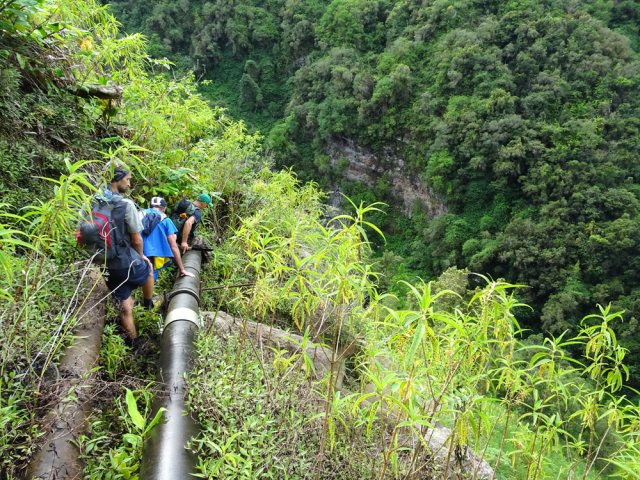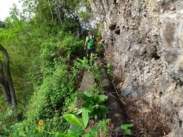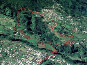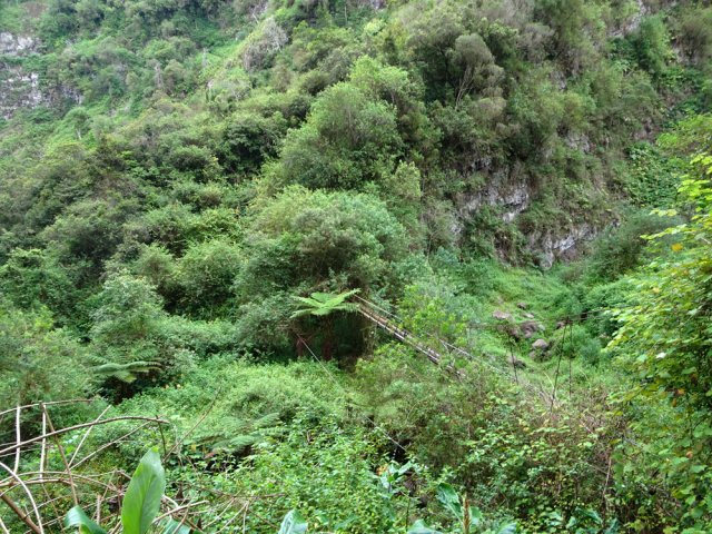 Sur la carte, dans la région du Tévelave, entre la Ravine des Avirons et le Grand Bras, on dénombre une bonne cinquantaine de petits ronds bleus correspondant à des sources. Toutes ne sont pas captées mais une grande majorité a fait l'objet de travaux de récupération du précieux liquide. Si on a le courage de marcher dans cette région couverte de longoses, on rencontre très souvent des canalisations de tous diamètres chargées du transport de l'eau. Certaines remplissent leurs fonctions durant des années et se trouvent noyées dans une jungle d'envahissantes. D'autres nécessitent quelques entretiens pour colmater les fuites. C'est à ce moment qu'il faut se précipiter pour se balader dans les bois de couleurs de la Forêt du Tévelave. Si aucun défrichage n'a été effectué par les équipes d'entretien, ne pas oublier le sabre qui se révèle fort utile pour étêter les longoses ou raccourcir les galaberts gênant le passage. C'est le cas de cette boucle qui comporte plus de route que de jungle mais qui s'adresse surtout à des amateurs avertis de ce genre d'expédition sportive et aléatoire. La passerelle qui traverse la ravine des Avirons est vieille mais solide. Elle a vrillé avec le temps aussi les sujets au vertige devront s'abstenir. Les allergiques au goudron manqueront quelques beaux panoramas et de belles traversées de cultures, prairies et villages isolés.