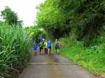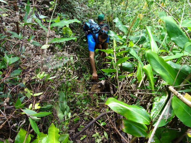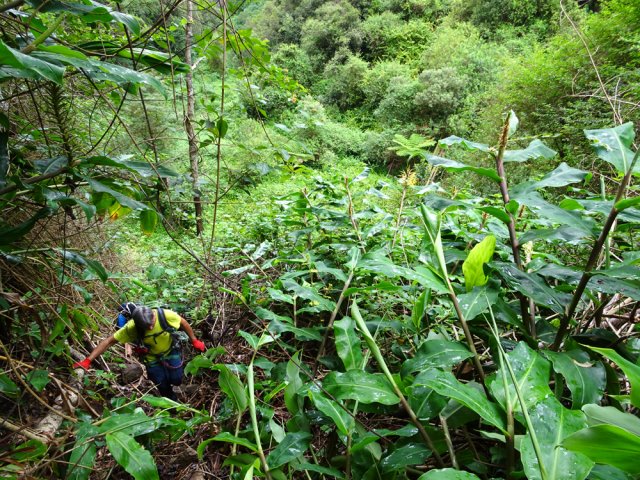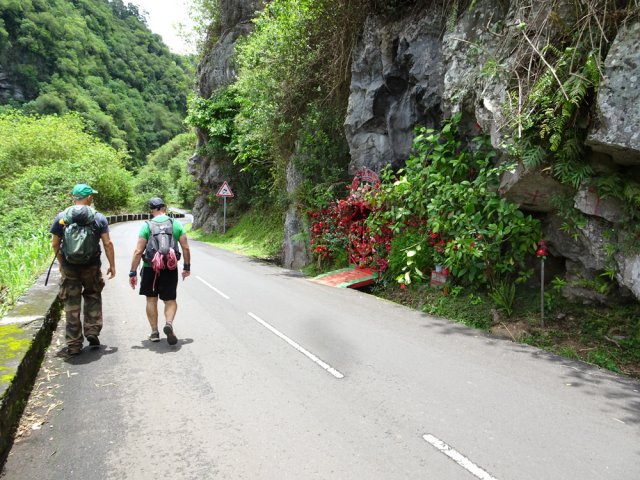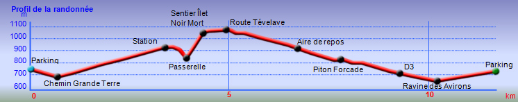 La randonnée débute au Plate où un grand parking peut accueillir des dizaines de véhicules en face de l'école du village. Imaginer pouvoir stationner ailleurs reste aléatoire. Partir vers les Avirons sur la D3 et passer le pont sur la Ravine du Trou. Poursuivre un peu et bifurquer à gauche sur le Chemin de Grande Terre. La montée régulière passe entre les champs de canne, les prairies, de hauts fossés couverts de renouées ou de broussailles (Photo 1). Le Piton Calvaire dépasse de la verdure lorsque l'on regarde vers la mer (Photo 2). Après deux kilomètres de cette agréable étape d'échauffement, on parvient à un petit bâtiment blanc sur la droite de la route. Remonter vers cette station de pompage (Photo 3). On passe quelques puisards métalliques où l'on entend couler l'eau. Un sentier rudimentaire s'enfonce dans la végétation déjà très encombrée de galaberts, longoses et jouvences. La marche est facile jusqu'au rempart qui plonge vers la Ravine des Avirons, envahie de longoses (Photo 4). Poursuivre sur la gauche le long de la canalisation qu'on ne quittera guère durant la traversée (Photo 5). La marche se fait presqu'à plat mais le rempart sur la droite peut être impressionnant par endroits. On distingue, dans le bas, le sentier qu'on prendra pour ressortir en rive gauche et l'on devine même la passerelle (Photo 6). La canalisation longe des barres rocheuses comportant des mains courantes très sécurisantes (Photo 7). Le passage est étroit mais on passe sans se poser de question. Certains ouvrages bétonnés étroits remplacent efficacement le sentier (Photo 8). Quelques roches détachées de la falaise ou des arbres bouchent parfois le passage et imposent de rares acrobaties. La pente s'intensifie vers le bas et il suffit de suivre le tuyau qui plonge pour connaître la direction (Photo 9). La pente devient de plus en plus forte dans les longoses et surtout les galaberts qui accrochent les vêtements. Un passage plus vertical que les autres se franchit sur une échelle posée au sol (Photo 10). Un regard vers le haut et la barre rocheuse du départ donnent une bonne indication du pourcentage de la pente (Photo 11). Sous les feuilles mortes de longoses on découvre les marches d'un escalier qui amène plus facilement jusqu'à la passerelle (Photo 12). Le sentier se termine à la passerelle étroite qui longe la canalisation. Une trace part sur la droite pour descendre au fond de la ravine dans les renouées qui dépassent le mètre de hauteur. Hélas, la traversée est bien trop difficile pour retrouver le sentier en face et les marcheurs partiront sur les caillebotis métalliques pas toujours bien fixés (Photo 13). Le coupe-coupe dans le sac peut s'avérer très utile pour agrandir le passage bouché par les branches de poivriers. Une fois les branchages franchis, l'ouvrage part littéralement en vrille et impose de marcher un pied sur la passerelle, l'autre sur la canalisation. Les mains sont indispensables pour se maintenir (Photo 14). Sous l'ouvrage rouillé, les fanjans ont grandi dans les renouées qui couvrent le sol (Photo 15). Plus bas, un câble neuf et des haubans permettent de voir l'autre tuyau, plus récent, qui traverse la ravine. Chacun doit prendre ses responsabilités pour emprunter cette passerelle et passe en-dessous en cas de doute. Attention, il ne devra pas y avoir plus d'une personne à chaque franchissement même si la passerelle est encore très solide malgré son aspect délabré (Photo 16). De l'autre côté, le sentier débute en pente plus forte que pour la descente (voir profil ci-dessous). On distingue l'ouvrage en s'élevant d'une trentaine de mètres (Photo 17). Le tuyau, noyé par endroits dans de gros plots de béton, est en très forte pente. Le sentier qui le longe est tout aussi encombré que sur l'autre rive et la montée s'apparente parfois à de l'escalade (Photo 18). Les plots de béton créent des marches hautes de plus de 80 cm avant de rencontrer un escalier ressemblant à celui utilisé dans la descente (Photo 19). Quelques passages particulièrement difficiles comportent des cordes ou des échelles salutaires (Photo 20). Il faut près de 30 minutes très sportives pour atteindre le bord du rempart. Le sentier, plus fréquenté, est facile à suivre, presqu'à plat dans les branles et fougères (Photo 21). Laisser le sentier partant à droite sur l'ancien emplacement de l'Îlet du Noir Mort et poursuivre sous les cryptomerias vers le sentier des Ouvriers (Photo 22). C'est la fin des difficultés. Partir à droite sur le sentier des Ouvriers (Photo 23). Il descend vers le Bras de Jeanne qu'on traverse à gué avant d'en suivre un court tronçon pour reprendre la descente (Photo 24). Plus loin, le sentier arrive à la route du Tévelave. Poursuivre jusqu'au village par le sentier ou par la route. Depuis l'éboulement et l'interdiction d'emprunter cette route, les plantes s'en donnent à cœur joie et auront vite fait d'occuper toute la surface bétonnée (Photo 25). Passer la barrière, l'aire de repos et arriver au village. Prendre à droite au Chemin Miel Vert puis entamer la longue descente vers la D3 en longeant de belles étendues de chouchous qui recouvrent tout (Photo 26). Il suffit, pour certains habitants, de tendre la main depuis la fenêtre pour cueillir les brèdes de midi ! On passe entre les habitations et les jardins fleuris avant de poursuivre sur le Chemin Parc à Mouton. Plus bas, prendre à droite le chemin de l'Alambic pour contourner le discret Piton Forcade qui dépasse à peine des prairies et des champs de canne. La circulation est faible et l'on peut descendre sereinement en longeant la Ravine des Avirons (Photo 27). La fin de la boucle, toujours sur route, est tout aussi agréable en effectuant un long lacet pour franchir le pont sur la Ravine des Avirons (Photo 28). L'école du Plate se rejoint sans effort.
