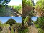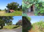 3 – La solution proposée ici. Rejoindre le sentier comme en 1, marcher jusqu'au gué puis remonter le Bras Creux en escaladant la falaise de la cascade à sec (Photo 25). Se frayer parfois un passage dans les cannes fourragères ou suivre simplement le fond basaltique jusqu'à la piste (Photo 26). Emprunter la piste vers la gauche et commencer une agréable descente dans les champs de canne (Photo 27). N'emprunter que les chemins bien tracés par les roues des tracteurs. On côtoie des cases abandonnées, de beaux camphriers, des eucalyptus avant de parvenir au stade du 12e (Photo 28). Ce jeu de piste amène au gué déjà rencontré à la montée. Poursuivre simplement sur le sentier pour arriver en 5 minutes à la Rue Saint-Vincent de Paul.