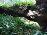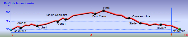 La randonnée débute à la passerelle du Chemin de Pétréas qui permet le franchissement à pied de la rivière en cas de crue. Près du gué, on retrouve le sentier des Petits Tamponnais Ruraux, association disparue en même temps que le sentier, excepté le tronçon décrit ici. Débuter sur cet agréable sentier comportant peu de fortes montées (Photo 1). Une première arche est présente dans le fond de la rivière mais elle est difficilement accessible. Un hors sentier est nécessaire pour s'en approcher entre les arbres et longoses (Photo 2). Petite acrobatie pour s'approcher de l'eau et trouver l'arche au-dessus de son bassin (Photo 3). Remonter un peu la rivière sur les roches de la rive droite puis traverser une belle étendue de renouées du chinois dépassant la hauteur d'un homme par endroits. Ne pas manquer une nouvelle arche sur la gauche (Photo 4). On peut passer dessous pour rejoindre une grande grotte en rive droite. Les bassins se succèdent, imposant quelques courtes escalades sans danger (Photo 5). Cette remontée de rivière amène à un énorme bassin que l'on peut visiter s'il est à sec. Descendre et remonter, également par l'escalade de quelques roches lisses (Photo 6). 5 minutes plus tard, on rencontre un autre endroit, magnifique, très sauvage, destiné aux amateurs de photos de nature (Photo 7). Cet ensemble de bassin-grotte-falaise est un des plus beaux endroits de la boucle. Comme la remontée est rendue impossible sans matériel, faire demi-tour mais délaisser le fond de la ravine pour chercher un passage dans la falaise en rive droite. L'échappatoire se situe derrière un arbre qui aide à l'escalade (Photo 8). Une fois l'étroit passage franchi, remonter en direction du champ de canne à sucre en traversant facilement le bois (Photo 9). Suivre les cannes jusqu'au sentier. Avant de poursuivre vers l'amont, rejoindre le gué et entamer une descente de la rivière en rive gauche pour rejoindre le dernier bassin délaissé il y a quelques minutes. Là aussi, sans danger, descendre vers les bassins dans lesquels il est déconseillé de se baigner (Photo 10). Deux d'entre eux sont séparés par une troisième arche basaltique qui ne se voit pas si le bassin est trop rempli (Photo 11). Remonter au gué puis entamer la suite en empruntant le sentier très fréquenté des marcheurs et coureurs. On y rencontre une racine d'une quinzaine de mètres assez caractéristique (Photo 12). Marcher sous les énormes camphriers bordant le sentier (Photo 13). Le Bassin Samuel se remarque sur la droite mais il n'est pas facile de s'y rendre sans se griffer. Plus loin, repérer le sentier plus discret obliquant sur la droite en direction du Bassin Michel (Photo 14). Le plus souvent à sec, il demande un peu d'attention pour atteindre le fond. Les minuscules marches de basalte facilitent la descente (Photo 15). Lorsque le bassin est plein, c'est une autre affaire que de remonter la rivière (voir ci-dessous la vignette 1 de la photo du § après les pluies). De l'autre côté, l'escalade est identique et facile (Photo 16). Le bassin, un peu envahi de plantes est suivi d'un très long toboggan creusé d'une profonde marmite d'où il serait impossible de sortir sans aide en cas de chute (Photo 17). Plus haut, c'est un gruyère de basalte qui doit être très impressionnant lors de crues importantes. Il se traverse par quelques escalades sans grand danger (Photo 18). Une ferme en rive gauche se repère avec les cris, aboiements, meuglements, cacabements de pintades et odeurs de lisier ! Les pigeons s'envolent par dizaines des anfractuosités où ils viennent pondre. On domine plusieurs bassins plus ou moins importants. Celui situé le plus en amont est alimenté par un petit pisse en l'air après la pluie. On remarque vers l'aval une arche discrète mais qui semble pourtant imposante. Pour s'en approcher au plus près, rejoindre le sentier et marcher vers l'aval jusqu'aux belles racines moussues. Descendre vers le lit puis remonter sur l'îlot basaltique créé par deux bras de la rivière en s'aidant ou non d'une sangle (Photo 19). En remontant l'îlot, on parvient au-dessus de l'arche. Il vaut mieux éviter de monter sur l'arche ou alors le faire prudemment (Photo 20). Cinq mètres d'une corde passée autour d'un arbre peuvent rassurer et éviter la chute dans l'eau sale. Revenir au sentier. En cherchant bien, on devine une arche plus en aval qui se rejoint également avec prudence. De retour sur le sentier, marcher à nouveau vers l'amont jusqu'au prochain embranchement (Photo 21). Partir à droite jusqu'à la rivière. Traverser à nouveau les longues renouées du chinois jusqu'au Bassin Capillaire, reconnaissable à sa grotte tapissée de cette petite fougère de dentelle (Photo 22). N-ième retour au sentier en remontant cette fois la petite falaise basaltique pour rejoindre le gué une centaine de mètres plus haut. Au gué, remonter la rivière à sec jusqu'au confluent du Bras Creux qui finit par une petite cascade souvent à sec. Tout près se trouve un grand bassin profond dont on peut rejoindre le fond sans difficulté. De l'autre côté, attention à l'escalade du bord du bassin si le basalte est humide (Photo 23). Cette fiche termine ici la remontée spectaculaire de la Rivière d'Abord. Trois solutions permettent alors de retrouver la passerelle des Pétréas.