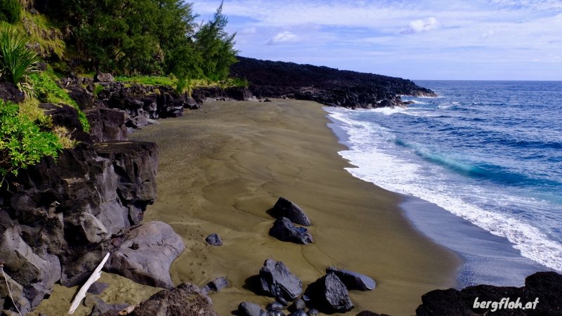 La randonnée débute à Saint-Philippe au plus près de la mer, cachée par des centaines de vacoas. On peut visiter, avant de partir, le monument du Waren Astings ou l'embarcadère bétonné. Commencer l'exploration de la matinée par la recherche de bassins d'eau claire cachés parmi les énormes roches de la Marine (Photo 1). Par beau temps, la baignade peut y être très agréable. Marcher une centaine de mètres sur la route jusqu'à la paisible aire de repos (Photo 2). Rejoindre l'océan au plus près en traversant une petite étendue de vacoas. C'est parti pour de nombreuses heures à fouiner entre les rochers et falaises. Débuter par le platier de le Pointe de la Mare d'Arzule pour s'approcher des vagues, bassins et déchirures dans la roche. Quelques souffleurs se repèrent facilement à la vapeur sortant des trous (Photo 3). Guetter les bruits, parfois très forts, produits par les souffleurs secs. L'air comprimé en sous-sol, parfois à plus de 20 m des vagues, sort violemment en petites explosions procurant d'agréables courants d'air. On entend même rouler les galets dans des cavités qui n'apparaitront qu'après l'effondrement de la voûte sur laquelle on marche. Attention aux vagues qui peuvent être très hautes dans certaines criques étroites. Commencer à longer la côte entre vacoas, manioc marron et la mer. La marche s'effectue sur le gazon bord de mer. Il est préférable, si possible, de suivre les traces laissées par les passages afin d'en préserver un maximum (Photo 4). On remarque ça et là des prélèvements effectués pour sans doute tenter des cultures à la maison. Jusqu'à la Porte, on foulera une dizaine de ces superbes zones verdoyantes (Photo 5). Quand l'herbe disparaît par endroits, la marche se fait entre les filaos ou les pieds de vacoas aux feuilles coupantes (Photo 6). Beaucoup plus rarement, il faudra suivre la trace des yeux à travers les blocs et les maniocs (Photo 7). De grands affaissements du sol imposeront par deux fois d'effectuer un détour vers le sentier officiel pour quelques dizaines de mètres (voir carte). La description de la partie maritime pourrait s'arrêter là puisqu'il suffit de suivre le littoral et de chercher vers la mer. C'est ainsi qu'on découvre quatre arches plus ou moins belles à la Petite Vache (Photo 8). Outre quelques anfractuosités conservant les détritus des pêcheurs, la falaise cache aussi quelques petites grottes ou entrées de tunnels de lave bouchées (Photo 9). La sente discrète se confond un moment avec le sentier du Tremblet mais on retrouve vite les falaises (Photo 10). Une seule arche repérée à la Grande Vache mais de beaux bassins d'eau claire. La descente au plus près de la mer s'effectue sur de gros blocs coupants (Photo 11). La mer, parfois forte, a découpé le basalte et se précipite bruyamment dans les fissures (Photo 12). Poursuivre, toujours bercé par le bruit de ces vagues qui lancent parfois l'écume jusqu'à 15 m de haut (Photo 13). Tout comme la Marine de Saint-Philippe, le Quai d'Henri Dalleau comporte bassins et fissures qu'on peut visiter sur toute la surface du platier (Photo 14). C'est en quittant la visite qu'on rencontre un immense tunnel de lave qui s'effondre petit à petit (Photo 15). Le gazon bord de mer est de plus en plus présent, à peine marqué par le sentier des pêcheurs. De belles flaques conservent l'eau de pluie qui doit s'évaporer rapidement avec le soleil et le vent (Photo 16). Le passage engazonné est parfois étroit entre vacoas et falaise mais le cheminement est rapide (Photo 18). La très haute falaise de l'Enconhière s'effrite vague après vague mais le passage est encore assez large pour marcher sans danger (Photo 19). Plus loin, les caps, pointes et quais disparaissent et la marche peut s'accélérer (Photo 20). Seul le Quai de Gros Poisson est plus significatif. A noter un beau souffleur très actif à la hauteur du lotissement des Sables Blancs (Photo 22). Plus de trois heures après le départ, on aperçoit une pointe rocheuse percée d'un trou laissant penser à une nouvelle arche. Quand on domine ce nouveau platier, on y remarque des trous, fissures et de magnifiques stalagmites de plusieurs mètres, encore intactes de la dernière éruption datant certainement de plusieurs siècles (Photo 24). Le spectacle ne fait que commencer. Du haut de la falaise, on remarque des trouées dans le basalte où la mer s'engouffre avec force éclaboussures (Photo 25). Les lourdes plaques, fissurées, constamment attaquées par l'océan, disparaîtront au fil du temps (Photo 26). On se régale ainsi du spectacle offert par quatre de ces gouffres et arches. Aucun passage naturel ne permet de s'approcher de ces curiosités. Il faut, pour les atteindre, se munir de longues cordes, s'éloignant ainsi du domaine de la randonnée (Photo 27). En aucun cas Randopitons ne pourra être tenu pour responsable d'un accident survenu en tentant de rejoindre le platier fissuré. A partir de la Porte, le sentier du Tremblet s'approche au plus près des falaises et l'exploration peut prendre fin ici. Marcher 100 m vers le nord puis retrouver le sentier officiel qu'on emprunte vers la gauche pour rejoindre Saint-Philippe en moins d'une heure sur un sol humide, pierreux, boueux, glissant d'un sentier ombragé, bordé de goyaviers, fougères et vacoas (Photo 28).