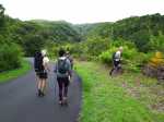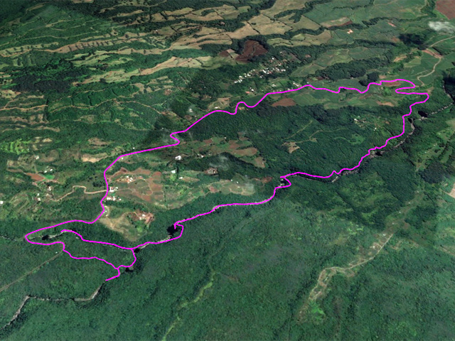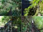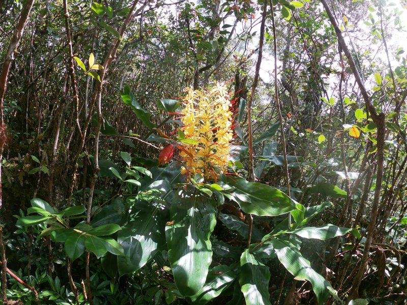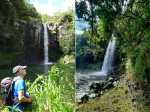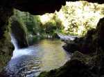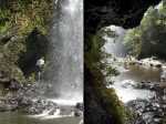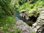 La randonnée débute en bordure des champs de canne à sucre, 1600 mètres après le parking du Bassin Bœuf. Emprunter la piste dans le virage, tourner à gauche après la ravine invisible, trouver sur la gauche le sentier qui débute dans la canne. On se retrouve sur le sentier sous les goyaviers en direction de la Grande Cascade. La marche est facile quoique glissante sur la terre ou les racines (Photo 1). Il fait presque nuit tant les goyaviers et jamrosats sont nombreux. Sur la gauche partent régulièrement des sentes en direction des cascades que l'on entend couler. Attention, il y a souvent une sente rejoignant le bassin, l'autre le haut de la chute. Si on a le temps, les quatre premières valent amplement le déplacement. On laisse ainsi la haute Grande Cascade, la courte chute du Bassin de la Ravine Creuse, la double cascade du Bassin Carrosse et son échelle verticale et la triple du Bassin Pilon (Photo 2). Le bassin Pilon se contourne par une série d'échelles verticales et portions bien sécurisées mais qui peuvent impressionner les acrophobes. Laisser la prise d'eau et suivre longuement un ancien aqueduc creusé dans le sol. On s'approche ensuite au plus près de la rivière pour débuter le hors sentier qui écarte les marcheurs peu habitués à cet exercice et qui préfèreront faire demi-tour car le relief ne permettra jamais l'installation d'un sentier comme en aval. Chercher le meilleur passage pour s'approcher du Bassin Jacob en sautant de roche en roche ou en se mouillant les pieds (Photo 3). L'endroit est sauvage, rocheux, moussu et une courte cascade alimente un long bassin (Photo 4). Une grotte en rive droite s'atteint aisément si le niveau de l'eau est bas (Photo 5). Pour continuer, repérer en aval, près de quelques rochers, le départ d'un passage qui permet d'escalader le rempart en rive droite (Photo 6). Escalade est le mot qui convient pour définir cette montée d'une trentaine de mètres où les mains sont aussi utiles que les pieds. La descente est du même acabit où la position assise est souvent la plus pratique (Photo 7). On se retrouve très vite près de la rivière au fond très rocheux (Photo 8). La remontée alterne passages dans l'eau avec parfois des hauteurs approchant le mètre (Photo 9). Il est aussi possible de sauter de roche en roche si elles sont sèches (Photo 10). Heureusement, on découvre souvent de longs couloirs ombragés sur une des rives où la marche est beaucoup plus rapide (Photo 11). Après 30 minutes de cette remontée sportive, on parvient à un immense bassin et à sa haute cascade, très élégante (Photo 12). Le bassin se prête idéalement à la baignade, ce qui permet d'atteindre le pied de la chute (Photo 13). Comme pour la précédente, chercher en rive droite la trace qui permettra de remonter le rempart et redescendre en amont de la chute en traversant à nouveau des goyaviers si serrés qu'ils accrochent le sac (Photo 14). On retrouve le même type de progression et il faut à nouveau une demi-heure pour atteindre le confluent de la Rivière Sainte-Suzanne et du Bras Laurent, reconnaissable à son grand bassin (Photo 15). Contourner le bassin par sa rive gauche puis poursuivre la remontée de la Rivière Sainte-Suzanne qui a perdu entre temps la moitié de son débit. De longues parties peuvent s'effectuer par la rive en sous-bois avec ou non de l'eau pour rincer les chaussures (Photo 16). Si l'on regarde la carte, on se retrouve au fond de la vallée située dans un coude de la route. Une nouvelle chute barre le passage (Photo 17). Si le bassin est modeste, les abords méritent une longue halte. On y découvre ainsi de belles curiosités géologiques comme ces deux sources ferrugineuses qui laissent couler une eau trouble (Photo 18). La grotte située au pied se rejoint sur sol glissant constamment arrosé par les éclaboussures (Photo 19). Celle de la falaise est beaucoup plus accessible (Photo 20). La halte se justifie amplement pour manger son casse-croûte faute de pouvoir se baigner. Faire demi-tour en marchant dans le sens du courant qui peut être fort à certaines périodes comme en témoignent les traces laissées sur les arbres (Photo 21). Une fois parvenu au bassin du confluent, chercher le début du passage qui permet de rejoindre la rive gauche du Bras Laurent. Le plus facile consiste à regarder au plus près du bassin sous les grandes branches de jamrosats (Photo 22). A part un court raidillon inévitable, la marche est assez facile jusqu'à une nouvelle cascade. L'immense bassin est alimenté par la cascade tombant d'un rocher équipé de tuyaux laissant penser à un captage (Photo 23). L'échappatoire ne saute pas à l'œil immédiatement. Emprunter l'étroite ravine en rive gauche qui grimpe fortement dans le sous-bois. Les mains sont indispensables et la montée s'effectue rapidement (Photo 24). Attention aux pierres qui peuvent chuter sur le marcheur en-dessous ! La sente discrète redescend et rencontre un sentier beaucoup plus fréquenté. Il est alors possible de partir à droite en direction de la route. En descendant vers la rivière, on atteint les captages de l'eau aperçus depuis le bassin (Photo 25). Un bassin assez profond barre le bras. L'eau monte au-dessus de la ceinture si on veut le traverser. La remontée vers l'amont ressemble à celle que l'on connaît depuis le début, dans l'eau et les cailloux (Photo 26). Si on remonte encore, on sera certainement bloqué par un autre cassé et sa cascade. Reprendre donc le sentier emprunté dans la descente puis remonter vers la route dans les goyaviers qu'on n'aura jamais quittés depuis le matin (Photo 27). A la route, partir sur la droite pour une longue descente de 3,3 km (Photo 28). On aperçoit à l'horizon de nouvelles cascades à réserver pour une nouvelle sortie sportive. Plus loin, on traverse les champs de canne et une quantité considérable de canneliers qui se remarquent de loin à la couleur de leurs feuilles. De lace