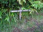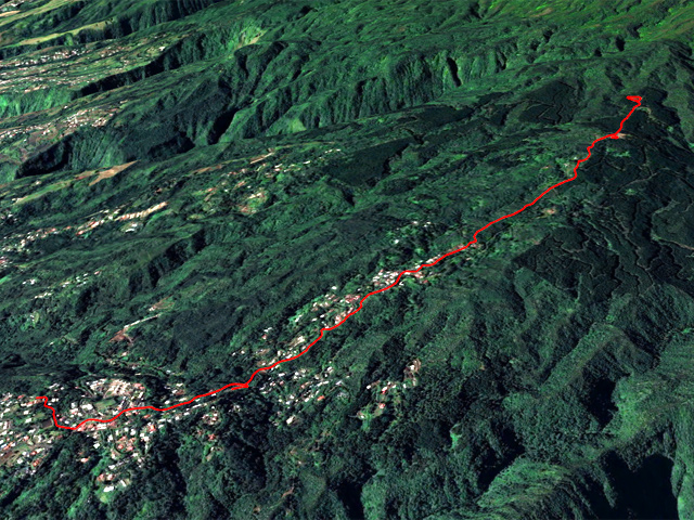 La randonnée débute symboliquement à la fin du sentier Mercure en provenance de la Providence. Rejoindre par l'Allée Félicien Vincent la petite église située tout près (Photo 1) ou stationner devant si l'on vient en véhicule jusqu'au Brûlé. Entamer la montée par la route, inévitable, sur un court tronçon d'un kilomètre. La verdure est omniprésente et on voit assez peu d'habitations de ce calme village d'altitude (Photo 2). Effectuer ou non un écart d'une trentaine de mètres pour atteindre le minuscule cimetière paysager très fleuri ou chercher l'erreur de date sur le panneau explicatif situé à l'entrée (Photo 3). Reprendre la route bordée de bambous pour atteindre le premier raccourci, très agréable allée en escaliers bétonnés également à l'ombre de grosses touffes de bambous (Photo 5). A partir de ce premier raccourci, les autres s'enchaînent sans avoir à les chercher, d'abord sur la droite jusqu'au dernier qu'on trouvera à gauche de la route. Les larges passages sont toujours propres (Photo 6). En se retournant par endroits, on peut voir l'océan au loin ou l'église du village qui dépasse de la végétation (Photo 7). Plus il va et plus ces raccourcis montent fortement sur un sol glissant (Photo 9). On retrouve de nouvelles touffes de bambous pour une marche garantie à l'ombre (Photo 10). Le raidillon le plus pentu se termine près d'une antenne relais. On est obligé de reprendre la route sur 100 mètres avant de se préparer à tourner à gauche. D'anciens panneaux de direction vieillissent lentement avant d'être probablement ôtés dans les années à venir (Photo 12). On repère très vite un nouveau panneau sur la gauche et un sentier qui débute dans le talus (Photo 13). Les premières dizaines de mètres sont un peu envahies de longoses et de goyaviers mais on passe sans problème en se penchant un peu (Photo 14). Il devient très vite beaucoup plus propre puis s'éloigne lentement des habitations. On est à 1000 m et on distingue très bien le Colorado de l'autre côté de la Rivière Saint-Denis (Photo 15). C'en est fini de la route qu'on ne verra plus avant la dernière centaine de mètres au départ du sentier de la Roche Ecrite. Le sentier passe entre des clôtures de propriétés (Photo 16), des bambous qu'on retrouve souvent (Photo 17), d'inévitables longoses dans les goyaviers (Photo 18), ou d'agréables portions dans les bois de couleurs (Photo 19). On rencontre même une piste bétonnée constituée de deux bandes de roulement entre vergers et cryptomerias (Photo 20). Comme toujours, les racines encombrent le sentier et retiennent l'eau et la boue (Photo 21). Après avoir longé les derniers vergers, on arrive assez rapidement à l'aire de repos de Mamode Camp (Photo 24). A la fin de la pause sous un des nombreux kiosques, poursuivre plein nord sur la route (Photo 26). On arrive au départ du sentier de la Roche Ecrite qu'on peut rejoindre en plus de trois heures (Photo 27). On peut également stationner ici pour le casse-croûte avant de décider de la suite du parcours. Pour monter à la Roche Ecrite, il faut avoir quitté le Brûlé très tôt et prévu tout le nécessaire dans le sac à dos. La trace ci-dessous prévoit un retour à l'aire la plus vaste d'où il est possible d'effectuer le tour de l'ancien parcours sportif. Rien de plus facile aussi que de rejoindre le Morne Saint-François par une longue descente.