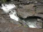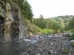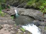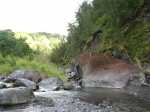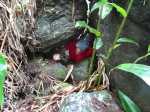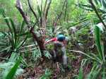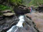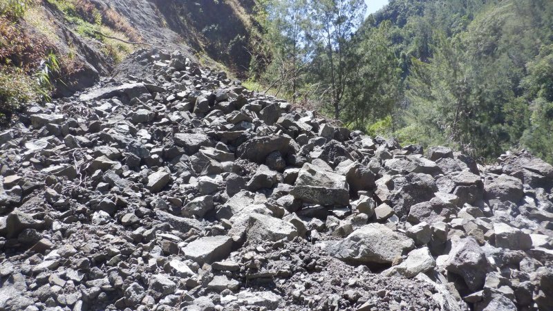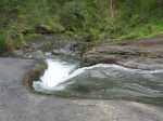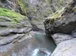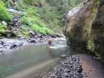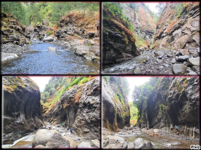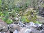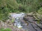 La randonnée aquatique débute au pont enjambant la Rivière des Fleurs Jaunes entre la Mare à Vieille Place et Grand Îlet. Rejoindre la rive en suivant le petit sentier en amont du pont. La partie amont de la rivière est beaucoup plus facile à remonter que celle qu'on emprunte car les plaques de basalte y sont plus nombreuses (Photo 1). Passer sous le pont et entamer ces 4000 mètres le long de la rivière. Comme toujours, pas de description sur la manière d'y parvenir car chacun se fraye un chemin en fonction de ses préférences ou de ses habitudes. Il faudra de toute façon marcher dans l'eau, arpenter les rives de galets, de plaques basaltiques ou escalader pour contourner des canyons si l'on veut éviter de nager. Après 100 mètres, ne pas manquer la partie plate en rive gauche pour couper un long méandre. Après un bon quart d'heure de marche, on arrive à la Ravine à Jacquot. Peut-être est-ce la grosse roche située à la fin du torrent qui se nomme ainsi (Photo 2) ? Plus bas, la vallée, encore large jusque là, va en se rétrécissant et les premières hautes falaises apparaissent (Photo 3). On ne les quittera plus jusqu'au pied du Bémassoune. La rivière des Fleurs Jaunes est un torrent pérenne et fougueux qui nécessite parfois un peu d'attention pour le traverser (Photo 4). Heureusement, des plaques de basalte permettent de marcher plus rapidement par endroits sans risque de trébucher sur les gros galets (Photo 5). On passe bientôt sous la passerelle au pied de la Pente Carozin. A tout moment, de fines cascades, des pisse-en-l'air ou des sources coulent des falaises bordant la rivière (Photo 6). La descente comporte très peu de pièges même sans être habitué à ces randonnées aquatiques. Après une heure de marche, on rencontre une petite touffe de bananiers et un camp braco permanent situé au tout début du sentier acrobatique remontant à Bé Cabot (Photo 7). Très vite, on se retrouve près d'un canyon où le seul moyen de passer serait de nager sur quelques mètres. Repérer donc le grand talus en rive gauche. Il débute par de grosses roches qu'il faut escalader avant de franchir un petit col entre les chosas (Photo 8). De ce petit col, on a une belle vue sur l'aval de la rivière qui coule sur de larges plaques basaltiques (Photo 9). Une fois au pied du talus, on peut étudier plus facilement le canyon et les bassins barrant le passage (Photo 10). Poursuivre vers l'aval le long de la rivière toujours aussi fougueuse (Photo 11). La suite de la descente s'effectue le long de magnifiques petits canyons étroits mais surmontés de larges plaques permettant de les éviter (Photo 12). On domine toujours la rivière de quelques mètres où le seul danger provient des roches pouvant être glissantes (Photo 13 et 14). Le plus bel endroit de la journée, le confluent de la Ravine Bécabot et de la rivière Fleurs Jaunes, s'admire également du haut des rives (Photo 15). Trente mètres après, entreprendre la descente vers le lit de la rivière pour éviter d'escalader la falaise qui se présente. Plusieurs passages permettent d'y parvenir en se maintenant aux filaos. On se retrouve entre passages dans l'eau et marche sur galets comme au départ. Plus loin, c'est la Ravine Sèche qui termine sa course dans la rivière par quelques petites chutes (Photo 16). De jolies cascades en amont peuvent s'atteindre mais il vaut mieux les garder pour le retour. Quelques passages un peu techniques imposent de courtes acrobaties avant d'arriver à un gros rocher barrant le passage. La falaise en rive droite, le rocher en rive gauche et la forte pente qui l'entourent donnent l'impression qu'on ne passera pas. Trouver le boyau si étroit qu'il faut d'abord passer le sac à dos avant de se faufiler entre les roches (Photo 17). Ce passage pourrait paraître ludique pour certains randonneurs beaucoup moins pour d'autres ! Une fois l'écueil passé, la descente se poursuit, la vallée s'élargit et les canyons disparaissent pour un temps (Photo 18). La rivière est même plus calme et peu profonde (Photo 19). A l'approche du grand méandre qu'on repère sur la carte, on sait que l'Îlet Bémassoune est situé 150 mètres au-dessus de nos têtes mais de rapides coups d'œil ont vite fait d'éliminer les possibilités d'y monter (Photo 20). Lors d'un cheminement en rive droite, on retrouve des traces de camps bracos, proches du sentier qui remonte à l'îlet du Butor près de la Mare à Vieille Place. Ce sentier, encore bien visible se termine hélas en propriété privée après 400 mètres de montée abrupte et très sportive. Ne pas le tenter. Depuis le départ, on peut observer un peu partout des coulées calcaires chaque fois qu'une source dégouline des falaises (Photo 21). Repérer, en rive gauche, le talus surmontant une plaque basaltique (Photo 22). Difficile d'imaginer que le départ du sentier pour l'îlet Bémassoune se trouve ici ! Escalader ce talus et dénicher, à travers les chocas et filaos, la trace qui débute presque à plat sur une dizaine de mètres. Très vite, c'est penché vers l'avant et les mains au sol ou autour des goyaviers que commence la rude ascension (Photo 23). Revoir le profil ci-dessous avant de se lancer dans cette ascension. La pente est tout d'abord rectiligne et quasi verticale au milieu des jouvences et goyaviers. On peut perdre ce sentier à mi-parcours lorsqu'il oblique à gauche pour traverser une zone couverte de jouvences mais on le retrouve de l'autre côté de ce qui doit être une ravine en cas de fortes averses. Plus haut, le sentier monte un peu moins fort à travers les fougères un peu dénudées par les rares visiteurs du site (Photo 24). Même lorsque les goyaviers sont serrés et que les fougères ou chocas encombrent le passage, celui-ci reste toujours visible malgré les décennies d'inutilisation (Photo 25). Après 130 mètres de montée sportive, on parvient au plateau où il est possible de marcher entre les goyaviers