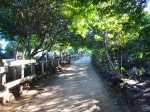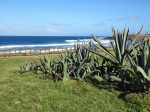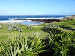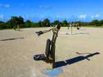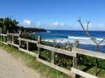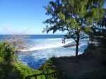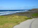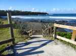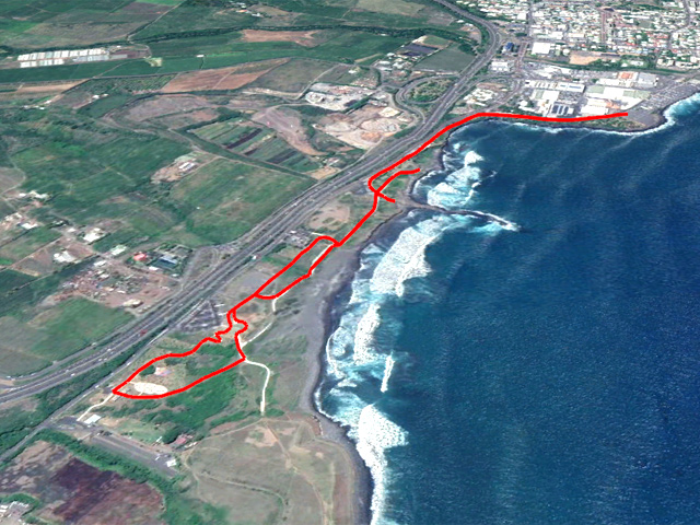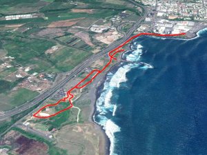 La boucle débute à la fin du parking du grand supermarché situé près de l'océan à la Ravine Blanche. Le départ est facile à repérer près d'un grand panneau traitant des balades à vélo de la zone (Photo 1). Une large piste plate sous les arbres part en direction de l'océan en longeant la falaise (Photo 2). Le sol est sableux mais le passage s'effectue sans encombre (Photo 3). On s'approche du Chemin de la Balance et l'allée tourne à gauche. On aperçoit les vagues et la Pointe du Diable dans les trouées (Photo 4). Beaucoup d'arbustes fleuris égaient la balade. Des panneaux pédagogiques demandent quelques minutes d'arrêt pour prendre connaissance du contenu (Photo 5). Plus loin, quatre oratoires et petites chapelles bordent le passage pour l’éventuelle prière (Photo 6). La Pointe du Diable est désormais bien visible, tout comme les pêcheurs qui l'occupent ou les vagues qui viennent s'y écraser (Photo 7). On passe entre la route et les vagues en profitant de larges panoramas sur le Piton des Neiges et tous les principaux sommets de l'île (Photo 9). Le paysage devient de plus en plus marin et le bruit des vagues se jetant contre la pointe encourage à s'en approcher (Photo 10). La piste descend un peu avant un croisement. Poursuivre tout droit vers la Pointe du Diable. La piste est courte et se termine au début de la pointe. On voit très bien les pêcheurs lancer leur ligne (Photo 11). Sur la droite, à l'arrière de la minuscule plage de galets, la falaise de pouzzolane peut évoquer, avec de l’imagination, la forme d'un visage de diable la bouche ouverte (Photo 12). Revenir au croisement et partir cette fois vers la Petite Baie sur une piste sableuse entre les aloès (Photo 13). Elle se termine à l'escalier donnant sur la plage rocheuse de la Petite Baie (Photo 14). Revenir et prendre la direction de l'aéroport dont on aperçoit le fossé de fin de piste à l'horizon, près du Cap Rond. On s'approche au plus près de la plage de sable gris et des vagues mais aucune allée n'y mène (Photo 16). Poursuivre en direction des parkings. La piste, large et de bonne qualité, est bétonnée. En partant à gauche, on se retrouve dans le sable poussé par le vent qui empêche de rouler. En partant sur la droite, on arrive plus loin à un monument particulier comportant un badamier en son centre (Photo 17). Contourner par la droite et rouler en direction des bâtiments que l'on aperçoit au loin. Passer un lacet de la piste en légère descente (Photo 18). Laisser à gauche un jeu d'escalade sur filets pour les enfants (Photo 19). En arrivant aux bâtiments des toilettes, passer entre les deux sur l'allée bétonnée (Photo 20). Sur la gauche, une aire comportant quelques équipements pour augmenter la musculature accueille les sportifs en fin de footing (Photo 21). Revenir vers la mer en direction de dunes de sable recouvertes de patates à Durand (Photo 22). Bifurquer à gauche aux dunes car l'on revient vers le sable bloquant la route. De plus, la piste se termine à l'escalier remontant vers le fossé. Une pente très faible rejoint le rond point du badamier. On pourrait reprendre le même itinéraire pour revenir au point de départ mais une autre piste débute à gauche. Elle est rectiligne et chemine à quelques mètres de la première qu'on devine sur la droite (Photo 24). Des points d'eau sont installés un peu partout le long du parcours. On franchit une minuscule ravine et de grosses canalisations dans les taros (Photo 25). La fin du parcours emprunte le chemin pris à l'aller avec de nouveaux panoramas sur les sommets (Photo 26) ou de beaux points de vue sur la mer (Photo 27). Profiter de l'ombre dans les derniers 200 mètres pour se reposer avant de retrouver le parking (Photo 28).