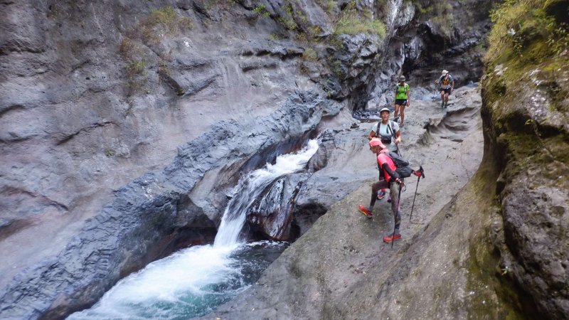 Nous avions fait en 2016 la remontée de la rivière des pluies jusqu’à la ravine du Grand Bénoune, ce sera donc un grand bonheur d’y retourner aujourd’hui, afin de s’immerger un peu plus profondément dans l’histoire de ces lieux, presque oublié qui ont forgé l’histoire de l’île. Notamment avec cette traversée de l’ilet Quinquina lontan, encore habité et cultivé dans les années 50.