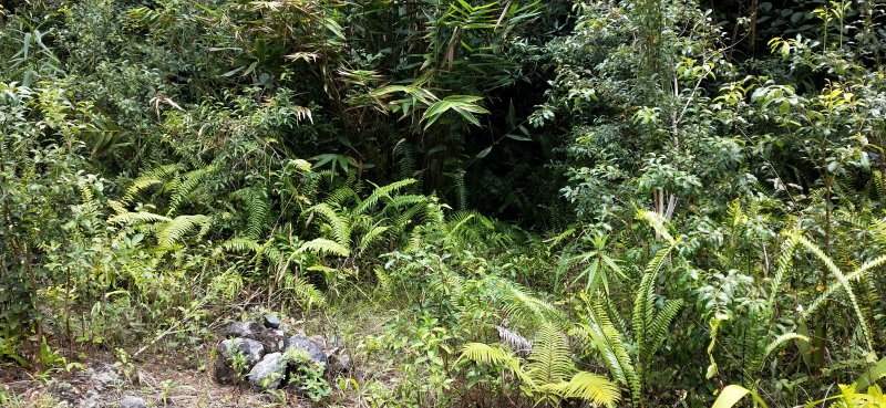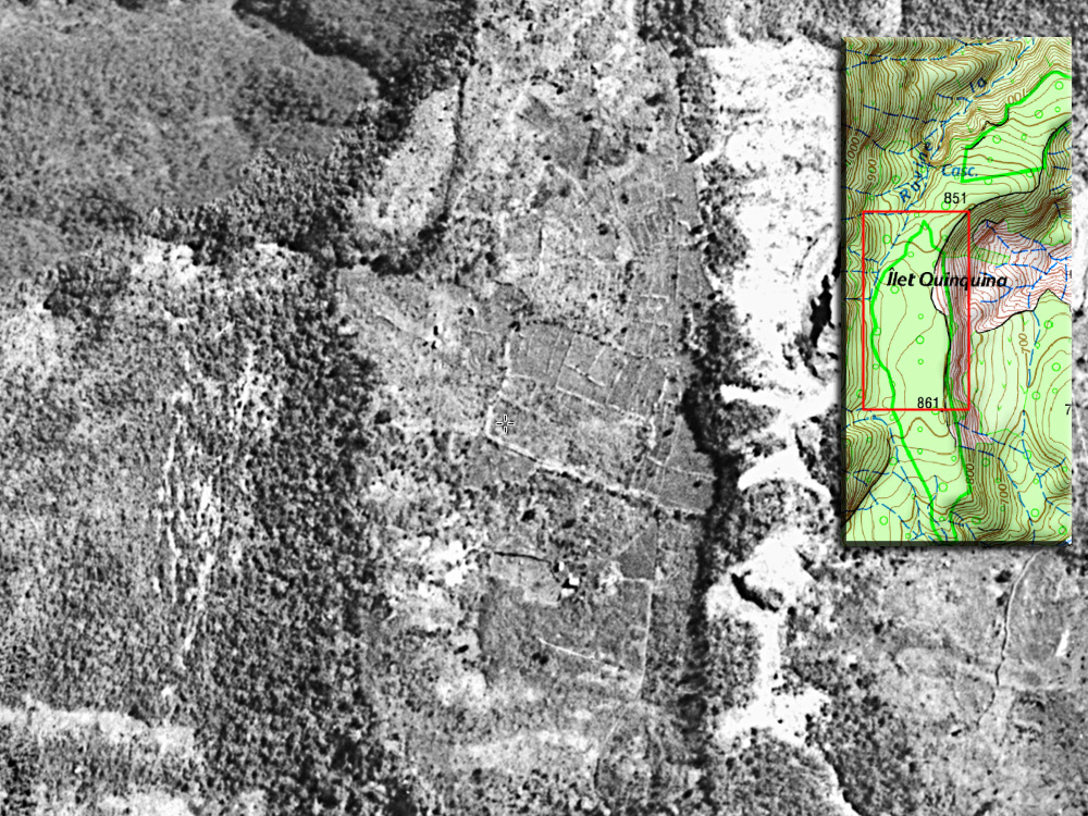Lorsque l'on arpente le seul sentier encore praticable traversant le plateau, on est frustré d'avoir étudié cette photo de 1950 avant de partir. La photo fait clairement ressortir les plantations, murets de délimitation des parcelles sur les 10 hectares exploités. Deux groupes d'habitations avec deux toitures laissent penser que deux familles se partageaient l'exploitation des champs situés entre 750 et 850 m d'altitude. Combien de citronniers, d'orangers et de restes de plantations de curcuma pourrait-on retrouver si le terrain était défriché ?