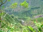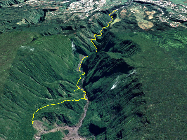 La randonnée débute dans le long village d'Îlet Quinquina où de nombreuses places de stationnement s'étalent le long de la rivière. On peut commencer à la cascade puis rejoindre le premier gué par le sentier en rive gauche. Cette trace propose de suivre la piste avant de franchir le premier gué les pieds au sec. Cinq minutes après le gué, on emprunte déjà le premier sentier de contournement en rive droite. Il se finit à une piste et a permis d'éviter le lit de la rivière. La piste est bordée de quelques cultures de tarosColocasia esculenta. Songes à la Réunion. Toute la plante est comestible à l'exception du fruit. baignant dans l'eau détournée à cet usage et surtout de centaines de bananiers (Photo 1). Ces raccourcis seront nombreux sur une très grande partie de la remontée. Le plus difficile sera de les repérer tous. Certains s'éloignent de la rivière qu'on entend toujours couler. D'autres s'effectuent sur des petits plateaux à quelques dizaines de mètres de l'eau. Enfin, quand il n'y en a pas, on longe la rivière au plus près lorsqu'il ne faut pas la traverser à gué les pieds dans l'eau (Photo 2). Les zones assez plates abritant un manguier ou quelques bananiers cachent souvent une case en plus ou moins bon état (Photo 3). La plus typique est certainement celle rencontrée en rive gauche 20 minutes après le début de la marche. C'est un mur de pierres sèches couvert de quelques tôles comme on pouvait en trouver des dizaines sur l'île il y a moins de 100 ans ; la plupart d'entre elles étaient recouvertes de vétiver à l'époque (Photo 4). La marche est toujours facile sur des sentiers verdoyants donnant souvent sur la pyramide du Piton Tatane (Photo 5). Après 90 minutes de montée, on arrive à une case sur la droite par un accès avec de hautes échelles. Elle est très proche d'une petite cascade qu'on rejoint par un sentier étroit longeant la falaise. Prendre quelques minutes pour apprécier le beau canyon qui domine la chute d'eau (Photo 6). Cette superbe gorge se remonte sans difficulté mais le parcours proposé emprunte le sentier qui les évite en cas de courant violent. il débute juste avant les mains courantes sécurisant le passage vers le canyon. Entamer une montée raide près d'un rocher dépassant des fougères (Photo 7). La montée est très sérieuse sur une bonne soixantaine de mètres puis le sentier se met à descendre calmement au milieu de fougères en direction de la rive gauche en amont des gorges (Photo 9). On évalue très bien la hauteur lorsque l'on profite des trouées dans la végétation pour admirer la vallée (Photo 8). Ce long détour au plus loin des berges amène au confluent de la Ravine la Nage. Un sentier en rive gauche, difficile à repérer près d'un rocher, grimpe en 5 minutes à un ancien îlet abandonné, habité il y a quelques décennies encore par deux sœurs. On reconnait la touche féminine aux nombreuses fleurs plantées le long du sentier avant d'arriver à une case encore en bon état proche d'un boucan sentant toujours la fumée (Photo 10). Poursuivre vers l'amont et prendre garde à tous les détails facilitant la recherche du sentier de l'îlet Quinquina. C'est tout d'abord une aire de repos installée sous les filaos d'un petit plateau dominant la rivière où l'on peut prendre des forces avant d'entamer la montée (Photo 11). Après la pause, marcher moins d'une centaine de mètres sous les filaos sur un sol très plat (Photo 12). Repérer la seule touffe importante de bambous balais de la zone ; le sentier et la grimpée débutent ici (Photo 13). Abandonner si l'on ne repère pas, moins de 10 mètres après les bambous, un muret de soutènement et une magnifique racine entourant un rocher (Photo 14). Une fois passés ces trois points de repère, il n'y a plus à réfléchir car le sentier, abandonné depuis un demi-siècle est encore bien marqué (Photo 15). On remarque des traces de passage de braconniers ou chasseurs de guêpes (Photo 16). S'il est facile à suivre, il n'en comporte pas moins des passages délicats où la terre et les pierres fuient sous la semelle, quand il ne borde pas des à-pics dangereux (Photo 17). Les mains sont indispensables sur une bonne partie de la montée (Photo 18). C'est penché vers l'avant que s'effectue la grimpée dépassant souvent les 45° (Photo 19). La forêt de bois de couleurs est encore préservée des goyaviers même si l'on en rencontre parfois (Photo 20). Durant 45 minutes on ne voit que les fesses du marcheur qui précède ou le crâne de celui qui suit (Photo 21). Le bord du rempart s'atteint par une dizaine de mètres très raides puis on parvient en une minute à un camp déjà tout prêt pour recevoir la bâche bleue en cas de pluie (Photo 22). Fini les bois de couleurs. On se retrouve sur le plateau qui était encore cultivé dans les années 50 (voir § ci-dessous), désormais envahi par les goyaviers (Photo 23). Des murets apparaissent un peu partout à l'emplacement des cultures de l'époque (Photo 24). Poursuivre vers le sud en longeant le sentier toujours visible (Photo 25). Il s'approche et domine la Ravine la Nage où l'on trouve le départ du sentier officiel repéré sur les cartes IGN des années 60 mais mais devenu depuis impraticable. Les jamrosats tentent tant bien que mal de résister à l'attaque des goyaviers (Photo 26). Puis le sentier s'éloigne de la ravine pour se diriger vers le Grand Eboulis. Du bord du rempart, on le domine ainsi que toute la vallée qu'on va bientôt rejoindre (Photo 28). Le retour vers l'Îlet Quinquina les Bas emprunte le même itinéraire à moins de délaisser les sentiers pour longer la rivière. Durant la traversée du plateau, tenter de repérer quelques signes prouvant la présence de l'homme au siècle précédent (Photo 27).