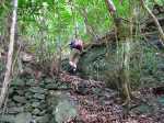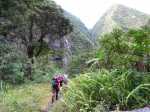 Cette randonnée se décompose en trois parties très différentes. Le debut, et donc aussi la fin, est une longue marche au fil de l’eau. Tantôt dans les hauteurs, tantôt dans les galets, avec des traversées que l’on apprécie particulièrement au retour quand les pieds ont chauffé. Ensuite, la vertigineuse montée/descente à l’îlet Quinquina les Hauts. Mazette! On est heureux d’atteindre le plateau, encore riche de goyaviers blancs et rouges en fruit en cette saison. Soulagement de courte durée, car même si on marche quasiment à plat, l’ancien sentier est peu visible, à peine une trace où les goyaviers/galaberts/longoses seraient moins denses. Heureusement que j’étais avec deux connaisseurs du lieu adeptes du maniement du coupe-coupe. Il ne subsiste que peu de traces d’utilisation régulière du plateau, si ce n’est des tas de pierres, qui, à regarder de près, sont ordonnées en murets. Je passe sur les bouteilles en verre laissées de ci de là. La concentration est de mise lors de la descente, qui s’effectue par moments sur les fesses, en ayant repéré par avance l’arbre, caillou ou racine qui stoppera la glissade. Très heureuse d’avoir effectué cette difficile randonnée avec des randonneurs chevronnés et prévenants; à surtout ne pas tenter solo.
