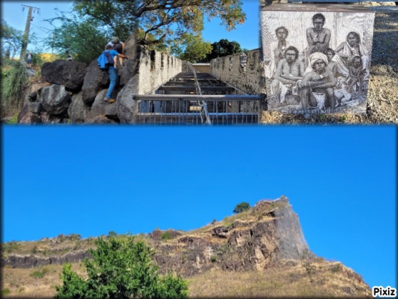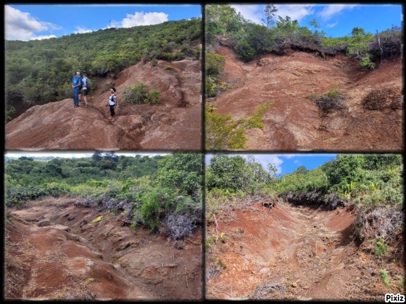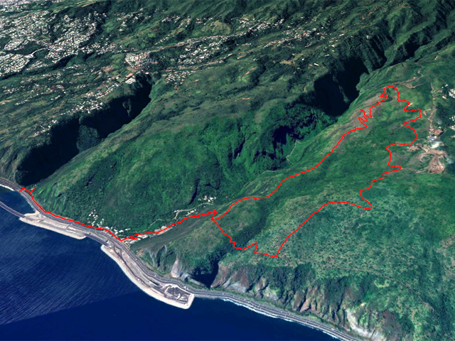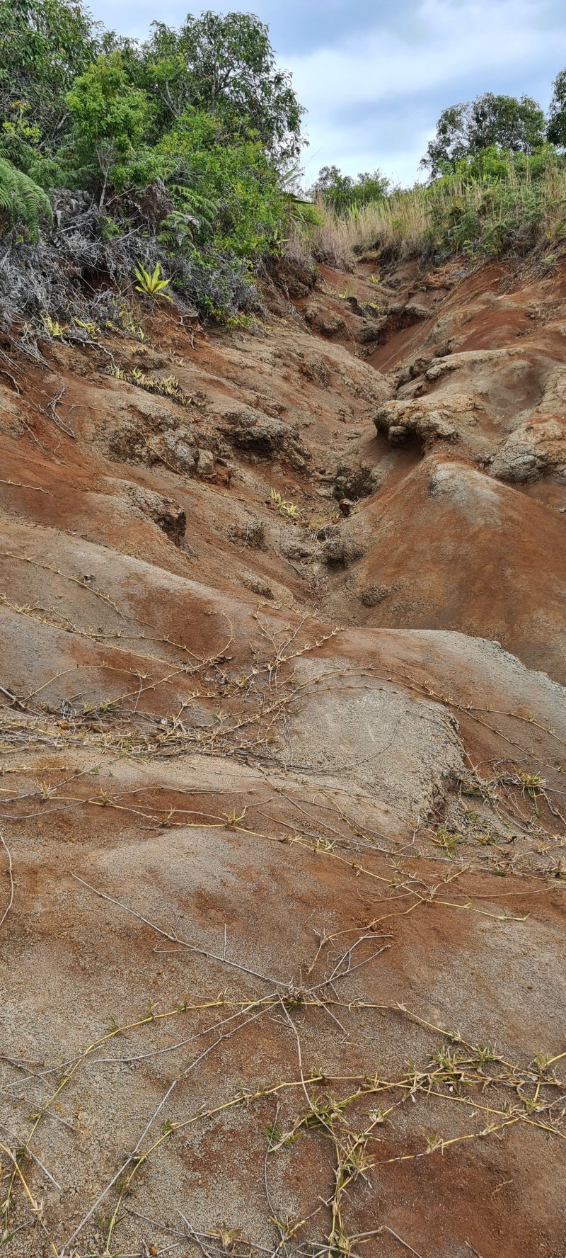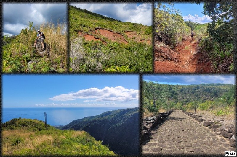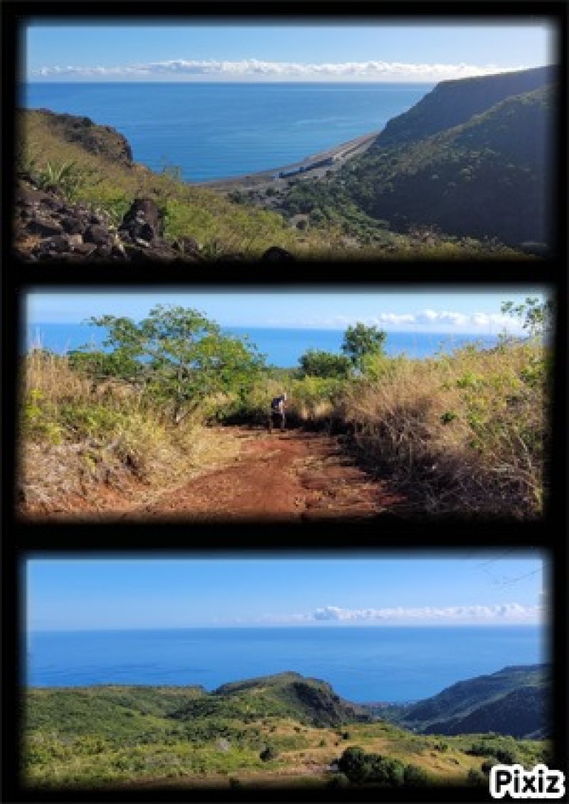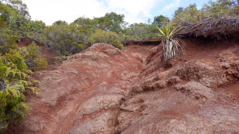 La randonnée débute à deux pas de la gare de la Grande Chaloupe. La première partie, facultative, emprunte la piste en terre longeant la falaise et la longue muraille de gabions empilés sur près de 10 mètres (Photo 1). La route est interdite en cas de fortes pluies ou d'alerte cyclonique. La falaise est impressionnante par endroits et certains blocs ont éventré les gabions, donnant ainsi une idée de la force d'une roche détachée du rempart. On parvient très vite au pont de chemin de fer et au tunnel de la Ravine à Jacques. Un sentier discret commence à droite. En le suivant sur 50 mètres, on s'approche du lazaret qu'on distingue à peine (Photo 2). Plus loin, près d'un "parc bef" où ruminent bœufs Moka et cabris, un sentier descend en rive droite en direction de la mer. De là, on a une vue originale et plongeante sur la Nouvelle Route du Littoral (Photo 3). Les pêcheurs traquent les poissons de roches entre les tétrapodes usés par les vagues. Après cette visite, reprendre le chemin de la Grande Chaloupe puis poursuivre vers le début du Chemin Crémont. Il débute sur la droite près de quelques cases par une assez forte pente qui donne très vite le ton (Photo 4). La végétation de cette colline, surtout constituée de basalte, est pauvre hormis quelques grands tamarins qui bordent le chemin empierré (Photo 5). Les lacets sont courts et la pente forte par endroits. On pense alors aux bœufs ou chevaux qui l'empruntaient au 19ème siècle pour tirer les charrettes. Certaines portions sont défoncées et aucune pierre plate n'est à sa place. Il faut alors lever le pied pour les enjamber ou trouver le meilleur passage (Photo 6). On s'élève rapidement. Les paysages s'élargissent vers la mer et de l'autre côté de la ravine de la Grande Chaloupe (Photo 7). La piste est parfois très étroite en raison des éboulis (Photo 8) ou large et encore très bien pavée (Photo 9). Il faut près de 25 minutes pour atteindre le belvédère donnant sur la Grande Chaloupe (Photo 10). "L'autoroute" est finie et il va falloir poursuivre sur un sentier étroit, non marqué sur la carte, qui longe le rempart de la Ravine de la Grande Chaloupe. Une fois repéré, juste en face du belvédère, le suivre ne pose jamais d'hésitation. Les hautes herbes, les chocas, faux poivriers, avocatiers marrons constituent l'essentiel de la végétation (Photo 11). On parvient en moins de 10 minutes au premier réservoir DFCI entouré de planches. Le sentier s'élargit. On marche sans grands efforts entre les herbes sur une pente faible (Photo 12). Plus on monte et plus le passage est visible, sans doute emprunté plus souvent par les 4x4. Il s'éloigne un peu du rempart qu'on ne perd pas de vue (Photo 13). Plus haut, le sentier fait place à une piste en terre tout en s'approchant d'une seconde réserve d'eau (Photo 14). La végétation, touffue mais assez rase, ne cache aucun panorama en direction de la mer (Photo 15). Dans un lacet, un sentier emprunte le tracé d'une très ancienne piste et se dirige vers le rempart, occupé par des pylônes électriques. Ce n'est pas une grande aventure que de le suivre pour admirer le fond de la vallée (Photo 16). La piste se poursuit en direction de la RD41. Les raccourcis de la carte ne sont pas toujours visibles sur le terrain. Inversement, des pistes n'apparaissent pas sur la carte. Ne pas manquer, à l'altitude 560 m, le sentier qui débute dans un grand lacet de la piste (Photo 17). Il chemine en faible descente entre les fougères, les chocas et quelques rares bois de couleurs (Photo 18). On rencontre, en bordure de sentier, de plus en plus de petites zones occupées par des terres rouges (Photo 19). L'une d 'entre elles, plus importante, impose une halte photo si le soleil éclaire la terre pour en faire ressortir les couleurs chaudes (Photo 20). Tout comme à Fleurié à quelques kilomètres de là, la promenade est agréable tant par la pente faible que par ces traversées de terres (Photo 21). Il est alors préférable de suivre le GPS pour ne pas quitter cet itinéraire naturellement balisé de orange, jaune ou rouge car les croisements sont nombreux (Photo 22). On frôle ainsi les installations d'entraînement de motocross avant de poursuivre vers le nord sur un sentier étroit qui descend rejoindre la Chemin des Anglais à travers les faux poivriers de plus en plus nombreux (Photo 23). Plus bas, le sentier longe et emprunte une petite ravine où il n'est pas rare de rencontrer quelques hautes marches (Photo 24). Après une heure de descente assez facile, le sentier rencontre la piste pavée surchauffée (Photo 25). Partir à droite et longer ces plaques basaltiques avec une pensée pour les esclaves en charge de les casser et de les aligner sous le soleil du nord. Descendre pour franchir la Ravine de la Petite Chaloupe et remonter, parfois fortement, vers le début de la boucle (Photo 26). Cette pente est la dernière difficulté de la randonnée. On repasse devant le belvédère avant d'entamer la descente sur les portions empruntées en montée 4 heures auparavant (Photo 27). La descente est beaucoup plus facile que la montée même lorsque les pierres sont disjointes (Photo 28). La jonction avec le parking est rapide. Ne pas manquer une visite au lazaret ruiné mais rénové abritant expositions et musée ou une balade près du cimetière et son énorme banian aux centaines de racines.