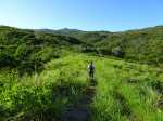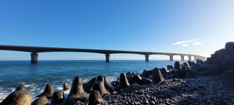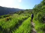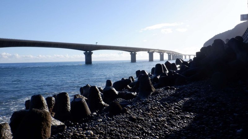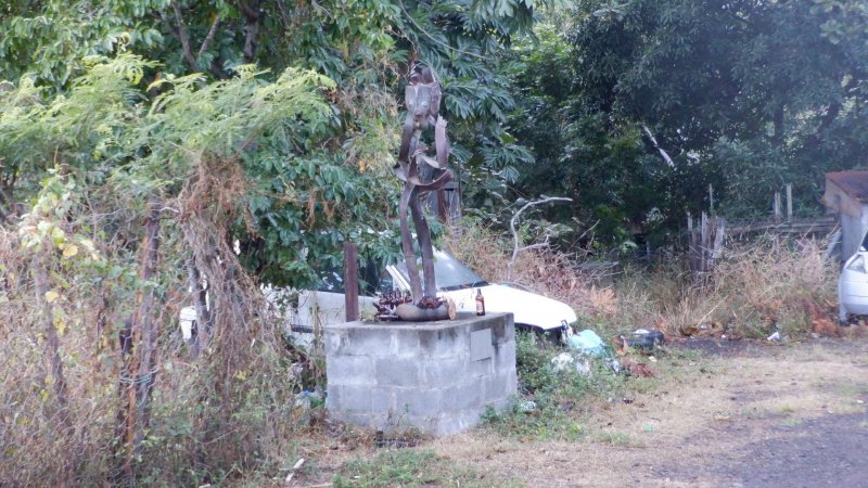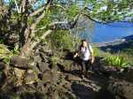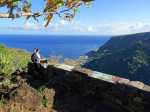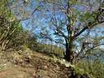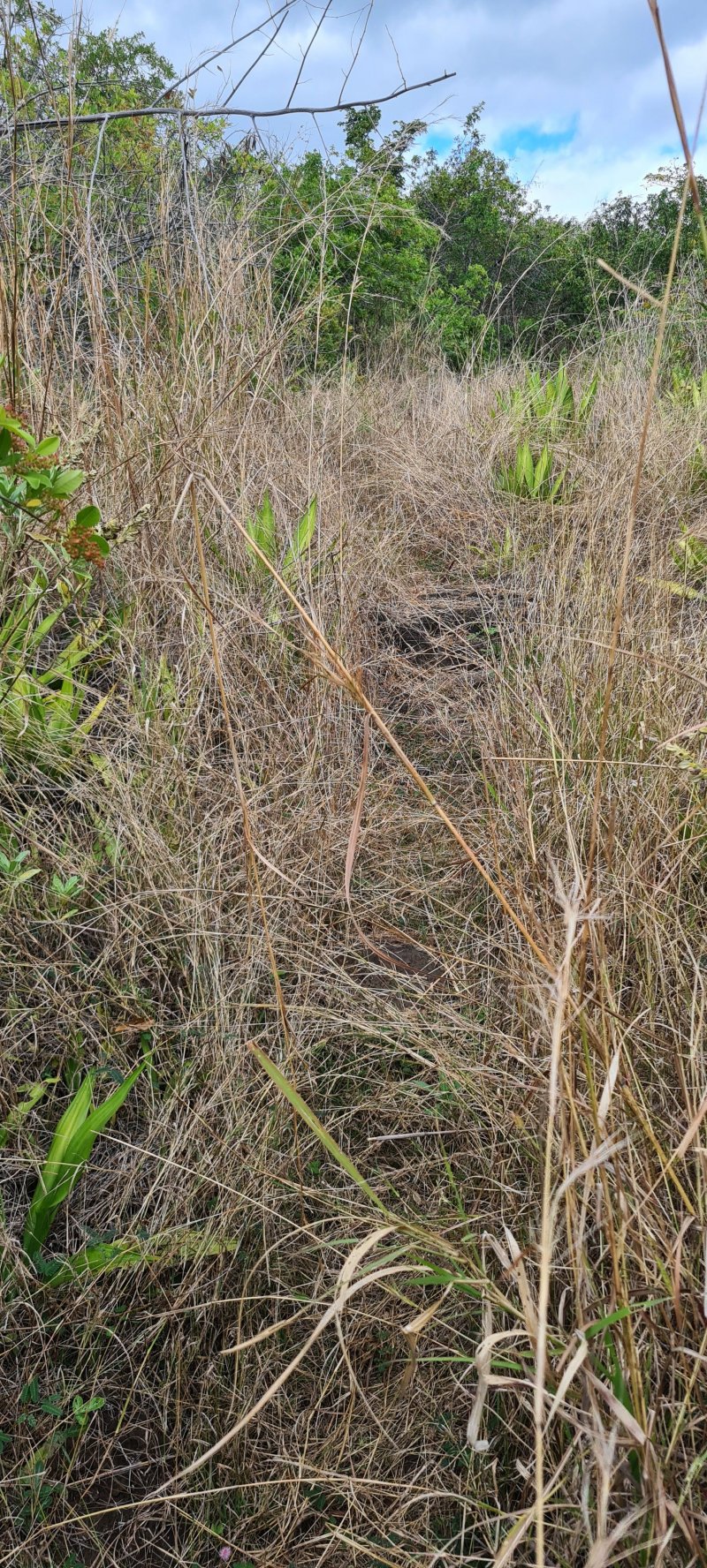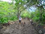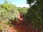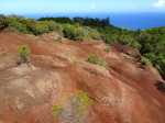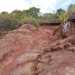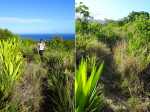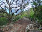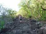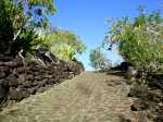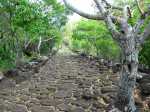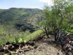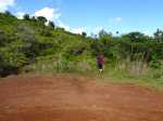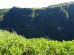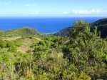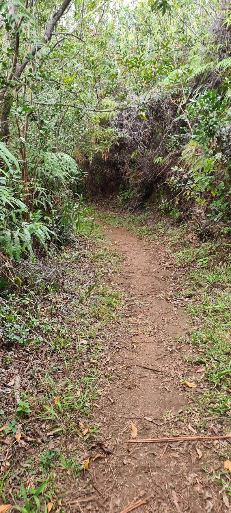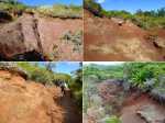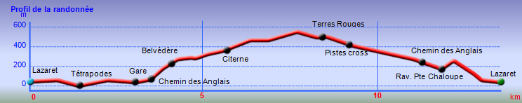 La randonnée débute à deux pas de la gare de la Grande Chaloupe. La première partie, facultative, emprunte la piste en terre longeant la falaise et la longue muraille de gabions empilés sur près de 10 mètres (Photo 1). La route est interdite en cas de fortes pluies ou d'alerte cyclonique. La falaise est impressionnante par endroits et certains blocs ont éventré les gabions, donnant ainsi une idée de la force d'une roche détachée du rempart. On parvient très vite au pont de chemin de fer et au tunnel de la Ravine à Jacques. Un sentier discret commence à droite. En le suivant sur 50 mètres, on s'approche du lazaret qu'on distingue à peine (Photo 2). Plus loin, près d'un "parc bef" où ruminent bœufs Moka et cabris, un sentier descend en rive droite en direction de la mer. De là, on a une vue originale et plongeante sur la Nouvelle Route du Littoral (Photo 3). Les pêcheurs traquent les poissons de roches entre les tétrapodes usés par les vagues. Après cette visite, reprendre le chemin de la Grande Chaloupe puis poursuivre vers le début du Chemin Crémont. Il débute sur la droite près de quelques cases par une assez forte pente qui donne très vite le ton (Photo 4). La végétation de cette colline, surtout constituée de basalte, est pauvre hormis quelques grands tamarins qui bordent le chemin empierré (Photo 5). Les lacets sont courts et la pente forte par endroits. On pense alors aux bœufs ou chevaux qui l'empruntaient au 19ème siècle pour tirer les charrettes. Certaines portions sont défoncées et aucune pierre plate n'est à sa place. Il faut alors lever le pied pour les enjamber ou trouver le meilleur passage (Photo 6). On s'élève rapidement. Les paysages s'élargissent vers la mer et de l'autre côté de la ravine de la Grande Chaloupe (Photo 7). La piste est parfois très étroite en raison des éboulis (Photo 8) ou large et encore très bien pavée (Photo 9). Il faut près de 25 minutes pour atteindre le belvédère donnant sur la Grande Chaloupe (Photo 10). "L'autoroute" est finie et il va falloir poursuivre sur un sentier étroit, non marqué sur la carte, qui longe le rempart de la Ravine de la Grande Chaloupe. Une fois repéré, juste en face du belvédère, le suivre ne pose jamais d'hésitation. Les hautes herbes, les chocas, faux poivriers, avocatiers marrons constituent l'essentiel de la végétation (Photo 11). On parvient en moins de 10 minutes au premier réservoir DFCI entouré de planches. Le sentier s'élargit. On marche sans grands efforts entre les herbes sur une pente faible (Photo 12). Plus on monte et plus le passage est visible, sans doute emprunté plus souvent par les 4x4. Il s'éloigne un peu du rempart qu'on ne perd pas de vue (Photo 13). Plus haut, le sentier fait place à une piste en terre tout en s'approchant d'une seconde réserve d'eau (Photo 14). La végétation, touffue mais assez rase, ne cache aucun panorama en direction de la mer (Photo 15). Dans un lacet, un sentier emprunte le tracé d'une très ancienne piste et se dirige vers le rempart, occupé par des pylônes électriques. Ce n'est pas une grande aventure que de le suivre pour admirer le fond de la vallée (Photo 16). La piste se poursuit en direction de la RD41. Les raccourcis de la carte ne sont pas toujours visibles sur le terrain. Inversement, des pistes n'apparaissent pas sur la carte. Ne pas manquer, à l'altitude 560 m, le sentier qui débute dans un grand lacet de la piste (Photo 17). Il chemine en faible descente entre les fougères, les chocas et quelques rares bois de couleurs (Photo 18). On rencontre, en bordure de sentier, de plus en plus de petites zones occupées par des terres rouges (Photo 19). L'une d 'entre elles, plus importante, impose une halte photo si le soleil éclaire la terre pour en faire ressortir les couleurs chaudes (Photo 20). Tout comme à Fleurié à quelques kilomètres de là, la promenade est agréable tant par la pente faible que par ces traversées de terres (Photo 21). Il est alors préférable de suivre le GPS pour ne pas quitter cet itinéraire naturellement balisé de orange, jaune ou rouge car les croisements sont nombreux (Photo 22). On frôle ainsi les installations d'entraînement de motocross avant de poursuivre vers le nord sur un sentier étroit qui descend rejoindre la Chemin des Anglais à travers les faux poivriers de plus en plus nombreux (Photo 23). Plus bas, le sentier longe et emprunte une petite ravine où il n'est pas rare de rencontrer quelques hautes marches (Photo 24). Après une heure de descente assez facile, le sentier rencontre la piste pavée surchauffée (Photo 25). Partir à droite et longer ces plaques basaltiques avec une pensée pour les esclaves en charge de les casser et de les aligner sous le soleil du nord. Descendre pour franchir la Ravine de la Petite Chaloupe et remonter, parfois fortement, vers le début de la boucle (Photo 26). Cette pente est la dernière difficulté de la randonnée. On repasse devant le belvédère avant d'entamer la descente sur les portions empruntées en montée 4 heures auparavant (Photo 27). La descente est beaucoup plus facile que la montée même lorsque les pierres sont disjointes (Photo 28). La jonction avec le parking est rapide. Ne pas manquer une visite au lazaret ruiné mais rénové abritant expositions et musée ou une balade près du cimetière et son énorme banian aux centaines de racines.