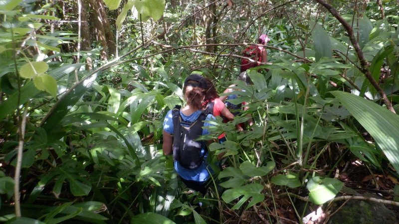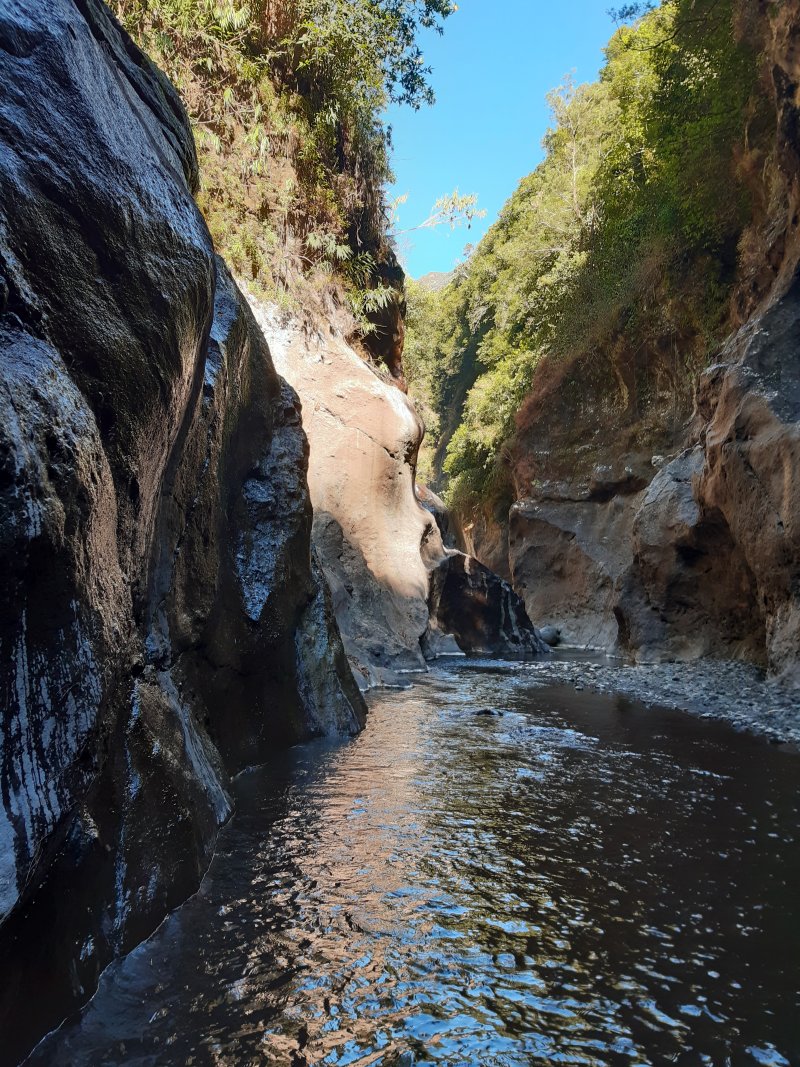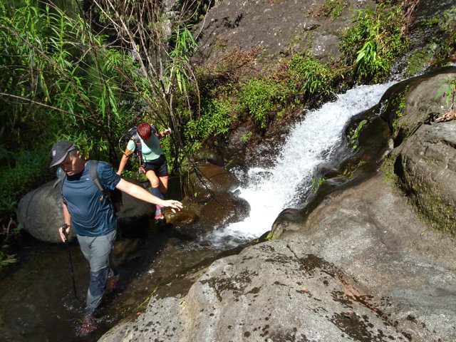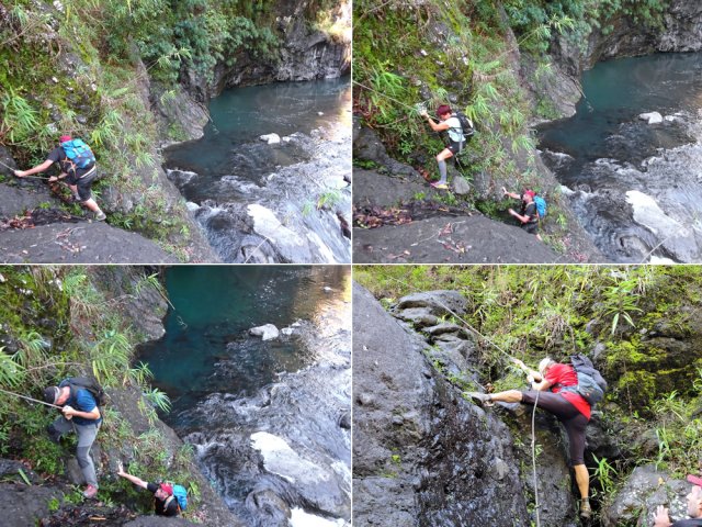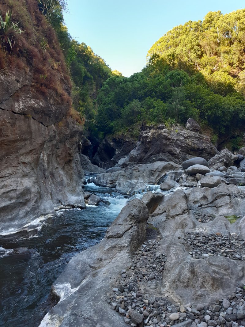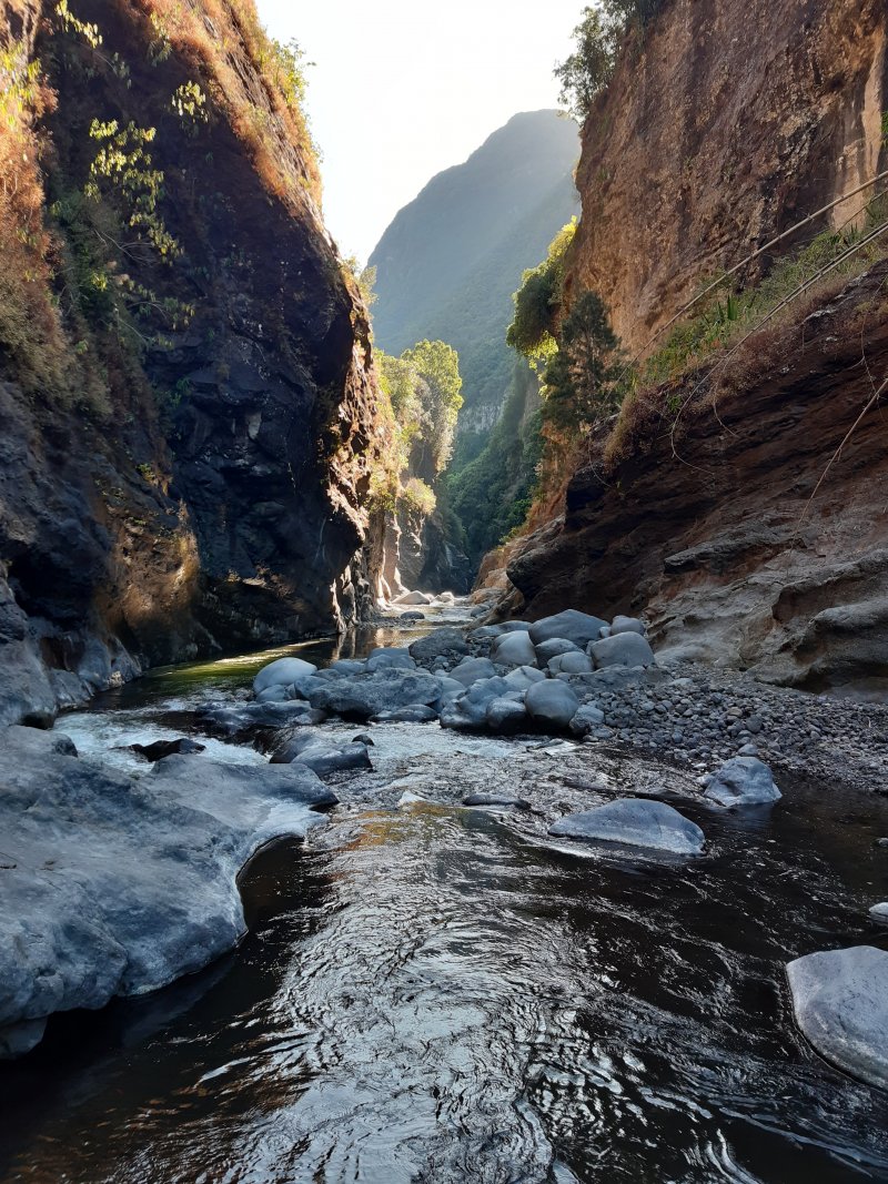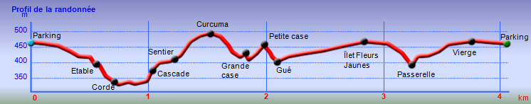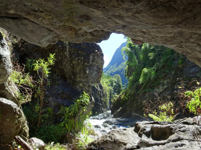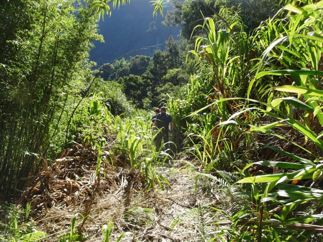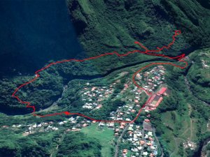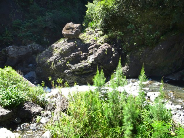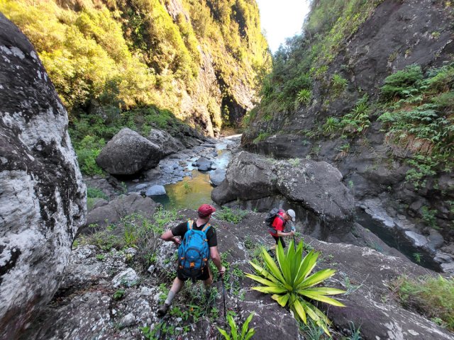 La randonnée débute en face de l'école de Bois de Pomme où un grand parking peut accueillir une douzaine de véhicules. Poursuivre à pied sur le Chemin Jean Albani et bifurquer rapidement au Chemin Paille en Queue. On bénéficie de superbes vues sur le Grand Plate, les plateaux que l'on visitera en milieu de boucle et la vallée de la Rivière des Fleurs Jaunes (Photo 1). La descente sur piste est régulière le long des dernières cases isolées du village parmi quelques cultures. Plus bas, moins utilisée, la piste se transforme en sentier dans les cannes fourragères mais la trace reste facile à suivre (Photo 2). D'un seul coup, tout s'arrête et l'on pense que l'aventure va cesser ici. La piste, qui contournait quelques serres et une zone couverte pour stabulation du bétail est à l'abandon et la végétation a largement pris le dessus. Traverser ce fouillis de 20 mètres qui sera le seul écueil de la boucle. Se méfier des galaberts qui griffent et des arceaux de l'ancienne serre pour atteindre le local. Contourner le petit bâtiment puis poursuivre vers la gauche. On se retrouve immédiatement dans le sous-bois qui domine la très profonde gorge de la Rivière du Mât rugissant dans le fond. Attention au ravin de 50 mètres car la marche s'effectue sur une violente descente couverte de feuilles mortes qui peut impressionner (Photo 3). Après quelques lacets on devine un sentier menant à la passerelle sur la Rivière des Fleurs Jaunes qui a disparu depuis longtemps. Faute de passerelle, poursuivre vers le confluent et remonter pour retrouver l'ancien itinéraire emprunté au siècle dernier par les habitants des îlets oubliés. On parvient rapidement au milieu du Y formé par les deux rivières qui se rejoignent (Photo 4). L'endroit est une merveille de la nature avec ces deux canyons qui s'unissent pour un lit commun près d'une petite ravine terminant en chutes d'eau (Photo 5). A première vue, il semble difficile de rejoindre le cours d'eau mais une corde à nœuds pend sur la gauche. La descente est courte, ludique quoique sportive en raison d'un cassé glissant (Photo 6). Avant de poursuivre, ne pas hésiter à investir les lieux pour une agréable visite en partant vers l'aval (Photo 7). Les berges de la rivière sont assez larges pour les suivre sans danger. On a ainsi une belle vue sur le confluent rocheux (Photo 8) et les deux arrivées de rivières sortant respectivement de leur canyon (Photo 9). On voit bien qu'il faudrait attendre un niveau très bas pour s'engouffrer dans ces goulets étroits de toute beauté. L'addition des trois débits d'eau crée très vite une belle Rivière du Mât à l'important débit (Photo 10). S'il est facile de s'approcher des canyons lorsque le niveau d'eau est bas, il en est tout autrement lorsque le courant est plus violent. Renoncer ou prendre des précautions en cas de glissade en ayant une corde qui sécurise (Photo 11). Malgré la corde la glissade est possible, rapide et sans appel (Photo 12). Il est bon, pour une fois, de ne pas partir trop tôt afin de bénéficier du meilleur ensoleillement. Un gros rocher-grotte permet de se mettre à l'ombre tout en profitant de magnifiques vues sur la partie aval de la rivière (Photo 13). La deuxième partie de la boucle débute à la petite ravine tombant en quelques chutes. Grimper en rive gauche de la Rivière des Fleurs Jaunes et en rive droite de la ravine (Photo 14). La petite cascade un peu plus haut se franchit aisément en suivant les restes du sentier un peu abîmés par le temps (Photo 15). Le sentier, également envahi de végétation s'évite tout simplement en longeant la ravine (Photo 16). Marcher au plus facile, soit sur les berges lorsqu'elles sont dégagées, soit dans le lit (Photo 17). Quelques pisse en l'air égayent le trajet assez facile malgré la mousse et les flaques d'eau (Photo 18). Le sentier, lorsqu'on l'emprunte est assez aisé à deviner dans les longoses (Photo 19). Se préparer à quitter le lit du ruisseau quand arrive une zone pentue, rocheuse, bordée d'une petite falaise glissante (Photo 20). Repérer à gauche le sentier qui file en direction de l'Îlet Fleurs Jaunes qu'on prendra au retour. Partir à droite et retrouver le sentier de l'Île Micot. Il est assez bien marqué, bordé de magnifiques filaos, jamrosats ou camphriers, soutenu parfois de marches anciennes indiquant surtout les lieux de bifurcation vers les autres îlets de l'époque (Photo 21). C'est la partie aventure de la boucle, sans réel danger à condition quand même de prendre garde aux ravins qui bordent le passage. Les trois visites proposées ici s'effectuent à l'envie. En partant plein est, on parvient, après de belles pentes assez raides, des touffes de bambous énormes et de beaux camphriers, à un plateau où se devinent ça et là des vestiges de cultures. Plus haut, en bordure de parc national, on rencontre même une vaste étendue de curcuma délaissée depuis des décennies qui est devenue vivace (Photo 22). Partout, des murets plus ou moins alignés confirment que le lieu était habité et cultivé. A la descente, obliquer à droite à trois marches en pierre et trouver plus haut une case encore debout entourée de bananiers et de quelques fleurs (Photo 23). Il faudrait un sérieux nettoyage de la petite bâtisse en bois sous tôle pour y bivouaquer (Photo 24). Une nouvelle case se trouve au dernier embranchement après avoir suivi longuement un mur d'enceinte. La case est détruite mais l'émotion demeure lorsque l'on voit les pierres taillées, les fleurs ou les objets oubliés (Photo 25). Reprendre une dernière fois le sentier emprunté à l'aller qui finit au ruisseau remonté précédemment (Photo 26). Traverser au gué, trouver la trace encore assez bien marquée qui chemine plein ouest dans les goyaviers et bois de couleurs (Photo 27). Le sentier ondule au grès de la végétation ou du relief et pose parfois questionnement : garder à l'esprit que l'on 