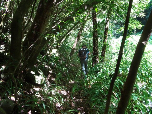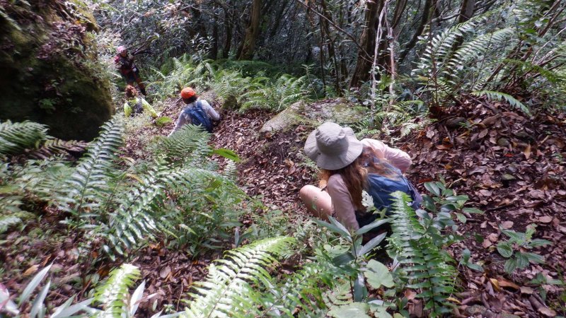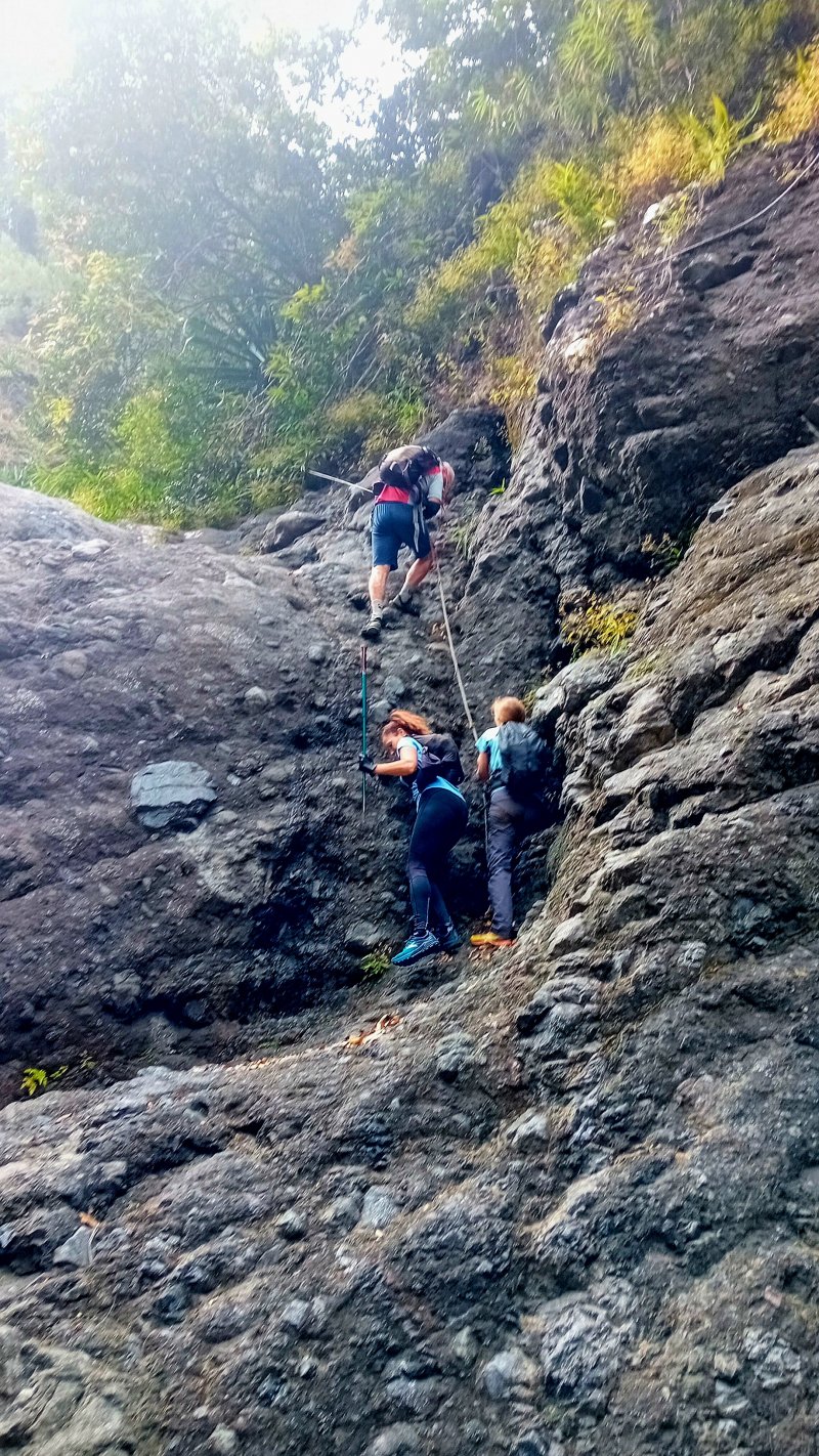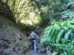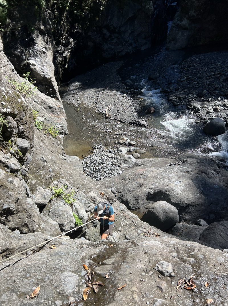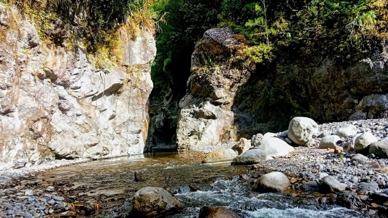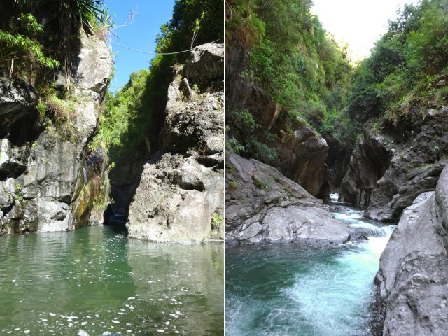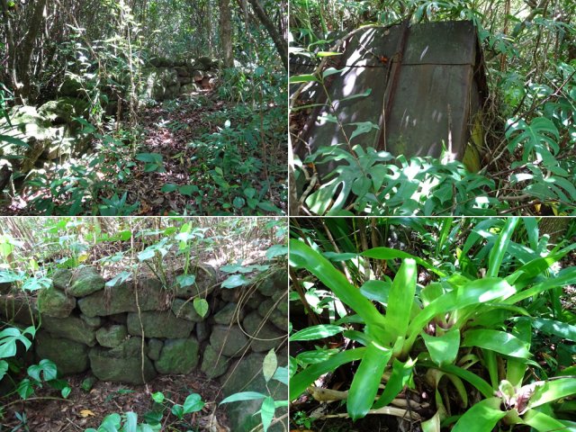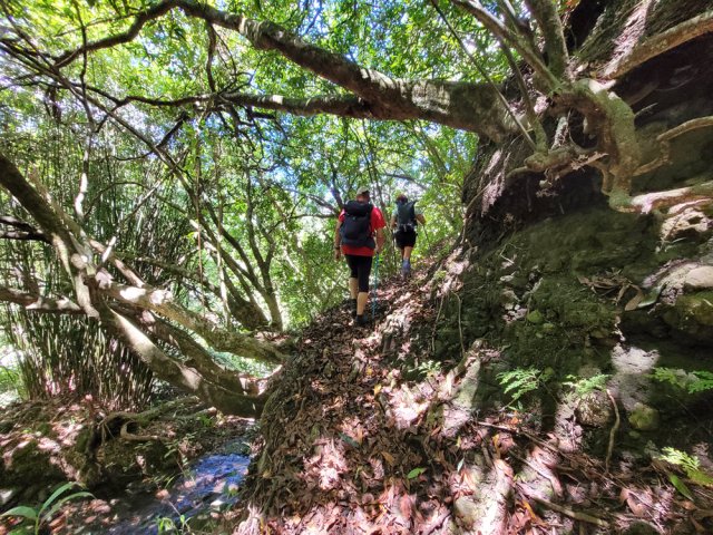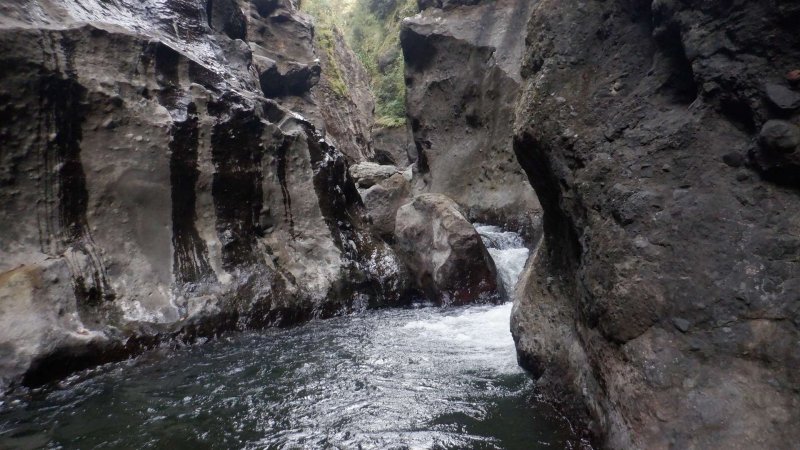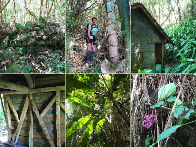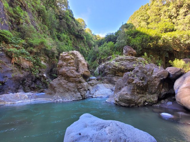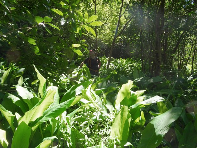 La randonnée débute en face de l'école de Bois de Pomme où un grand parking peut accueillir une douzaine de véhicules. Poursuivre à pied sur le Chemin Jean Albani et bifurquer rapidement au Chemin Paille en Queue. On bénéficie de superbes vues sur le Grand Plate, les plateaux que l'on visitera en milieu de boucle et la vallée de la Rivière des Fleurs Jaunes (Photo 1). La descente sur piste est régulière le long des dernières cases isolées du village parmi quelques cultures. Plus bas, moins utilisée, la piste se transforme en sentier dans les cannes fourragères mais la trace reste facile à suivre (Photo 2). D'un seul coup, tout s'arrête et l'on pense que l'aventure va cesser ici. La piste, qui contournait quelques serres et une zone couverte pour stabulation du bétail est à l'abandon et la végétation a largement pris le dessus. Traverser ce fouillis de 20 mètres qui sera le seul écueil de la boucle. Se méfier des galaberts qui griffent et des arceaux de l'ancienne serre pour atteindre le local. Contourner le petit bâtiment puis poursuivre vers la gauche. On se retrouve immédiatement dans le sous-bois qui domine la très profonde gorge de la Rivière du Mât rugissant dans le fond. Attention au ravin de 50 mètres car la marche s'effectue sur une violente descente couverte de feuilles mortes qui peut impressionner (Photo 3). Après quelques lacets on devine un sentier menant à la passerelle sur la Rivière des Fleurs Jaunes qui a disparu depuis longtemps. Faute de passerelle, poursuivre vers le confluent et remonter pour retrouver l'ancien itinéraire emprunté au siècle dernier par les habitants des îlets oubliés. On parvient rapidement au milieu du Y formé par les deux rivières qui se rejoignent (Photo 4). L'endroit est une merveille de la nature avec ces deux canyons qui s'unissent pour un lit commun près d'une petite ravine terminant en chutes d'eau (Photo 5). A première vue, il semble difficile de rejoindre le cours d'eau mais une corde à nœuds pend sur la gauche. La descente est courte, ludique quoique sportive en raison d'un cassé glissant (Photo 6). Avant de poursuivre, ne pas hésiter à investir les lieux pour une agréable visite en partant vers l'aval (Photo 7). Les berges de la rivière sont assez larges pour les suivre sans danger. On a ainsi une belle vue sur le confluent rocheux (Photo 8) et les deux arrivées de rivières sortant respectivement de leur canyon (Photo 9). On voit bien qu'il faudrait attendre un niveau très bas pour s'engouffrer dans ces goulets étroits de toute beauté. L'addition des trois débits d'eau crée très vite une belle Rivière du Mât à l'important débit (Photo 10). S'il est facile de s'approcher des canyons lorsque le niveau d'eau est bas, il en est tout autrement lorsque le courant est plus violent. Renoncer ou prendre des précautions en cas de glissade en ayant une corde qui sécurise (Photo 11). Malgré la corde la glissade est possible, rapide et sans appel (Photo 12). Il est bon, pour une fois, de ne pas partir trop tôt afin de bénéficier du meilleur ensoleillement. Un gros rocher-grotte permet de se mettre à l'ombre tout en profitant de magnifiques vues sur la partie aval de la rivière (Photo 13). La deuxième partie de la boucle débute à la petite ravine tombant en quelques chutes. Grimper en rive gauche de la Rivière des Fleurs Jaunes et en rive droite de la ravine (Photo 14). La petite cascade un peu plus haut se franchit aisément en suivant les restes du sentier un peu abîmés par le temps (Photo 15). Le sentier, également envahi de végétation s'évite tout simplement en longeant la ravine (Photo 16). Marcher au plus facile, soit sur les berges lorsqu'elles sont dégagées, soit dans le lit (Photo 17). Quelques pisse en l'air égayent le trajet assez facile malgré la mousse et les flaques d'eau (Photo 18). Le sentier, lorsqu'on l'emprunte est assez aisé à deviner dans les longoses (Photo 19). Se préparer à quitter le lit du ruisseau quand arrive une zone pentue, rocheuse, bordée d'une petite falaise glissante (Photo 20). Repérer à gauche le sentier qui file en direction de l'Îlet Fleurs Jaunes qu'on prendra au retour. Partir à droite et retrouver le sentier de l'Île Micot. Il est assez bien marqué, bordé de magnifiques filaos, jamrosats ou camphriers, soutenu parfois de marches anciennes indiquant surtout les lieux de bifurcation vers les autres îlets de l'époque (Photo 21). C'est la partie aventure de la boucle, sans réel danger à condition quand même de prendre garde aux ravins qui bordent le passage. Les trois visites proposées ici s'effectuent à l'envie. En partant plein est, on parvient, après de belles pentes assez raides, des touffes de bambous énormes et de beaux camphriers, à un plateau où se devinent ça et là des vestiges de cultures. Plus haut, en bordure de parc national, on rencontre même une vaste étendue de curcuma délaissée depuis des décennies qui est devenue vivace (Photo 22). Partout, des murets plus ou moins alignés confirment que le lieu était habité et cultivé. A la descente, obliquer à droite à trois marches en pierre et trouver plus haut une case encore debout entourée de bananiers et de quelques fleurs (Photo 23). Il faudrait un sérieux nettoyage de la petite bâtisse en bois sous tôle pour y bivouaquer (Photo 24). Une nouvelle case se trouve au dernier embranchement après avoir suivi longuement un mur d'enceinte. La case est détruite mais l'émotion demeure lorsque l'on voit les pierres taillées, les fleurs ou les objets oubliés (Photo 25). Reprendre une dernière fois le sentier emprunté à l'aller qui finit au ruisseau remonté précédemment (Photo 26). Traverser au gué, trouver la trace encore assez bien marquée qui chemine plein ouest dans les goyaviers et bois de couleurs (Photo 27). Le sentier ondule au grès de la végétation ou du relief et pose parfois questionnement : garder à l'esprit que l'on 