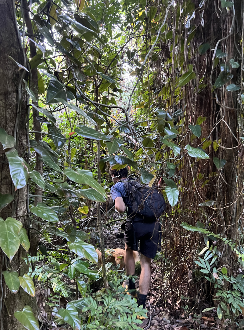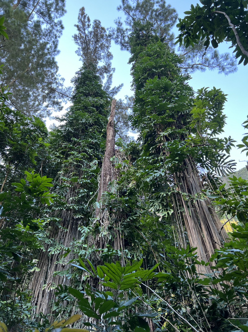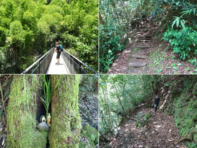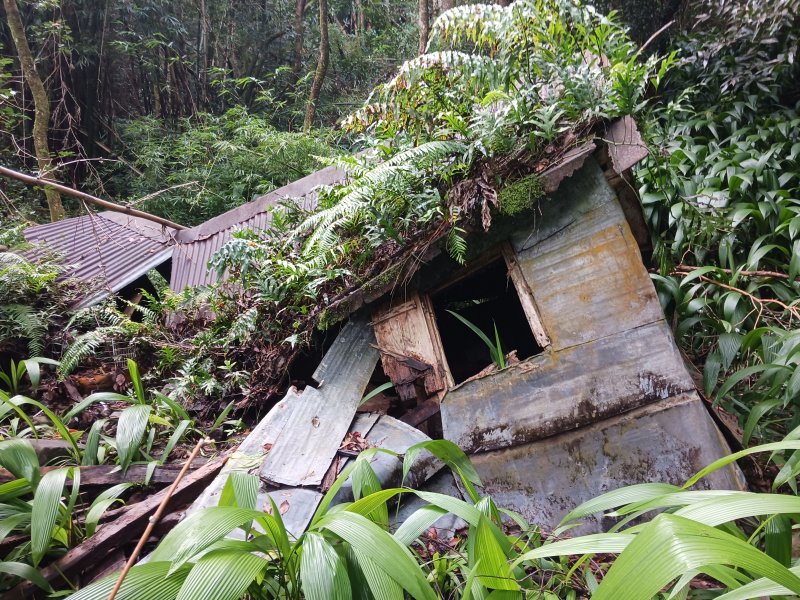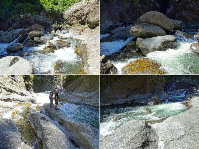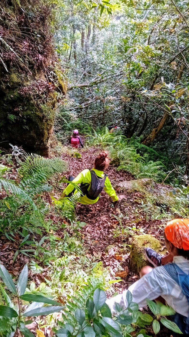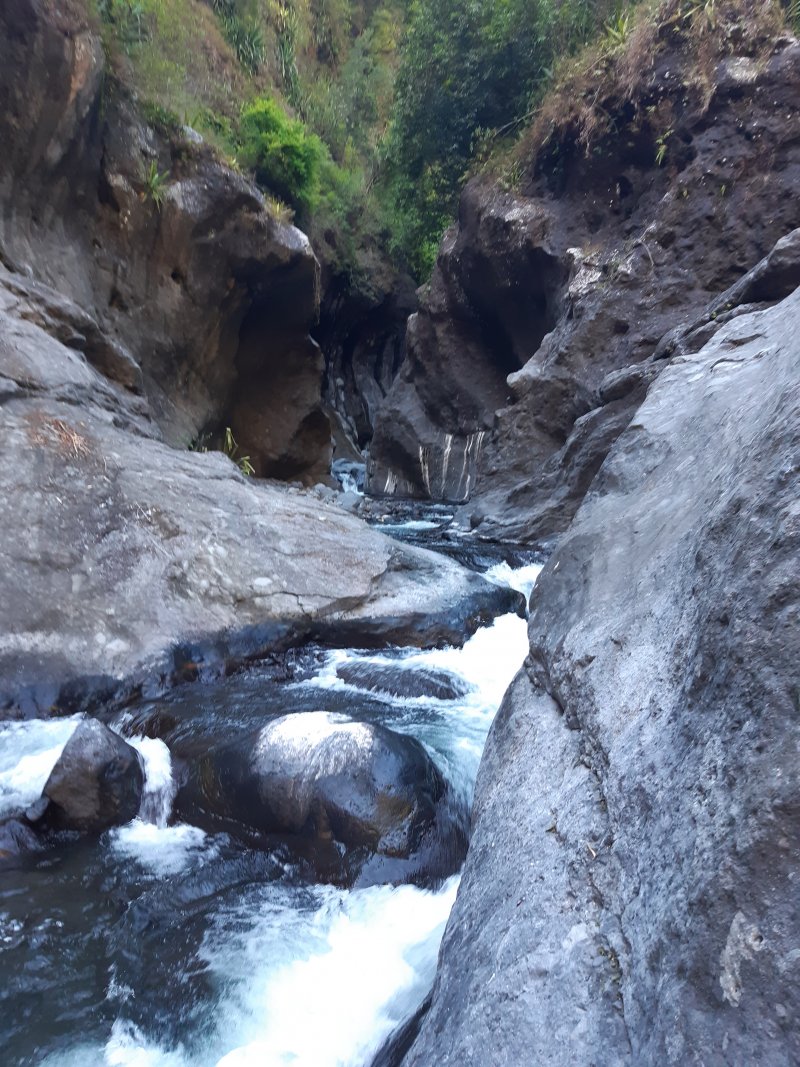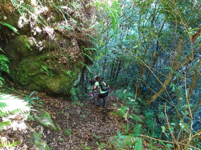 La randonnée débute en face de l'école de Bois de Pomme où un grand parking peut accueillir une douzaine de véhicules. Poursuivre à pied sur le Chemin Jean Albani et bifurquer rapidement au Chemin Paille en Queue. On bénéficie de superbes vues sur le Grand Plate, les plateaux que l'on visitera en milieu de boucle et la vallée de la Rivière des Fleurs Jaunes (Photo 1). La descente sur piste est régulière le long des dernières cases isolées du village parmi quelques cultures. Plus bas, moins utilisée, la piste se transforme en sentier dans les cannes fourragères mais la trace reste facile à suivre (Photo 2). D'un seul coup, tout s'arrête et l'on pense que l'aventure va cesser ici. La piste, qui contournait quelques serres et une zone couverte pour stabulation du bétail est à l'abandon et la végétation a largement pris le dessus. Traverser ce fouillis de 20 mètres qui sera le seul écueil de la boucle. Se méfier des galaberts qui griffent et des arceaux de l'ancienne serre pour atteindre le local. Contourner le petit bâtiment puis poursuivre vers la gauche. On se retrouve immédiatement dans le sous-bois qui domine la très profonde gorge de la Rivière du Mât rugissant dans le fond. Attention au ravin de 50 mètres car la marche s'effectue sur une violente descente couverte de feuilles mortes qui peut impressionner (Photo 3). Après quelques lacets on devine un sentier menant à la passerelle sur la Rivière des Fleurs Jaunes qui a disparu depuis longtemps. Faute de passerelle, poursuivre vers le confluent et remonter pour retrouver l'ancien itinéraire emprunté au siècle dernier par les habitants des îlets oubliés. On parvient rapidement au milieu du Y formé par les deux rivières qui se rejoignent (Photo 4). L'endroit est une merveille de la nature avec ces deux canyons qui s'unissent pour un lit commun près d'une petite ravine terminant en chutes d'eau (Photo 5). A première vue, il semble difficile de rejoindre le cours d'eau mais une corde à nœuds pend sur la gauche. La descente est courte, ludique quoique sportive en raison d'un cassé glissant (Photo 6). Avant de poursuivre, ne pas hésiter à investir les lieux pour une agréable visite en partant vers l'aval (Photo 7). Les berges de la rivière sont assez larges pour les suivre sans danger. On a ainsi une belle vue sur le confluent rocheux (Photo 8) et les deux arrivées de rivières sortant respectivement de leur canyon (Photo 9). On voit bien qu'il faudrait attendre un niveau très bas pour s'engouffrer dans ces goulets étroits de toute beauté. L'addition des trois débits d'eau crée très vite une belle Rivière du Mât à l'important débit (Photo 10). S'il est facile de s'approcher des canyons lorsque le niveau d'eau est bas, il en est tout autrement lorsque le courant est plus violent. Renoncer ou prendre des précautions en cas de glissade en ayant une corde qui sécurise (Photo 11). Malgré la corde la glissade est possible, rapide et sans appel (Photo 12). Il est bon, pour une fois, de ne pas partir trop tôt afin de bénéficier du meilleur ensoleillement. Un gros rocher-grotte permet de se mettre à l'ombre tout en profitant de magnifiques vues sur la partie aval de la rivière (Photo 13). La deuxième partie de la boucle débute à la petite ravine tombant en quelques chutes. Grimper en rive gauche de la Rivière des Fleurs Jaunes et en rive droite de la ravine (Photo 14). La petite cascade un peu plus haut se franchit aisément en suivant les restes du sentier un peu abîmés par le temps (Photo 15). Le sentier, également envahi de végétation s'évite tout simplement en longeant la ravine (Photo 16). Marcher au plus facile, soit sur les berges lorsqu'elles sont dégagées, soit dans le lit (Photo 17). Quelques pisse en l'air égayent le trajet assez facile malgré la mousse et les flaques d'eau (Photo 18). Le sentier, lorsqu'on l'emprunte est assez aisé à deviner dans les longoses (Photo 19). Se préparer à quitter le lit du ruisseau quand arrive une zone pentue, rocheuse, bordée d'une petite falaise glissante (Photo 20). Repérer à gauche le sentier qui file en direction de l'Îlet Fleurs Jaunes qu'on prendra au retour. Partir à droite et retrouver le sentier de l'Île Micot. Il est assez bien marqué, bordé de magnifiques filaos, jamrosats ou camphriers, soutenu parfois de marches anciennes indiquant surtout les lieux de bifurcation vers les autres îlets de l'époque (Photo 21). C'est la partie aventure de la boucle, sans réel danger à condition quand même de prendre garde aux ravins qui bordent le passage. Les trois visites proposées ici s'effectuent à l'envie. En partant plein est, on parvient, après de belles pentes assez raides, des touffes de bambous énormes et de beaux camphriers, à un plateau où se devinent ça et là des vestiges de cultures. Plus haut, en bordure de parc national, on rencontre même une vaste étendue de curcuma délaissée depuis des décennies qui est devenue vivace (Photo 22). Partout, des murets plus ou moins alignés confirment que le lieu était habité et cultivé. A la descente, obliquer à droite à trois marches en pierre et trouver plus haut une case encore debout entourée de bananiers et de quelques fleurs (Photo 23). Il faudrait un sérieux nettoyage de la petite bâtisse en bois sous tôle pour y bivouaquer (Photo 24). Une nouvelle case se trouve au dernier embranchement après avoir suivi longuement un mur d'enceinte. La case est détruite mais l'émotion demeure lorsque l'on voit les pierres taillées, les fleurs ou les objets oubliés (Photo 25). Reprendre une dernière fois le sentier emprunté à l'aller qui finit au ruisseau remonté précédemment (Photo 26). Traverser au gué, trouver la trace encore assez bien marquée qui chemine plein ouest dans les goyaviers et bois de couleurs (Photo 27). Le sentier ondule au grès de la végétation ou du relief et pose parfois questionnement : garder à l'esprit que l'on 