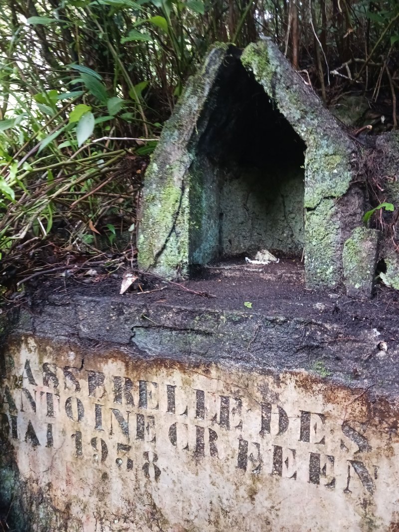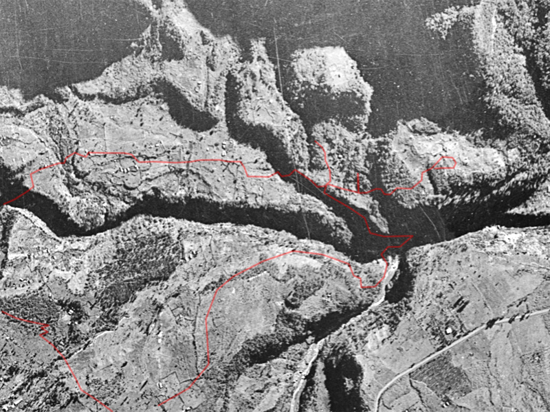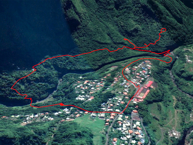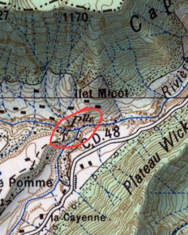 Dans les années 1950, en regardant de plus près la photo aérienne, on remarque qu'il y avait plus de monde vivant sur les plateaux en rive gauche de la Rivière des Fleurs jaunes qu'au village de Bois de Pomme qui ne comptait que trois cases. La passerelle faisait gagner du temps pour rejoindre le petit village de Salazie à partir de l'Îlet Micot. Il est toujours intéressant, avant de se lancer dans une recherche d'îlet oublié, de consulter ces vieilles cartes mises à notre disposition par l'IGN. Le trait rouge représente approximativement la boucle pèlerinage présentée ici.