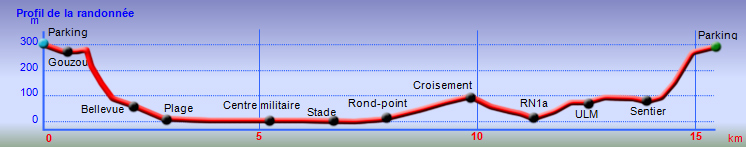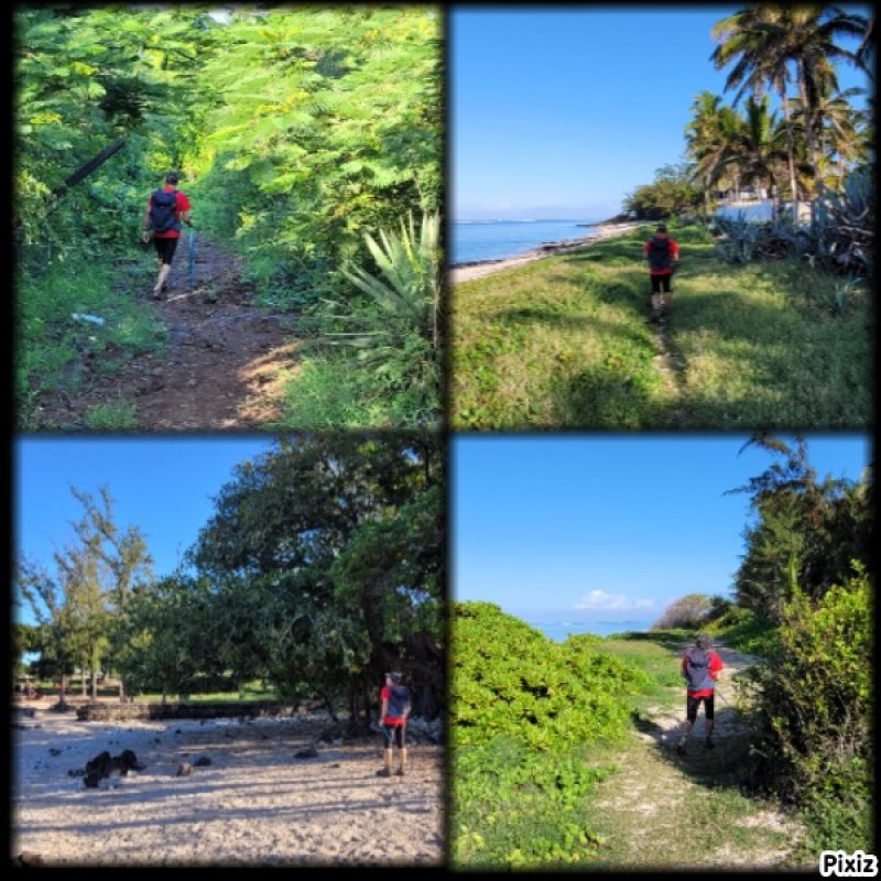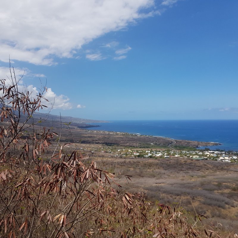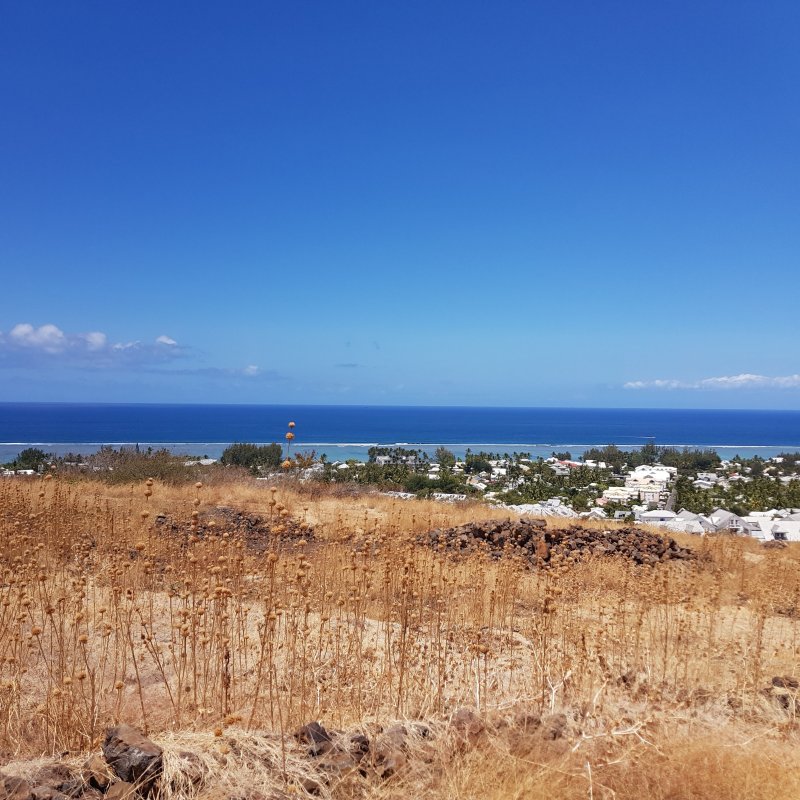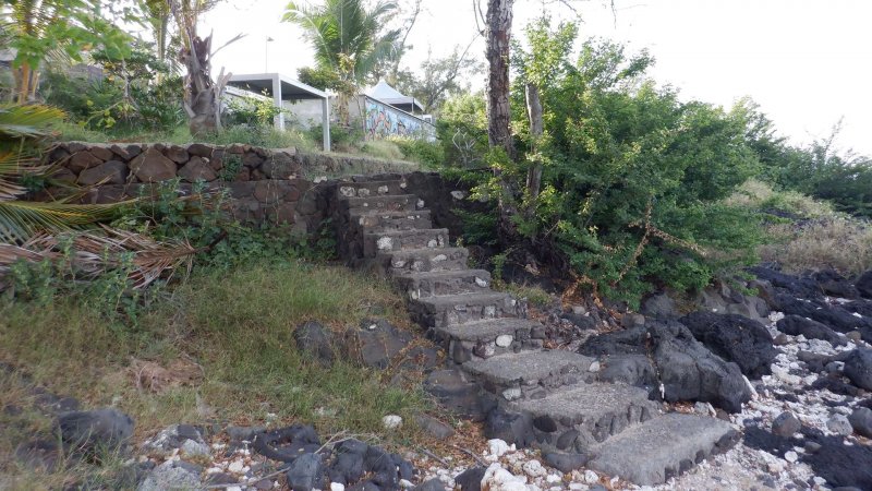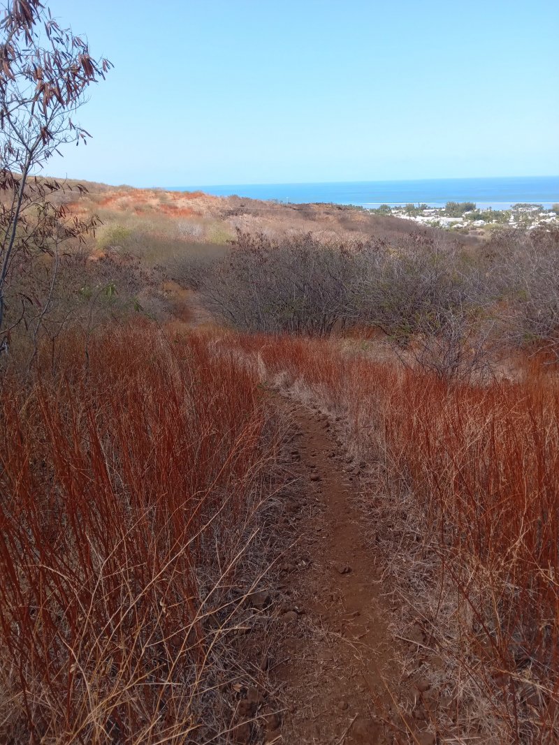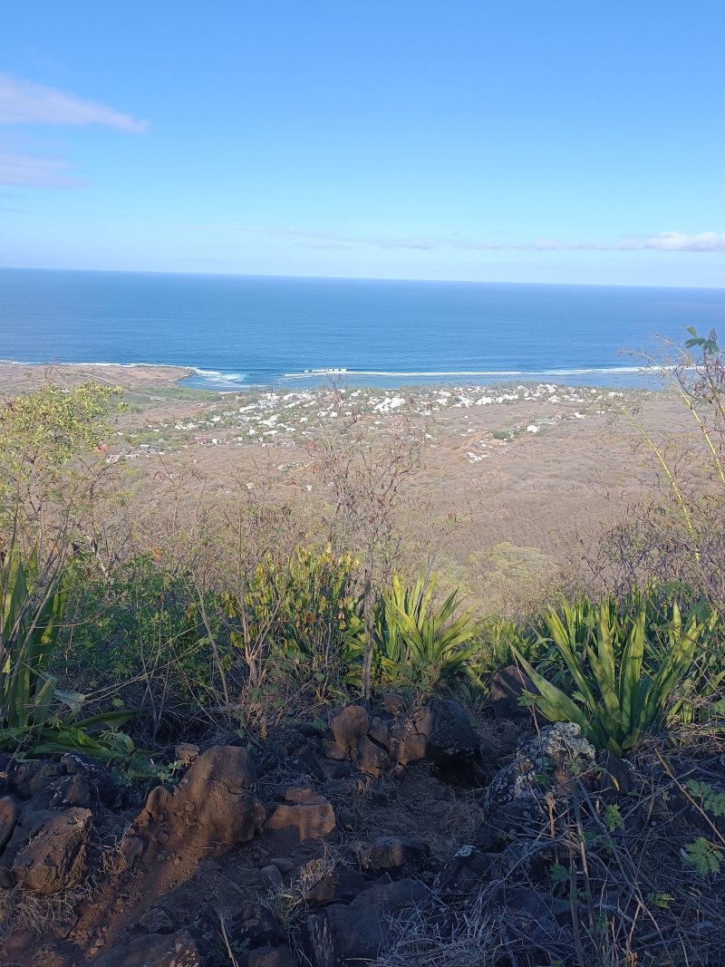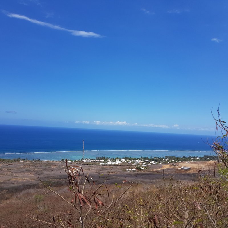 La randonnée débute au parking de l'aire du Tabac utilisée pour le pique-nique et le covoiturage. Avant d'entreprendre la boucle il est possible, en prenant un sentier discret sur la gauche à la sortie du tunnel, de longer l'autoroute afin de rejoindre une grande fresque. Jace, qu'on ne présente plus à La Réunion, a réalisé ici un exploit en peignant des centaines de m² sur plusieurs étages pour présenter son personnage fétiche, le Gouzou (Photo 1). Le sentier est étroit, un peu envahi de plantes diverses non piquantes et ne se perd pas des yeux. Au retour, longer l'aire de repos en profitant des points de vue sur le lagon. En s'approchant de la ravine, on aperçoit le départ du sentier longeant la Ravine du Tabac en rive gauche (Photo 2). Il plonge immédiatement sur les hautes marches créées par les inévitables roches de la région (Photo 3). La végétation comporte des chocas, plusieurs espèces d'acacias et quelques tamarins des bas (Photo 4). La descente est courte et le paysage change peu (Photo 5). Les pierres et hautes marches sont éprouvantes pour les genoux. Le terrain s'assagit en arrivant, 20 minutes plus tard, dans la savane verdoyante en janvier mais totalement brulée quelques mois plus tard (Photo 6). Des pistes filent dans plusieurs directions. Certaines finissent en propriété privée près de constructions sommaires souvent abandonnées ou en travaux. Prendre à gauche, rejoindre le lotissement de Bellevue en longeant des fourrés épais de broussailles piquantes mais fleuries (Photo 7). Quelques hésitations sont possibles. On se retrouve à longer de modestes cases le long d'une piste défoncée. Plus loin, la route de meilleure qualité longe de superbes demeures entourées de jardins fleuris (Photo 9). A la route, partir à droite sur une trentaine de mètres, traverser un parking puis emprunter un des nombreux passages menant aux plages (Photo 10). C'en est fini des acacias piquants pour une heure à marcher sur la plage en longeant le lagon aux eaux turquoise. La marche sur le sable chaud est plus facile que sur les roches de la descente mais le sable peut pénétrer dans les chaussures (Photo 11). On trouve facilement des bribes de sentier littoral plus près des habitations (Photo 12). Le sentier traverse de grandes étendues de lianes. Les patates à Durand aux feuilles de liseron se mélangent aux pommes cochon qui ont la même feuille mais une fleur totalement différente (Photo 13). Ne pas manquer, près d'une aire de repos, les vestiges de la ligne de chemin de fer venant de Saint-Pierre (Photo 14). Plus loin, le sentier de bord longe des installations militaires entourées de grillage (Photo 15). On peut parfois assister aux entraînements virils des militaires du RPIMa. De l'autre côté, des pêcheurs locaux manient la ligne ainsi que le filet pour encercler les bancs de poissons (Photo 16). C'est beaucoup de travail pour de maigres récoltes. Poursuivre sur les rochers ou sur le sable s'il n'y a pas de sentier en cherchant le meilleur endroit pour poser le pied (Photo 17). Ne pas manquer, derrière les maniocs marrons et autres plantes littorales, le discret départ de l'allée sableuse en direction des terrains de sport de la ville (Photo 19). Elle finit à une rue qu'il faut suivre en contournant un parc grillagé. Les terrains de sport sont faciles à repérer. Longer le premier et rejoindre le parcours sportif. Nouvelle balade ombragée entre palmiers, tamarins et poivriers en suivant un peu le parcours sportif et ses équipements (Photo 20). Terminer la piste puis rejoindre le rond-point de Bruniquel. Passer devant l'usine en ruine et trouver la courte Rue des Epis. Emprunter l'escalier, entamer la remontée de la piste pavée bordée d'acacias divers (Photo 21). On peut très bien emprunter l'Avenue de l'Usine et retrouver le parcours un peu plus loin (voir carte). Le chemin Bruniquel est le plus souvent sec mais peut fortement verdir à la saison humide (Photo 22). Au premier croisement situé à l'altitude 112, délaisser le parcours vers le ball-trap et prendre à droite un sentier bien marqué par le passage des sportifs (Photo 23). Ce sentier se poursuit plus bas vers la Ravine de la Saline mais la vallée est difficile à franchir car la trace se perd entre les acacias. Prendre alors à droite puis descendre en direction des lotissements. Rejoindre la RN1a pour une inévitable portion goudronnée vers le sud. Gagner le prochain lotissement et emprunter la première rue à gauche. On retrouve très vite la piste, large et plate, menant aux Communes (Photo 24). Contourner l'aire des ULM et arriver à un croisement de sentiers. Partir vers la gauche, entamer la courte mais raide ascension vers le pont enjambant la Ravine du Tabac. On retrouve la même pente, les mêmes marches que de l'autre côté avec beaucoup plus de chocas (Photo 25). On coupe plusieurs fois les longs lacets qui mènent au même endroit. L'arrivée au plateau s'effectue en passant sous le long viaduc enjambant la profonde ravine (Photo 26). Le soleil étant plus haut qu'au départ, refaire un tour à l'aire de pique-nique pour profiter des panoramas sur la côte (Photo 27).