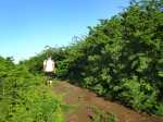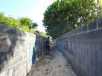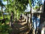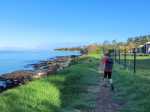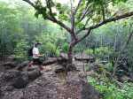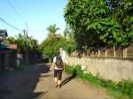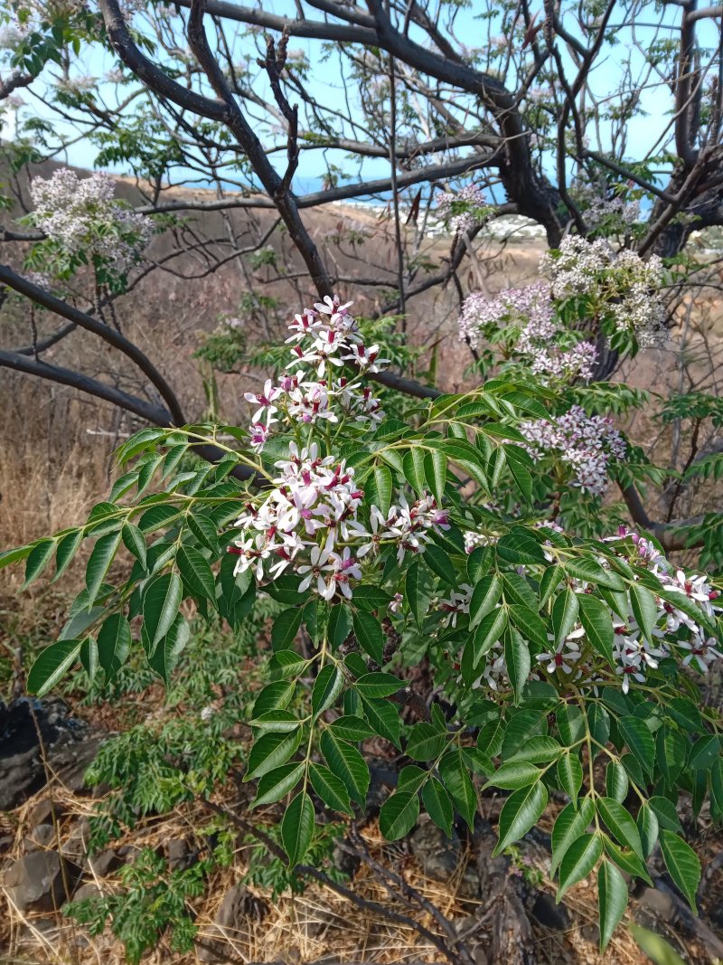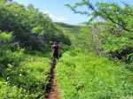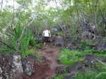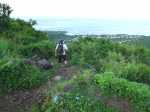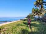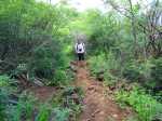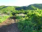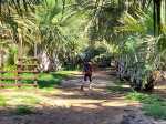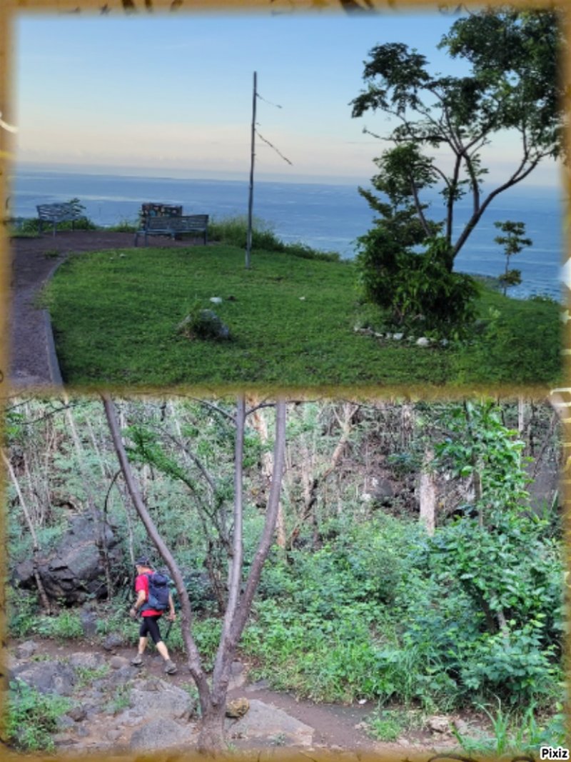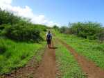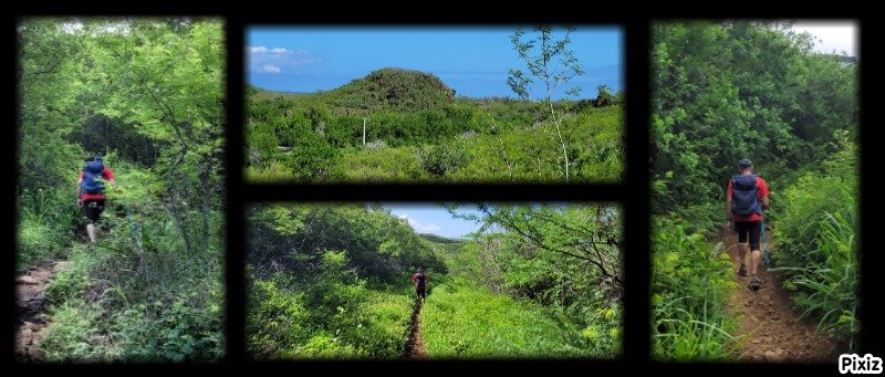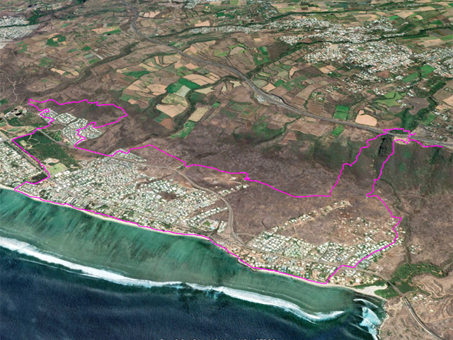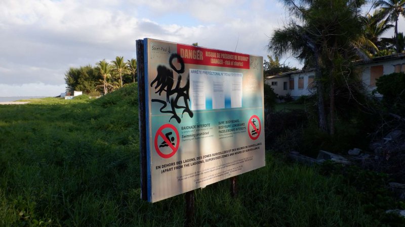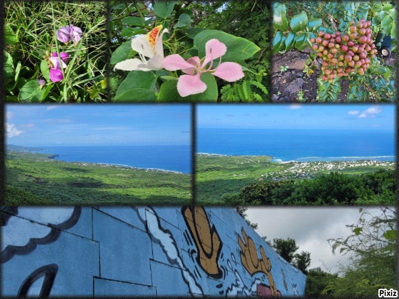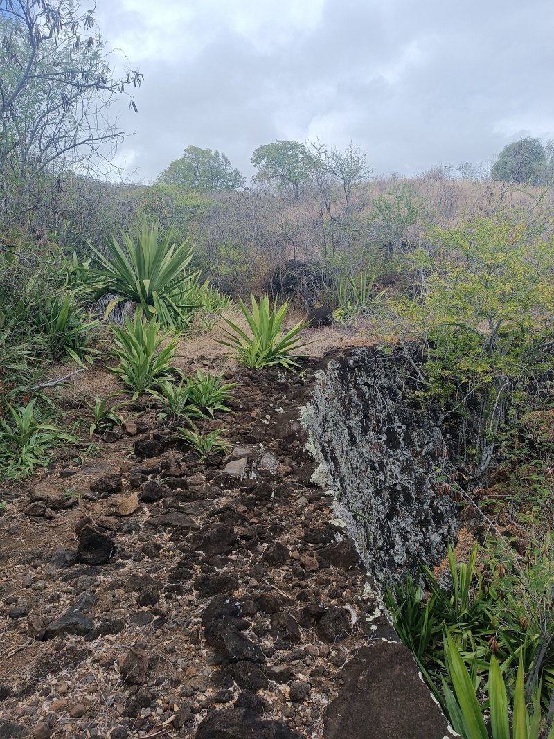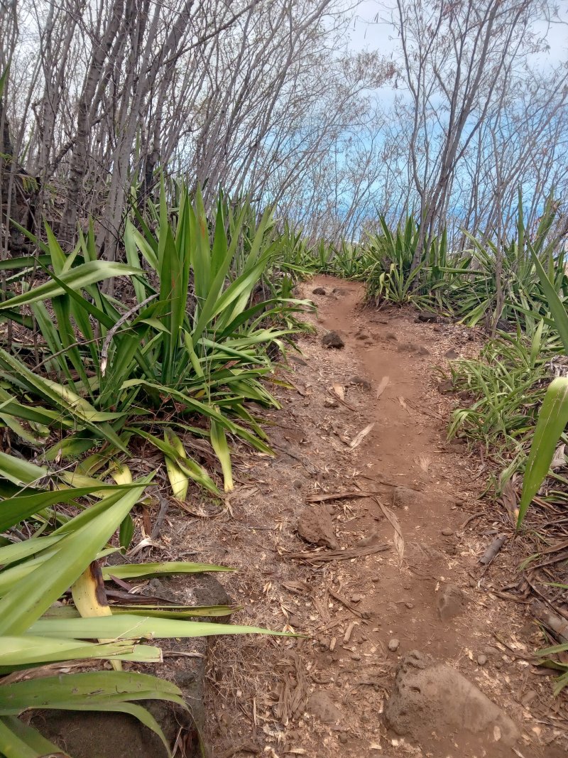 La randonnée débute au parking de l'aire du Tabac utilisée pour le pique-nique et le covoiturage. Avant d'entreprendre la boucle il est possible, en prenant un sentier discret sur la gauche à la sortie du tunnel, de longer l'autoroute afin de rejoindre une grande fresque. Jace, qu'on ne présente plus à La Réunion, a réalisé ici un exploit en peignant des centaines de m² sur plusieurs étages pour présenter son personnage fétiche, le Gouzou (Photo 1). Le sentier est étroit, un peu envahi de plantes diverses non piquantes et ne se perd pas des yeux. Au retour, longer l'aire de repos en profitant des points de vue sur le lagon. En s'approchant de la ravine, on aperçoit le départ du sentier longeant la Ravine du Tabac en rive gauche (Photo 2). Il plonge immédiatement sur les hautes marches créées par les inévitables roches de la région (Photo 3). La végétation comporte des chocas, plusieurs espèces d'acacias et quelques tamarins des bas (Photo 4). La descente est courte et le paysage change peu (Photo 5). Les pierres et hautes marches sont éprouvantes pour les genoux. Le terrain s'assagit en arrivant, 20 minutes plus tard, dans la savane verdoyante en janvier mais totalement brulée quelques mois plus tard (Photo 6). Des pistes filent dans plusieurs directions. Certaines finissent en propriété privée près de constructions sommaires souvent abandonnées ou en travaux. Prendre à gauche, rejoindre le lotissement de Bellevue en longeant des fourrés épais de broussailles piquantes mais fleuries (Photo 7). Quelques hésitations sont possibles. On se retrouve à longer de modestes cases le long d'une piste défoncée. Plus loin, la route de meilleure qualité longe de superbes demeures entourées de jardins fleuris (Photo 9). A la route, partir à droite sur une trentaine de mètres, traverser un parking puis emprunter un des nombreux passages menant aux plages (Photo 10). C'en est fini des acacias piquants pour une heure à marcher sur la plage en longeant le lagon aux eaux turquoise. La marche sur le sable chaud est plus facile que sur les roches de la descente mais le sable peut pénétrer dans les chaussures (Photo 11). On trouve facilement des bribes de sentier littoral plus près des habitations (Photo 12). Le sentier traverse de grandes étendues de lianes. Les patates à Durand aux feuilles de liseron se mélangent aux pommes cochon qui ont la même feuille mais une fleur totalement différente (Photo 13). Ne pas manquer, près d'une aire de repos, les vestiges de la ligne de chemin de fer venant de Saint-Pierre (Photo 14). Plus loin, le sentier de bord longe des installations militaires entourées de grillage (Photo 15). On peut parfois assister aux entraînements virils des militaires du RPIMa. De l'autre côté, des pêcheurs locaux manient la ligne ainsi que le filet pour encercler les bancs de poissons (Photo 16). C'est beaucoup de travail pour de maigres récoltes. Poursuivre sur les rochers ou sur le sable s'il n'y a pas de sentier en cherchant le meilleur endroit pour poser le pied (Photo 17). Ne pas manquer, derrière les maniocs marrons et autres plantes littorales, le discret départ de l'allée sableuse en direction des terrains de sport de la ville (Photo 19). Elle finit à une rue qu'il faut suivre en contournant un parc grillagé. Les terrains de sport sont faciles à repérer. Longer le premier et rejoindre le parcours sportif. Nouvelle balade ombragée entre palmiers, tamarins et poivriers en suivant un peu le parcours sportif et ses équipements (Photo 20). Terminer la piste puis rejoindre le rond-point de Bruniquel. Passer devant l'usine en ruine et trouver la courte Rue des Epis. Emprunter l'escalier, entamer la remontée de la piste pavée bordée d'acacias divers (Photo 21). On peut très bien emprunter l'Avenue de l'Usine et retrouver le parcours un peu plus loin (voir carte). Le chemin Bruniquel est le plus souvent sec mais peut fortement verdir à la saison humide (Photo 22). Au premier croisement situé à l'altitude 112, délaisser le parcours vers le ball-trap et prendre à droite un sentier bien marqué par le passage des sportifs (Photo 23). Ce sentier se poursuit plus bas vers la Ravine de la Saline mais la vallée est difficile à franchir car la trace se perd entre les acacias. Prendre alors à droite puis descendre en direction des lotissements. Rejoindre la RN1a pour une inévitable portion goudronnée vers le sud. Gagner le prochain lotissement et emprunter la première rue à gauche. On retrouve très vite la piste, large et plate, menant aux Communes (Photo 24). Contourner l'aire des ULM et arriver à un croisement de sentiers. Partir vers la gauche, entamer la courte mais raide ascension vers le pont enjambant la Ravine du Tabac. On retrouve la même pente, les mêmes marches que de l'autre côté avec beaucoup plus de chocas (Photo 25). On coupe plusieurs fois les longs lacets qui mènent au même endroit. L'arrivée au plateau s'effectue en passant sous le long viaduc enjambant la profonde ravine (Photo 26). Le soleil étant plus haut qu'au départ, refaire un tour à l'aire de pique-nique pour profiter des panoramas sur la côte (Photo 27).