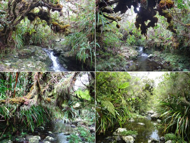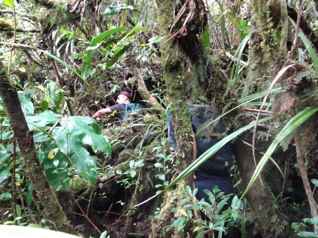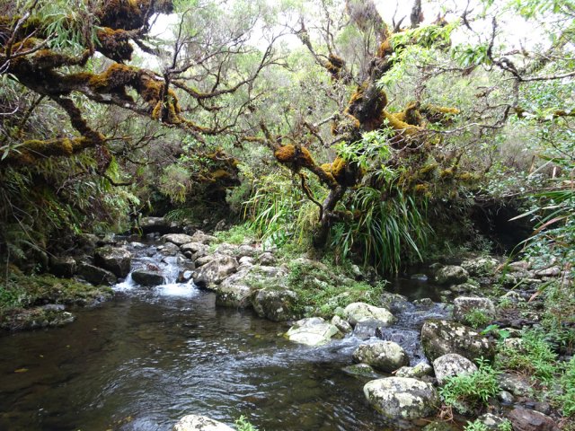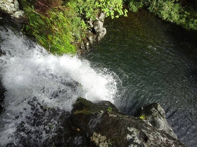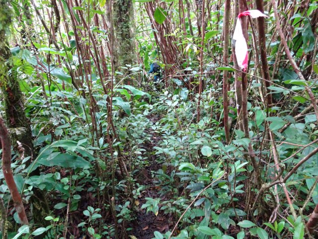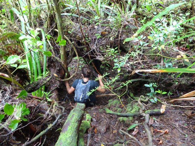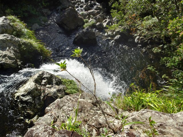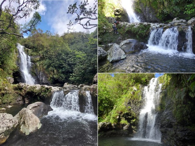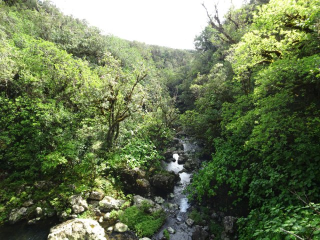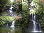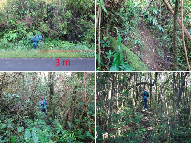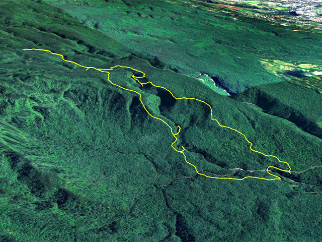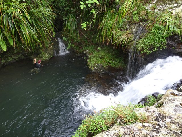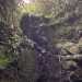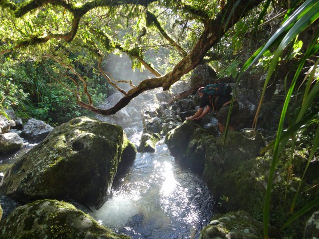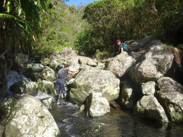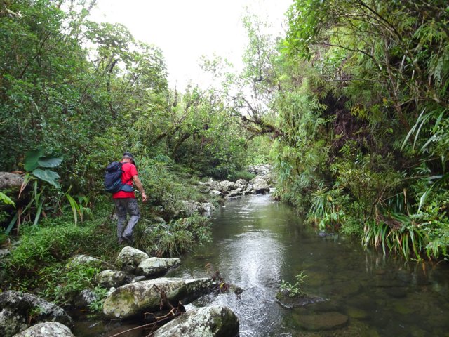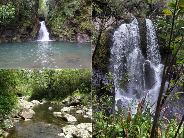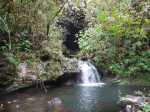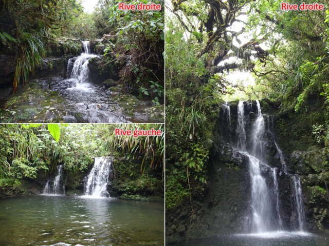 La randonnée débute un peu avant le pont sur le Bras Laurent où un petit parking peut accueillir trois véhicules. Juste en face du parking, le sentier, très discret, ne se remarque pas dans le talus envahi de verdure. Il commence à 3 mètres sur la gauche d'un reste de béton recouvert de renouées. Cinq mètres plus haut, la trace devient bien visible et se suit sans hésiter (Photo 1). La pente est régulière. Le sentier ondule au gré de la végétation ou du relief. Les goyaviers et les longoses couvrent une grande partie du sol. Au bout d'un kilomètre de montée, le parcours se rapproche de plus en plus du rempart de la vallée du Bras Laurent que l'on entend couler sur la gauche. Les sabres prennent la place des longoses mais les goyaviers sont encore bien présents (Photo 2). Plus haut, la pente s'assagit. On rencontre plus fréquemment de beaux bois de couleurs où les bois de savon, de violon, perroquet et quinquina pays dominent. La forêt humide favorise l'apparition de nombreuses variétés d'orchidées, de mousses et de divers lichens (Photo 3). On entend couler des chutes dans le bas. Un sentier très discret, à peine marqué par le peu de passages, permet de rejoindre assez rapidement le bras par une pente très forte où les mains s'avèrent indispensables (Photo 4). En arrivant sur la rive, partir vers l'aval en contournant rochers et bassins pour atteindre le haut de la première cascade (Photo 5). Elle se jette dans un bassin une quinzaine de mètres plus bas (Photo 6). Au lieu de remonter par le trajet emprunté pour venir, préférer longer le torrent vers l'amont pour atteindre la suivante (Photo 7). En évitant les rochers et en se mouillant les pieds on parvient à un superbe endroit près d'une haute chute non répertoriée sur les cartes (Photo 8). Le mur qui sépare les deux bassins se grimpe assez aisément. Le sentier qui remonte en rive gauche, aussi discret que le précédent, n'est pas facile à deviner. La montée est tout aussi raide avant de parvenir dans la forêt de goyaviers du plateau (Photo 9). La végétation change encore. Les gros branles verts recouverts de mousse et d'épiphytes se multiplient. Certaines portions demandent de se contorsionner entre les troncs en prenant garde de ne pas abîmer les orchidées omniprésentes (Photo 10). Le sentier oblique vers le sud. Trouver à nouveau un passage pour rejoindre le Bras Laurent. La descente est courte mais aussi raide que les précédentes (Photo 11). En arrivant tout crotté sur la berge, partir vers l'aval et rejoindre la cascade. On se retrouve à nouveau au sommet d'une haute cascade, équipée pour la descente en rappel, qui se précipite dans un grand bassin (Photo 12). On aperçoit en-dessous la vallée que l'on a évitée en passant sur le rempart (Photo 13). On ne retrouvera les goyaviers qu'au retour après la longue remontée vers le tunnel. Partir en marchant au plus près du bras mais le plus souvent dans l'eau (Photo 14). On parvient en quelques minutes à un nouvel endroit sauvage et aquatique entouré de verdure (Photo 15). Un bassin, alimenté par un toboggan et quelques petites chutes, ferme le passage. En nageant, on peut s'approcher de l'affluent du Bras Laurent qui se jette dans le bassin (Photo 16). Dépasser le toboggan et poursuivre la remontée de la rivière. On rencontre un nouvel affluent dans un cadre sauvage. Partir à droite pour rester sur le cours d'eau principal (Photo 17). Les amateurs de natures mortes regretteront d'avoir oublié l'appareil photo pour immortaliser les arbres couverts de mousse dominant la rivière (Photo 18). Toutes les 10 minutes, une chute plus ou moins importante barre le passage. Les trois principales se contournent par un sentier assez facile à trouver en rive droite ou gauche selon la chute (Photo 19). Quelques minutes après avoir contourné la grande cascade, on devine un grand trou noir derrière un nouveau bassin (Photo 20). On arrive ici à un tunnel dont les traces de lave malmenées par les crues indiquent une origine volcanique (Photo 21). Le plafond est très haut et, déjà depuis l'entrée, on aperçoit au loin la sortie. La lampe est cependant nécessaire pour marcher sans danger et éviter de chuter dans un bassin (Photo 22). Après 100 mètres dans le noir, on s'approche de la sortie (Photo 23). Des sources d'eau claire filtrent à travers les roches. L'entrée est tapissée de fougères (Photo 24). Le Bras Laurent, sans ses multiples affluents et les sources, est devenu un modeste ruisseau que l'on peut remonter plus facilement que tout ce qui vient d'être entrepris. La poursuite s'effectue donc à l'envie ou en fonction de l'heure. Revenir vers l'aval en franchissant à nouveau le tunnel, les trois cascades, les zones moussues et les affluents. Au bassin de la photo 16, 25 m en aval de ce bassin, chercher en rive droite le début du sentier qui monte dans la même végétation que celle de l'autre côté. On retrouve les énormes branles centenaires méconnaissables en raison de l'épaisseur de mousse (Photo 25). Mais ce sont surtout les goyaviers et quelques gros spécimens de bois de couleurs que l'on rencontre tout au long de la traversée (Photo 26). On parvient à une très forte descente offrant des points de vue sur la vallée du Bras d'Amal et de ses affluents. Comme de l'autre côté, on devine les cascades au bruit que l'on entend. Pour les rejoindre, les sentiers se remarquent souvent au dernier moment. Les emprunter signifie de nouvelles fortes descentes et remontées sportives, mais le spectacle est au rendez-vous (Photo 27). Suivre le sentier principal qui bifurque parfois sans avertissement, noyé dans les goyaviers (Photo 28). Attention, plusieurs pseudo-croisements peuvent poser questionnement ; prendre toujours le mieux marqué au sol sous peine de finir en pleine jungle 30 m plus loin. C'est avec le plein de magnifiques découvertes que l'on atteint la route près du calvaire. Après 200 m d