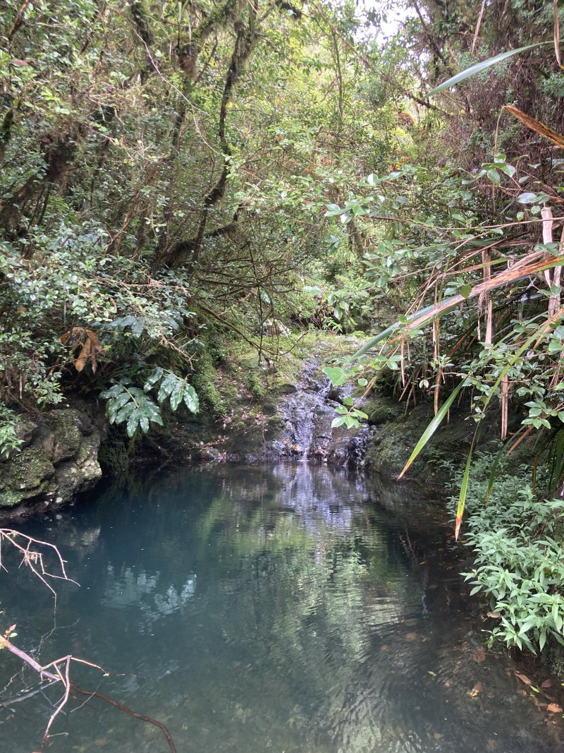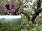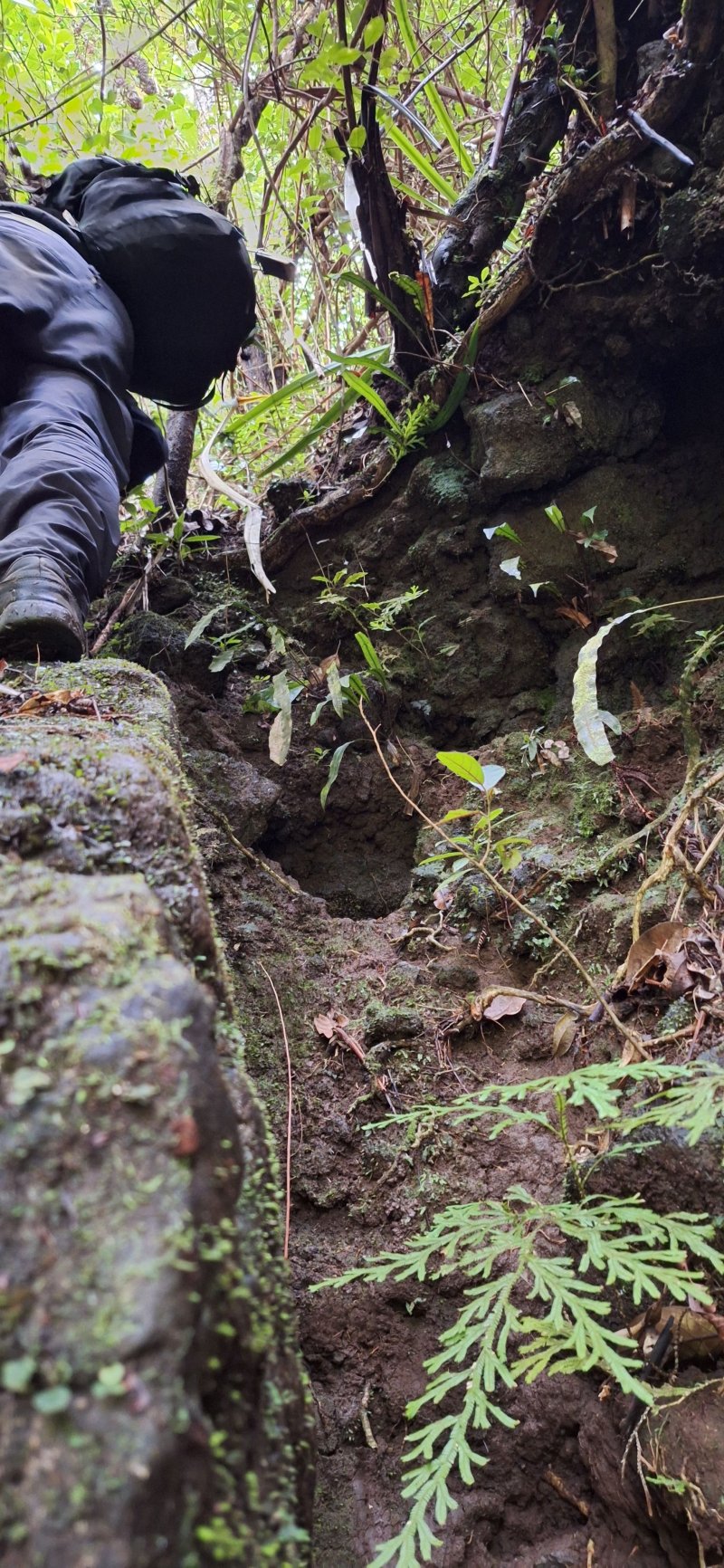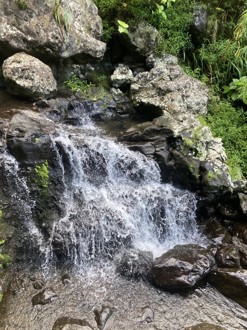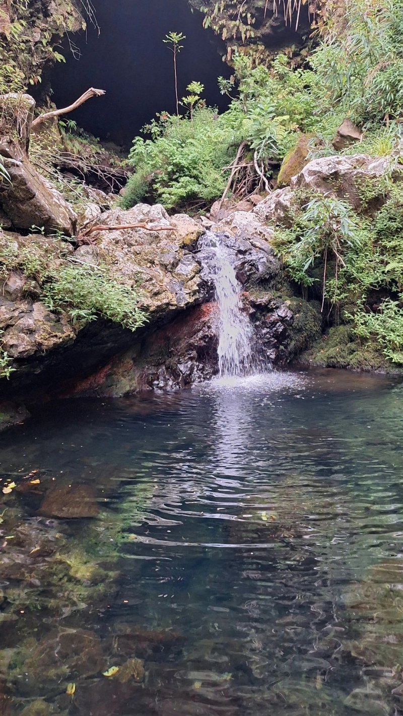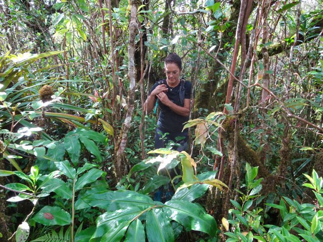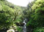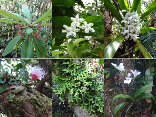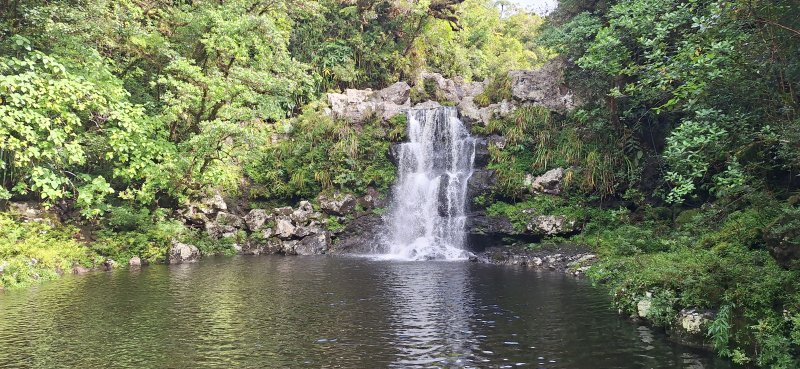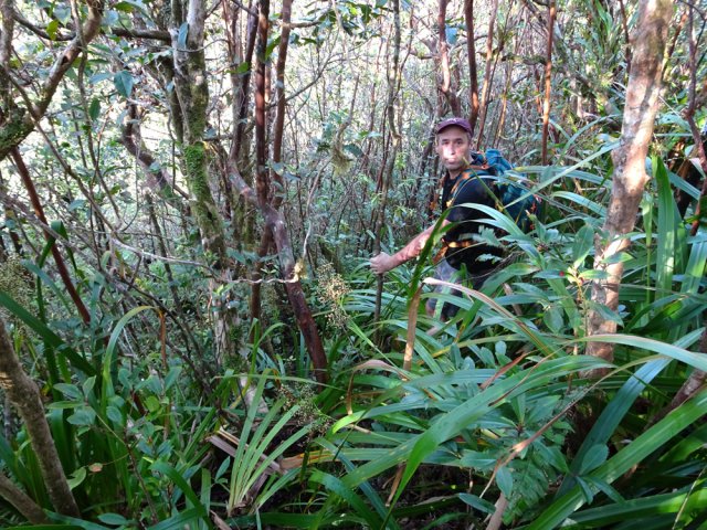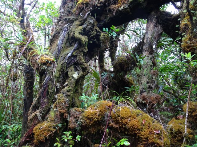 La randonnée débute un peu avant le pont sur le Bras Laurent où un petit parking peut accueillir trois véhicules. Juste en face du parking, le sentier, très discret, ne se remarque pas dans le talus envahi de verdure. Il commence à 3 mètres sur la gauche d'un reste de béton recouvert de renouées. Cinq mètres plus haut, la trace devient bien visible et se suit sans hésiter (Photo 1). La pente est régulière. Le sentier ondule au gré de la végétation ou du relief. Les goyaviers et les longoses couvrent une grande partie du sol. Au bout d'un kilomètre de montée, le parcours se rapproche de plus en plus du rempart de la vallée du Bras Laurent que l'on entend couler sur la gauche. Les sabres prennent la place des longoses mais les goyaviers sont encore bien présents (Photo 2). Plus haut, la pente s'assagit. On rencontre plus fréquemment de beaux bois de couleurs où les bois de savon, de violon, perroquet et quinquina pays dominent. La forêt humide favorise l'apparition de nombreuses variétés d'orchidées, de mousses et de divers lichens (Photo 3). On entend couler des chutes dans le bas. Un sentier très discret, à peine marqué par le peu de passages, permet de rejoindre assez rapidement le bras par une pente très forte où les mains s'avèrent indispensables (Photo 4). En arrivant sur la rive, partir vers l'aval en contournant rochers et bassins pour atteindre le haut de la première cascade (Photo 5). Elle se jette dans un bassin une quinzaine de mètres plus bas (Photo 6). Au lieu de remonter par le trajet emprunté pour venir, préférer longer le torrent vers l'amont pour atteindre la suivante (Photo 7). En évitant les rochers et en se mouillant les pieds on parvient à un superbe endroit près d'une haute chute non répertoriée sur les cartes (Photo 8). Le mur qui sépare les deux bassins se grimpe assez aisément. Le sentier qui remonte en rive gauche, aussi discret que le précédent, n'est pas facile à deviner. La montée est tout aussi raide avant de parvenir dans la forêt de goyaviers du plateau (Photo 9). La végétation change encore. Les gros branles verts recouverts de mousse et d'épiphytes se multiplient. Certaines portions demandent de se contorsionner entre les troncs en prenant garde de ne pas abîmer les orchidées omniprésentes (Photo 10). Le sentier oblique vers le sud. Trouver à nouveau un passage pour rejoindre le Bras Laurent. La descente est courte mais aussi raide que les précédentes (Photo 11). En arrivant tout crotté sur la berge, partir vers l'aval et rejoindre la cascade. On se retrouve à nouveau au sommet d'une haute cascade, équipée pour la descente en rappel, qui se précipite dans un grand bassin (Photo 12). On aperçoit en-dessous la vallée que l'on a évitée en passant sur le rempart (Photo 13). On ne retrouvera les goyaviers qu'au retour après la longue remontée vers le tunnel. Partir en marchant au plus près du bras mais le plus souvent dans l'eau (Photo 14). On parvient en quelques minutes à un nouvel endroit sauvage et aquatique entouré de verdure (Photo 15). Un bassin, alimenté par un toboggan et quelques petites chutes, ferme le passage. En nageant, on peut s'approcher de l'affluent du Bras Laurent qui se jette dans le bassin (Photo 16). Dépasser le toboggan et poursuivre la remontée de la rivière. On rencontre un nouvel affluent dans un cadre sauvage. Partir à droite pour rester sur le cours d'eau principal (Photo 17). Les amateurs de natures mortes regretteront d'avoir oublié l'appareil photo pour immortaliser les arbres couverts de mousse dominant la rivière (Photo 18). Toutes les 10 minutes, une chute plus ou moins importante barre le passage. Les trois principales se contournent par un sentier assez facile à trouver en rive droite ou gauche selon la chute (Photo 19). Quelques minutes après avoir contourné la grande cascade, on devine un grand trou noir derrière un nouveau bassin (Photo 20). On arrive ici à un tunnel dont les traces de lave malmenées par les crues indiquent une origine volcanique (Photo 21). Le plafond est très haut et, déjà depuis l'entrée, on aperçoit au loin la sortie. La lampe est cependant nécessaire pour marcher sans danger et éviter de chuter dans un bassin (Photo 22). Après 100 mètres dans le noir, on s'approche de la sortie (Photo 23). Des sources d'eau claire filtrent à travers les roches. L'entrée est tapissée de fougères (Photo 24). Le Bras Laurent, sans ses multiples affluents et les sources, est devenu un modeste ruisseau que l'on peut remonter plus facilement que tout ce qui vient d'être entrepris. La poursuite s'effectue donc à l'envie ou en fonction de l'heure. Revenir vers l'aval en franchissant à nouveau le tunnel, les trois cascades, les zones moussues et les affluents. Au bassin de la photo 16, 25 m en aval de ce bassin, chercher en rive droite le début du sentier qui monte dans la même végétation que celle de l'autre côté. On retrouve les énormes branles centenaires méconnaissables en raison de l'épaisseur de mousse (Photo 25). Mais ce sont surtout les goyaviers et quelques gros spécimens de bois de couleurs que l'on rencontre tout au long de la traversée (Photo 26). On parvient à une très forte descente offrant des points de vue sur la vallée du Bras d'Amal et de ses affluents. Comme de l'autre côté, on devine les cascades au bruit que l'on entend. Pour les rejoindre, les sentiers se remarquent souvent au dernier moment. Les emprunter signifie de nouvelles fortes descentes et remontées sportives, mais le spectacle est au rendez-vous (Photo 27). Suivre le sentier principal qui bifurque parfois sans avertissement, noyé dans les goyaviers (Photo 28). Attention, plusieurs pseudo-croisements peuvent poser questionnement ; prendre toujours le mieux marqué au sol sous peine de finir en pleine jungle 30 m plus loin. C'est avec le plein de magnifiques découvertes que l'on atteint la route près du calvaire. Après 200 m d
