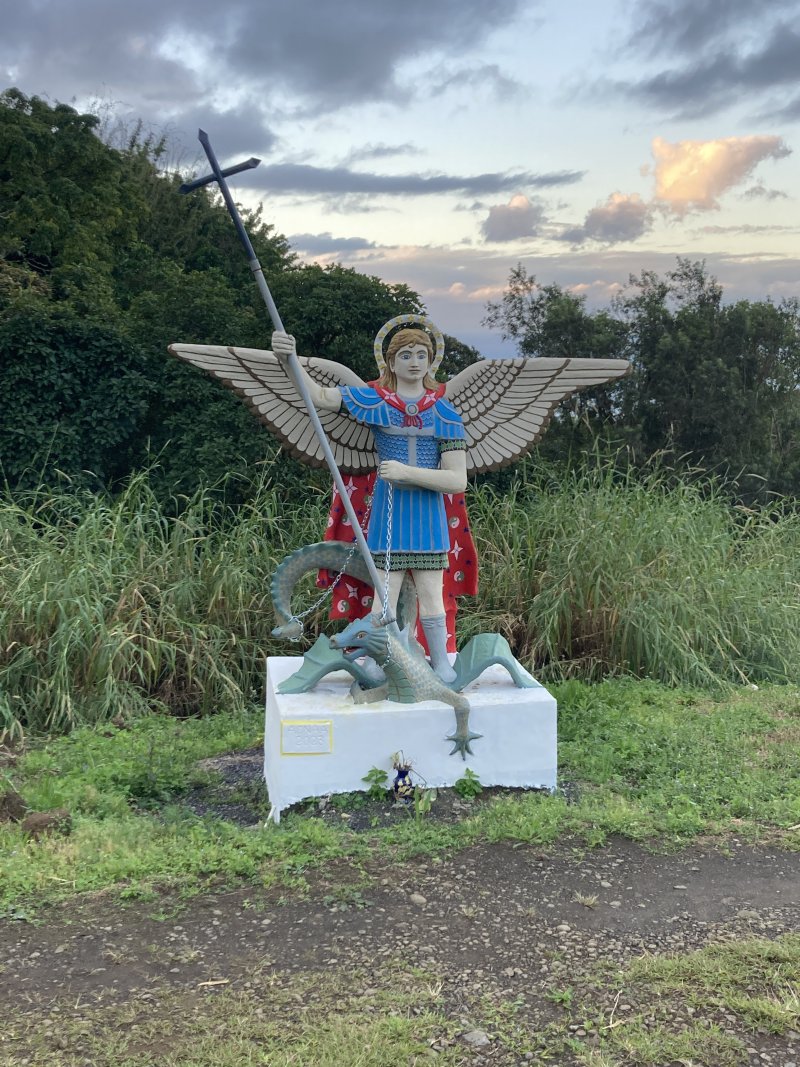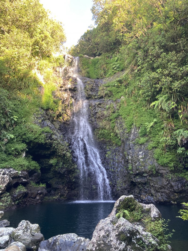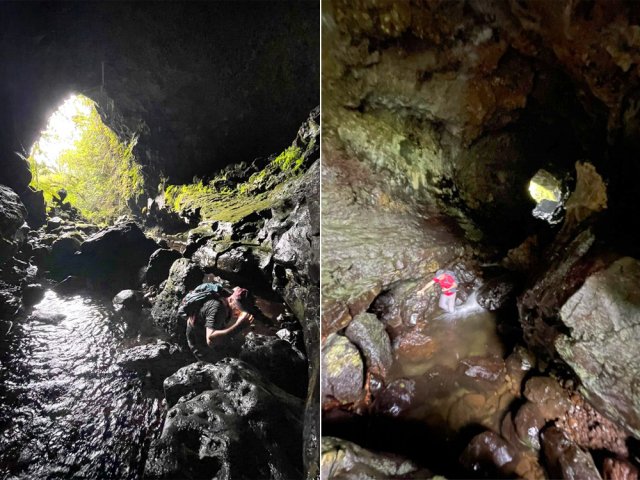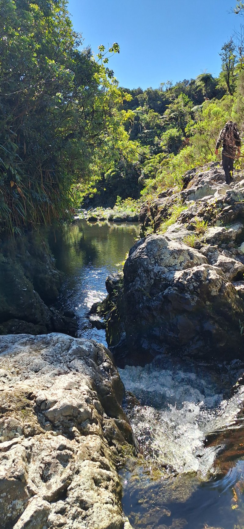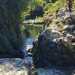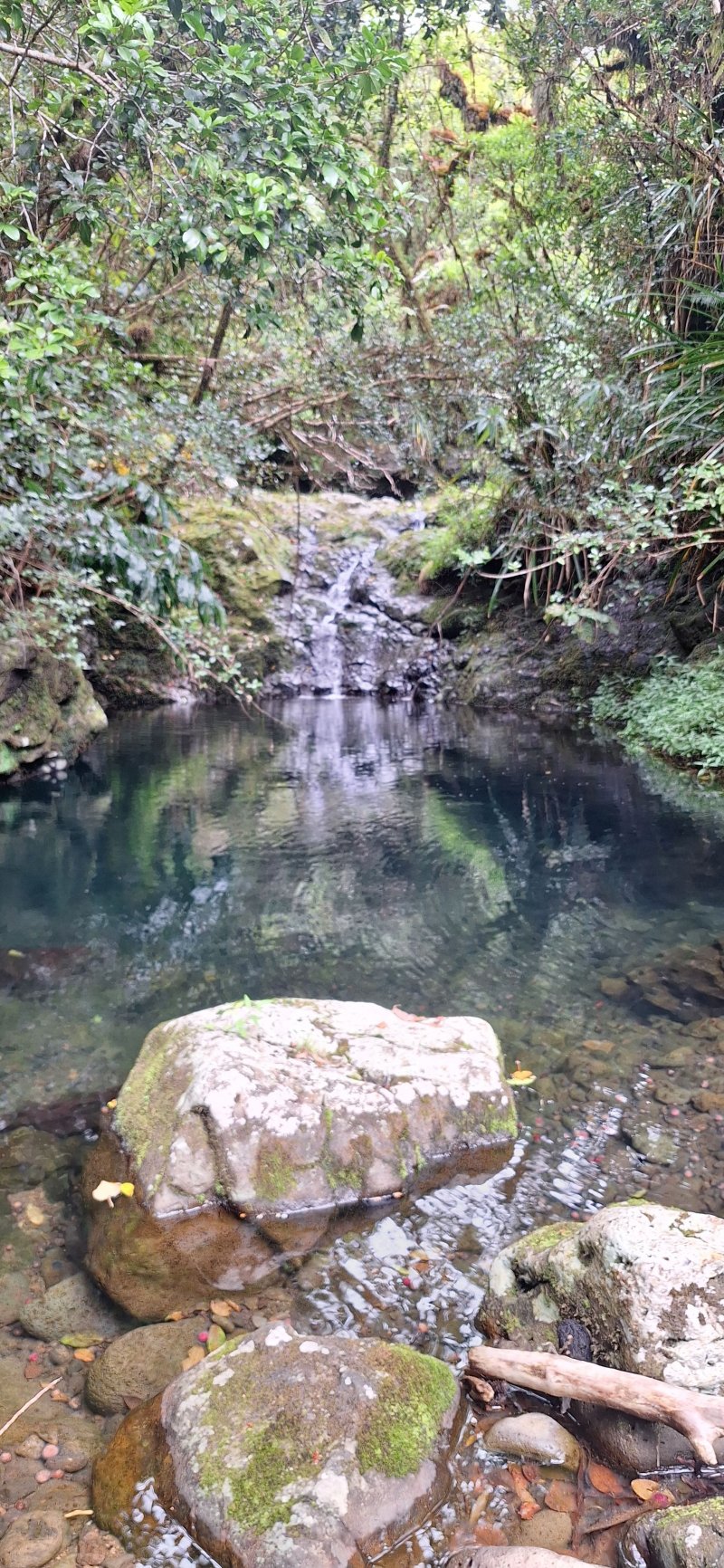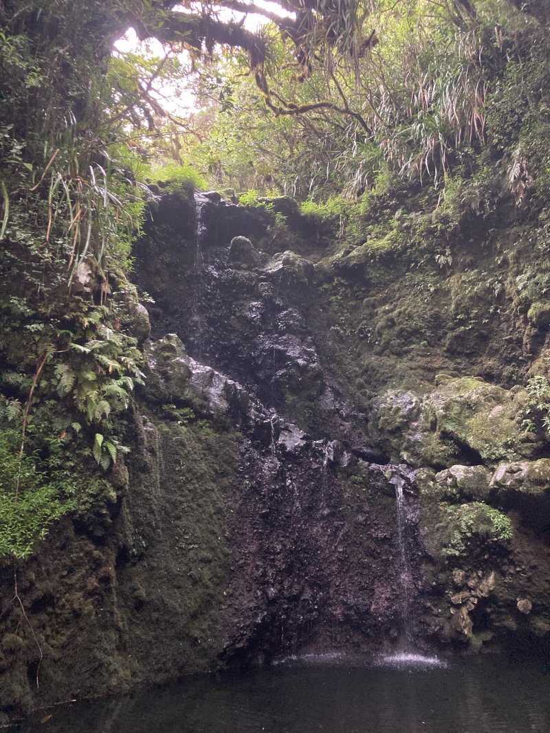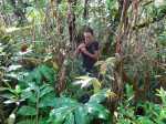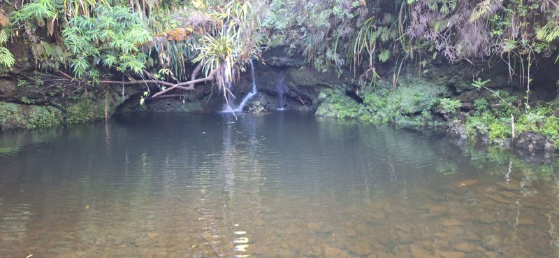 La randonnée débute un peu avant le pont sur le Bras Laurent où un petit parking peut accueillir trois véhicules. Juste en face du parking, le sentier, très discret, ne se remarque pas dans le talus envahi de verdure. Il commence à 3 mètres sur la gauche d'un reste de béton recouvert de renouées. Cinq mètres plus haut, la trace devient bien visible et se suit sans hésiter (Photo 1). La pente est régulière. Le sentier ondule au gré de la végétation ou du relief. Les goyaviers et les longoses couvrent une grande partie du sol. Au bout d'un kilomètre de montée, le parcours se rapproche de plus en plus du rempart de la vallée du Bras Laurent que l'on entend couler sur la gauche. Les sabres prennent la place des longoses mais les goyaviers sont encore bien présents (Photo 2). Plus haut, la pente s'assagit. On rencontre plus fréquemment de beaux bois de couleurs où les bois de savon, de violon, perroquet et quinquina pays dominent. La forêt humide favorise l'apparition de nombreuses variétés d'orchidées, de mousses et de divers lichens (Photo 3). On entend couler des chutes dans le bas. Un sentier très discret, à peine marqué par le peu de passages, permet de rejoindre assez rapidement le bras par une pente très forte où les mains s'avèrent indispensables (Photo 4). En arrivant sur la rive, partir vers l'aval en contournant rochers et bassins pour atteindre le haut de la première cascade (Photo 5). Elle se jette dans un bassin une quinzaine de mètres plus bas (Photo 6). Au lieu de remonter par le trajet emprunté pour venir, préférer longer le torrent vers l'amont pour atteindre la suivante (Photo 7). En évitant les rochers et en se mouillant les pieds on parvient à un superbe endroit près d'une haute chute non répertoriée sur les cartes (Photo 8). Le mur qui sépare les deux bassins se grimpe assez aisément. Le sentier qui remonte en rive gauche, aussi discret que le précédent, n'est pas facile à deviner. La montée est tout aussi raide avant de parvenir dans la forêt de goyaviers du plateau (Photo 9). La végétation change encore. Les gros branles verts recouverts de mousse et d'épiphytes se multiplient. Certaines portions demandent de se contorsionner entre les troncs en prenant garde de ne pas abîmer les orchidées omniprésentes (Photo 10). Le sentier oblique vers le sud. Trouver à nouveau un passage pour rejoindre le Bras Laurent. La descente est courte mais aussi raide que les précédentes (Photo 11). En arrivant tout crotté sur la berge, partir vers l'aval et rejoindre la cascade. On se retrouve à nouveau au sommet d'une haute cascade, équipée pour la descente en rappel, qui se précipite dans un grand bassin (Photo 12). On aperçoit en-dessous la vallée que l'on a évitée en passant sur le rempart (Photo 13). On ne retrouvera les goyaviers qu'au retour après la longue remontée vers le tunnel. Partir en marchant au plus près du bras mais le plus souvent dans l'eau (Photo 14). On parvient en quelques minutes à un nouvel endroit sauvage et aquatique entouré de verdure (Photo 15). Un bassin, alimenté par un toboggan et quelques petites chutes, ferme le passage. En nageant, on peut s'approcher de l'affluent du Bras Laurent qui se jette dans le bassin (Photo 16). Dépasser le toboggan et poursuivre la remontée de la rivière. On rencontre un nouvel affluent dans un cadre sauvage. Partir à droite pour rester sur le cours d'eau principal (Photo 17). Les amateurs de natures mortes regretteront d'avoir oublié l'appareil photo pour immortaliser les arbres couverts de mousse dominant la rivière (Photo 18). Toutes les 10 minutes, une chute plus ou moins importante barre le passage. Les trois principales se contournent par un sentier assez facile à trouver en rive droite ou gauche selon la chute (Photo 19). Quelques minutes après avoir contourné la grande cascade, on devine un grand trou noir derrière un nouveau bassin (Photo 20). On arrive ici à un tunnel dont les traces de lave malmenées par les crues indiquent une origine volcanique (Photo 21). Le plafond est très haut et, déjà depuis l'entrée, on aperçoit au loin la sortie. La lampe est cependant nécessaire pour marcher sans danger et éviter de chuter dans un bassin (Photo 22). Après 100 mètres dans le noir, on s'approche de la sortie (Photo 23). Des sources d'eau claire filtrent à travers les roches. L'entrée est tapissée de fougères (Photo 24). Le Bras Laurent, sans ses multiples affluents et les sources, est devenu un modeste ruisseau que l'on peut remonter plus facilement que tout ce qui vient d'être entrepris. La poursuite s'effectue donc à l'envie ou en fonction de l'heure. Revenir vers l'aval en franchissant à nouveau le tunnel, les trois cascades, les zones moussues et les affluents. Au bassin de la photo 16, 25 m en aval de ce bassin, chercher en rive droite le début du sentier qui monte dans la même végétation que celle de l'autre côté. On retrouve les énormes branles centenaires méconnaissables en raison de l'épaisseur de mousse (Photo 25). Mais ce sont surtout les goyaviers et quelques gros spécimens de bois de couleurs que l'on rencontre tout au long de la traversée (Photo 26). On parvient à une très forte descente offrant des points de vue sur la vallée du Bras d'Amal et de ses affluents. Comme de l'autre côté, on devine les cascades au bruit que l'on entend. Pour les rejoindre, les sentiers se remarquent souvent au dernier moment. Les emprunter signifie de nouvelles fortes descentes et remontées sportives, mais le spectacle est au rendez-vous (Photo 27). Suivre le sentier principal qui bifurque parfois sans avertissement, noyé dans les goyaviers (Photo 28). Attention, plusieurs pseudo-croisements peuvent poser questionnement ; prendre toujours le mieux marqué au sol sous peine de finir en pleine jungle 30 m plus loin. C'est avec le plein de magnifiques découvertes que l'on atteint la route près du calvaire. Après 200 m d