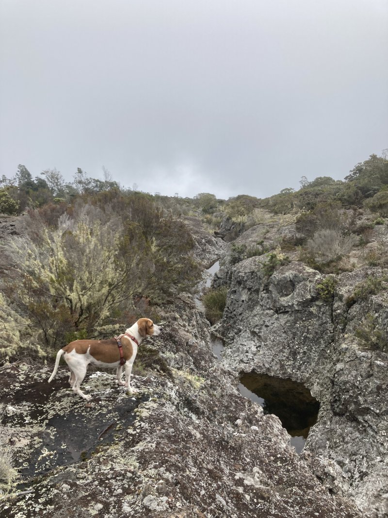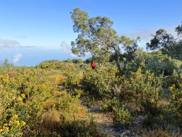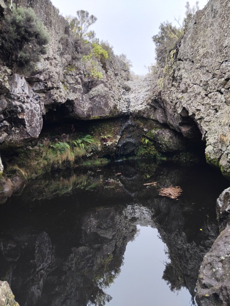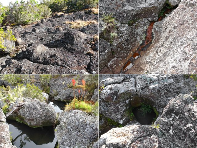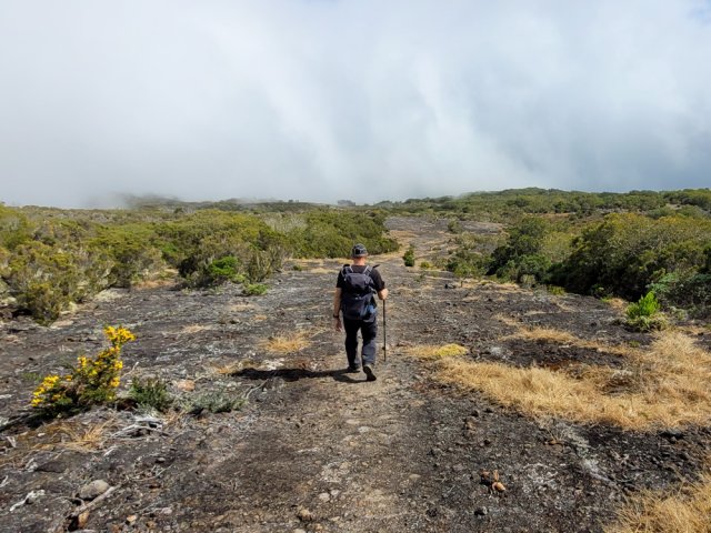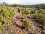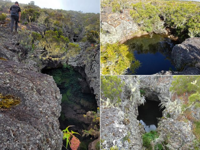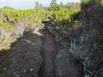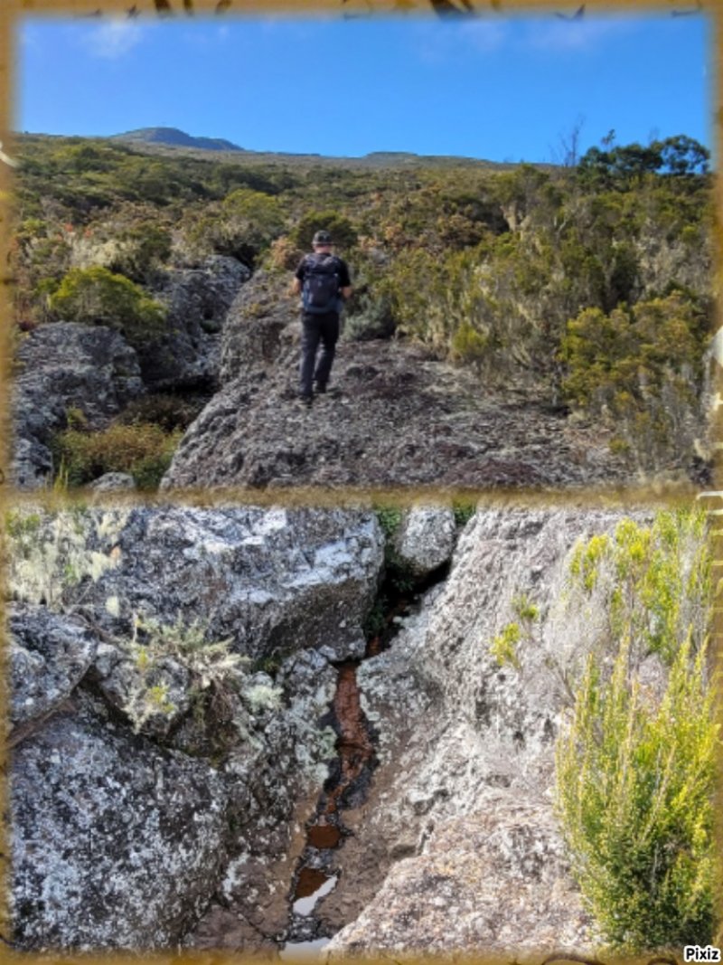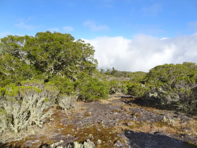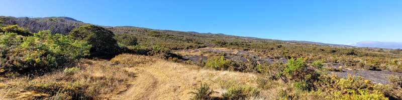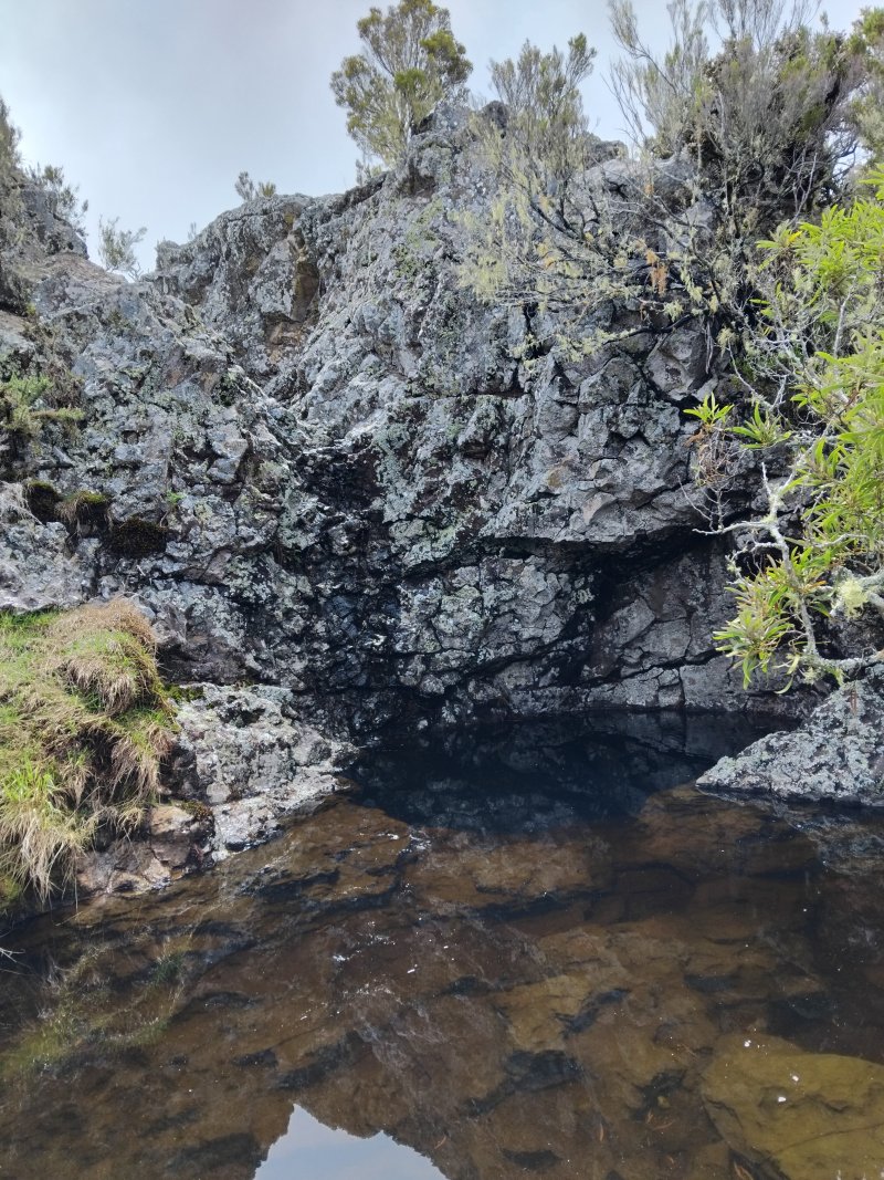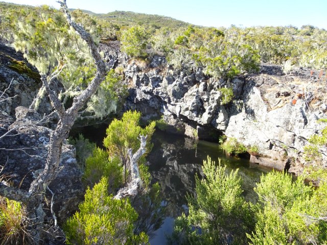 La randonnée débute à 30 m mètres du panneau indiquant le Pare-Feu Chemin de Bout, juste en face de la barrière bois fermant la piste VTT n° 11. L'étroit sentier qui n'est plus utilisé par les cyclistes attaque par une courte ascension du talus (Photo 1). Connu de certains randonneurs, il ne se perd jamais dans les hautes fougères du départ qui ont colonisé le sous-bois de tamarins des hauts (Photo 2). La traversée est un vrai plaisir au milieu de ces centaines d'arbres tous inclinés du même côté. La pente faible est régulière. Plus haut, les tamarins cessent et sont remplacés par les branles verts sur une trace creusée par des années de pneus à crampons (Photo 3). A l'approche de la Piste Forestière des 1800, on rencontre le type de sol que l'on foulera une bonne partie de la randonnée. Les branles sont clairsemés et le sol de plus en plus basaltique (Photo 4). Seuls les cinquante derniers mètres deviennent plus aléatoires en raison de la présence de touffes d'ajoncs. Le sentier devient donc moins visible si l'on décide de le pratiquer à l'envers. Pour cela, se baser sur le seul tamarin penché à quelques mètres de deux radiers bétonnés de la piste des 1800 (Photo 5). Emprunter la piste caillouteuse en partant vers la droite pour moins de deux km (Photo 7). Le sol est plat et la marche s'effectue à bon rythme en profitant de larges panoramas sur la planèze ou en direction de l'océan (Photo 8). Même sans indications, la Ravine la Source est facile à repérer à son cassé et son bassin profond à deux pas de la piste. On peut visiter une partie de l'aval en partant en rive droite sur les plaques et en slalomant entre les touffes de branles verts (Photo 9). Sur les 200 premiers mètres, on distingue peu le fond de la ravine mais on ne peut manquer la véritable forêt de tamarins. Quand ils cessent, il est possible de traverser le cours d'eau par un gué rocheux en prenant garde aux glissades si le sol est humide (Photo 10). Profiter des beautés et curiosités minérales le long de la ravine (Photo 11). Elle est constituée d'une succession de petits bassins au fond d'un canyon beaucoup moins profond que la partie amont qu'on visitera bientôt (Photo 12). Marcher ainsi à l'envie en fonction du paysage, des curiosités et faire demi-tour lorsque la végétation empêche de marcher sereinement. Traverser par un des gués puis entamer un retour en se dirigeant vers l'ancienne piste Bernica, piste VTT n° 9, de moins en moins empruntée par les sportifs. On devine pourtant encore quelques vestiges de la piste qui monte en pente douce (Photo 13). Rejoindre la Piste des 1800 et entreprendre cette remontée de ravine en rive droite. Le canyon est très étroit et devient de plus en plus profond au fur et à mesure de la montée. Les bassins d'eau noire se multiplient. Certains sont profonds et inaccessibles, voire dangereux si l'on venait à y chuter (Photo 14). La faille dépasse le plus souvent les 10 m et impossible de trouver un passage pour traverser (Photo 15). Comme les rives sont la plupart du temps exemptes de végétation, on ne se demande jamais où passer (Photo 16). Les bassins, grottes, cassés, trous se succèdent avec toujours cette obligation d'être très prudent en s'approchant du bord (Photo 17). L'allure n'est ralentie que pour photographier ou profiter du spectacle de la nature. Les touffes d'ajoncs deviennent plus nombreuses et d'importants cassés risquent de gêner la remontée guidée par le mirador du Piton Bernica (Photo 18). Il est donc préférable de traverser sur le seul gué trouvé à 2040 m d'altitude nécessitant quand même de descendre de deux mètres (Photo 19). La rive gauche est comme l'autre. Le sol comporte les mêmes touffes de branles et les mêmes espaces désertiques où il fait bon poser le pied (Photo 20). Au cours de la montée la végétation s'intensifie mais il y a toujours un étroit passage entre les touffes pour retrouver une zone aride. A 2100 m, on frôle l'imposant cratère du Piton Bernica envahi de tamarins (Photo 21). Sur la droite, on aperçoit l'observatoire, viser alors le grillage et le haut mur situés au nord (Photo 22). L'aventure se termine après le grillage lorsque l'on parvient à la route de l'observatoire et que l'on contourne le bâtiment très bien intégré au paysage. Partir sur la gauche puis marcher jusqu'à la piste menant au mirador du Piton Bernica. Au pied du mirador débute le sentier permettant de descendre vers la route du Maïdo. La descente un peu raide comporte de hautes marches de rochers au milieu des ajoncs et autres plantes (Photo 23). On atteint très vite la plaine pour suivre un large chemin basaltique naturel marqué de traces de peinture blanche (Photo 24). A la route, une halte est possible près des tables de pique-nique. Poursuivre sur la très large piste VTT où les engins doivent atteindre des vitesses incroyables (Photo 25). La descente est longue mais facile. On parvient à nouveau à la Piste des 1800, à l'endroit franchi deux heures auparavant. Partir sur la droite et bifurquer après un virage sur le sentier Lygdamis qui débute près de la Piste Bolon. Ce sentier commence presque à plat dans les herbes sous de superbes tamarins (Photo 26). La pente s'intensifie ensuite sans jamais devenir difficile. Les vélos ont tracé de multiples passages dans l'herbe (Photo 27). Plus on s'approche de la route forestière, plus la pente devient forte. La marche s'effectue entre les troncs de tamarins et sur un épais tapis de feuilles (Photo 28). Il se termine à la route que l'on emprunte en partant à gauche pour retrouver le véhicule. Ce dernier kilomètre de béton est totalement plat et bordé de chaque côté de verdure. On rejoint le parking en moins d'un quart d'heure.