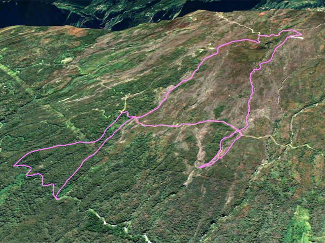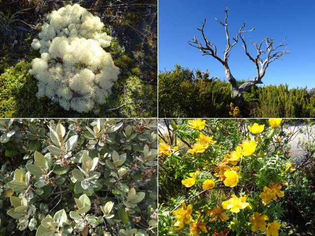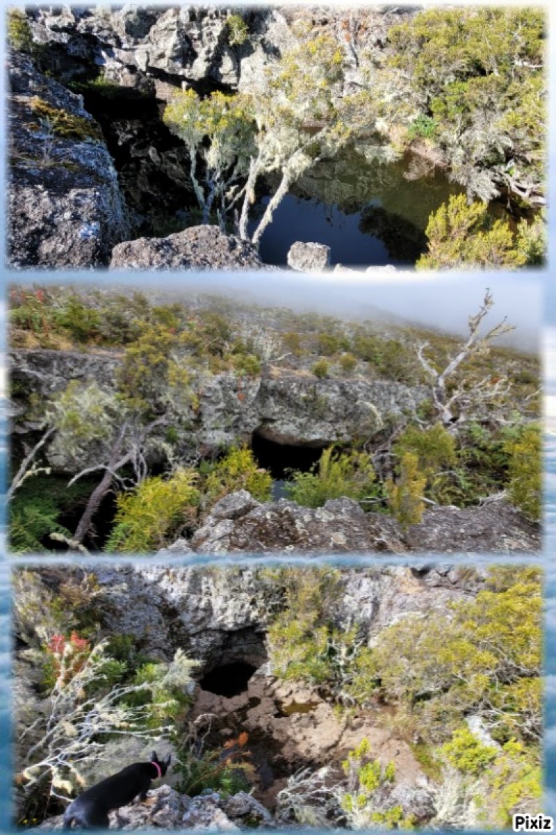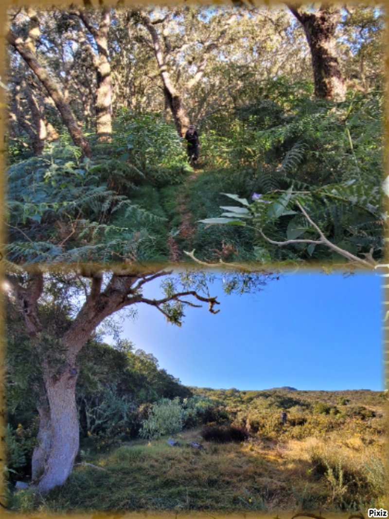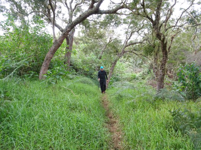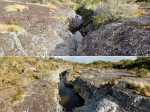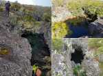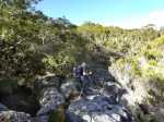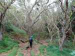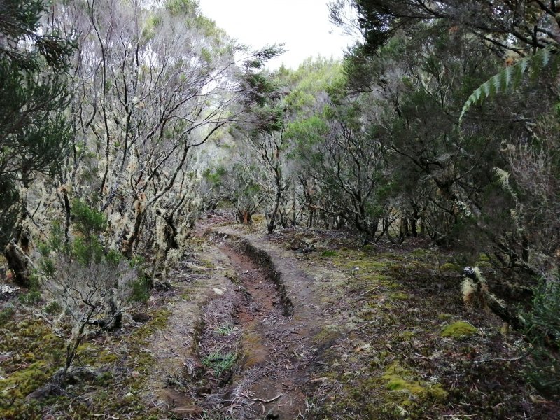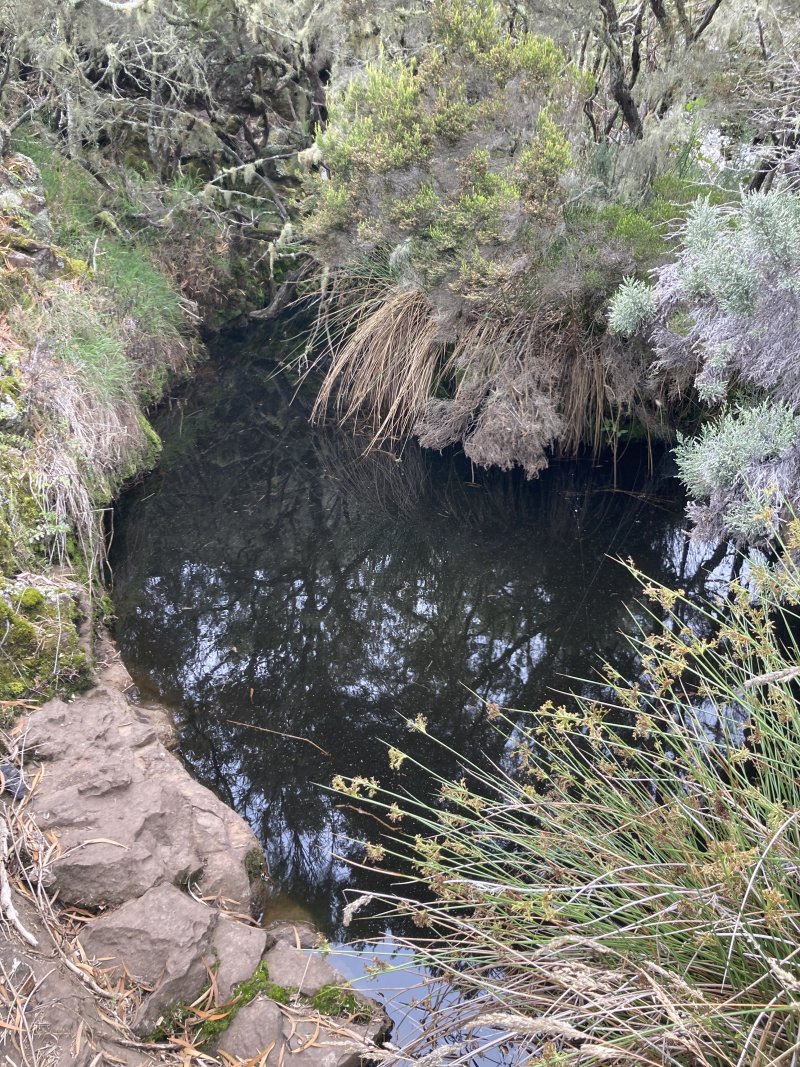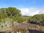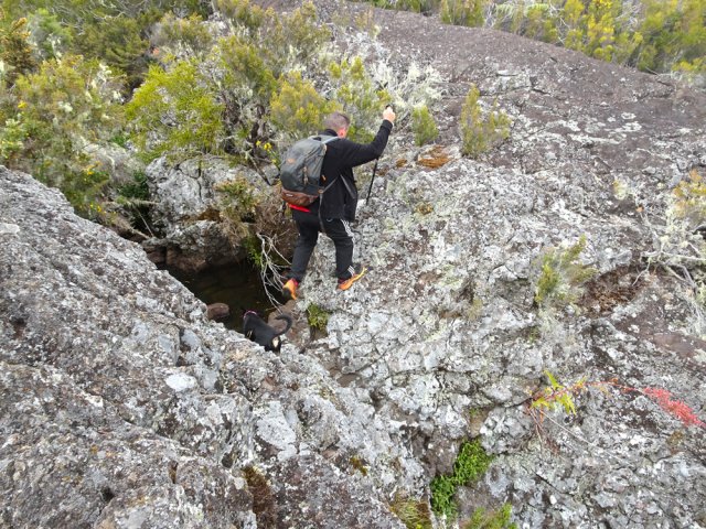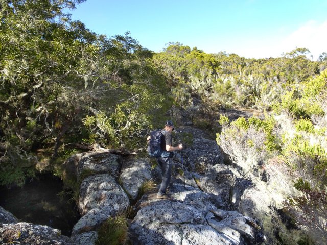 La randonnée débute à 30 m mètres du panneau indiquant le Pare-Feu Chemin de Bout, juste en face de la barrière bois fermant la piste VTT n° 11. L'étroit sentier qui n'est plus utilisé par les cyclistes attaque par une courte ascension du talus (Photo 1). Connu de certains randonneurs, il ne se perd jamais dans les hautes fougères du départ qui ont colonisé le sous-bois de tamarins des hauts (Photo 2). La traversée est un vrai plaisir au milieu de ces centaines d'arbres tous inclinés du même côté. La pente faible est régulière. Plus haut, les tamarins cessent et sont remplacés par les branles verts sur une trace creusée par des années de pneus à crampons (Photo 3). A l'approche de la Piste Forestière des 1800, on rencontre le type de sol que l'on foulera une bonne partie de la randonnée. Les branles sont clairsemés et le sol de plus en plus basaltique (Photo 4). Seuls les cinquante derniers mètres deviennent plus aléatoires en raison de la présence de touffes d'ajoncs. Le sentier devient donc moins visible si l'on décide de le pratiquer à l'envers. Pour cela, se baser sur le seul tamarin penché à quelques mètres de deux radiers bétonnés de la piste des 1800 (Photo 5). Emprunter la piste caillouteuse en partant vers la droite pour moins de deux km (Photo 7). Le sol est plat et la marche s'effectue à bon rythme en profitant de larges panoramas sur la planèze ou en direction de l'océan (Photo 8). Même sans indications, la Ravine la Source est facile à repérer à son cassé et son bassin profond à deux pas de la piste. On peut visiter une partie de l'aval en partant en rive droite sur les plaques et en slalomant entre les touffes de branles verts (Photo 9). Sur les 200 premiers mètres, on distingue peu le fond de la ravine mais on ne peut manquer la véritable forêt de tamarins. Quand ils cessent, il est possible de traverser le cours d'eau par un gué rocheux en prenant garde aux glissades si le sol est humide (Photo 10). Profiter des beautés et curiosités minérales le long de la ravine (Photo 11). Elle est constituée d'une succession de petits bassins au fond d'un canyon beaucoup moins profond que la partie amont qu'on visitera bientôt (Photo 12). Marcher ainsi à l'envie en fonction du paysage, des curiosités et faire demi-tour lorsque la végétation empêche de marcher sereinement. Traverser par un des gués puis entamer un retour en se dirigeant vers l'ancienne piste Bernica, piste VTT n° 9, de moins en moins empruntée par les sportifs. On devine pourtant encore quelques vestiges de la piste qui monte en pente douce (Photo 13). Rejoindre la Piste des 1800 et entreprendre cette remontée de ravine en rive droite. Le canyon est très étroit et devient de plus en plus profond au fur et à mesure de la montée. Les bassins d'eau noire se multiplient. Certains sont profonds et inaccessibles, voire dangereux si l'on venait à y chuter (Photo 14). La faille dépasse le plus souvent les 10 m et impossible de trouver un passage pour traverser (Photo 15). Comme les rives sont la plupart du temps exemptes de végétation, on ne se demande jamais où passer (Photo 16). Les bassins, grottes, cassés, trous se succèdent avec toujours cette obligation d'être très prudent en s'approchant du bord (Photo 17). L'allure n'est ralentie que pour photographier ou profiter du spectacle de la nature. Les touffes d'ajoncs deviennent plus nombreuses et d'importants cassés risquent de gêner la remontée guidée par le mirador du Piton Bernica (Photo 18). Il est donc préférable de traverser sur le seul gué trouvé à 2040 m d'altitude nécessitant quand même de descendre de deux mètres (Photo 19). La rive gauche est comme l'autre. Le sol comporte les mêmes touffes de branles et les mêmes espaces désertiques où il fait bon poser le pied (Photo 20). Au cours de la montée la végétation s'intensifie mais il y a toujours un étroit passage entre les touffes pour retrouver une zone aride. A 2100 m, on frôle l'imposant cratère du Piton Bernica envahi de tamarins (Photo 21). Sur la droite, on aperçoit l'observatoire, viser alors le grillage et le haut mur situés au nord (Photo 22). L'aventure se termine après le grillage lorsque l'on parvient à la route de l'observatoire et que l'on contourne le bâtiment très bien intégré au paysage. Partir sur la gauche puis marcher jusqu'à la piste menant au mirador du Piton Bernica. Au pied du mirador débute le sentier permettant de descendre vers la route du Maïdo. La descente un peu raide comporte de hautes marches de rochers au milieu des ajoncs et autres plantes (Photo 23). On atteint très vite la plaine pour suivre un large chemin basaltique naturel marqué de traces de peinture blanche (Photo 24). A la route, une halte est possible près des tables de pique-nique. Poursuivre sur la très large piste VTT où les engins doivent atteindre des vitesses incroyables (Photo 25). La descente est longue mais facile. On parvient à nouveau à la Piste des 1800, à l'endroit franchi deux heures auparavant. Partir sur la droite et bifurquer après un virage sur le sentier Lygdamis qui débute près de la Piste Bolon. Ce sentier commence presque à plat dans les herbes sous de superbes tamarins (Photo 26). La pente s'intensifie ensuite sans jamais devenir difficile. Les vélos ont tracé de multiples passages dans l'herbe (Photo 27). Plus on s'approche de la route forestière, plus la pente devient forte. La marche s'effectue entre les troncs de tamarins et sur un épais tapis de feuilles (Photo 28). Il se termine à la route que l'on emprunte en partant à gauche pour retrouver le véhicule. Ce dernier kilomètre de béton est totalement plat et bordé de chaque côté de verdure. On rejoint le parking en moins d'un quart d'heure.