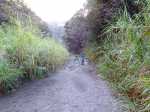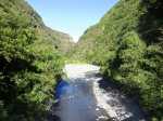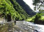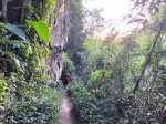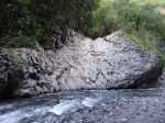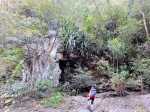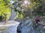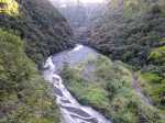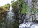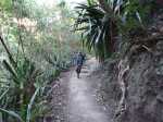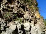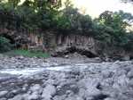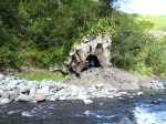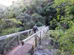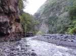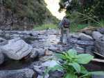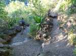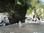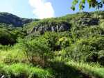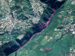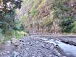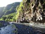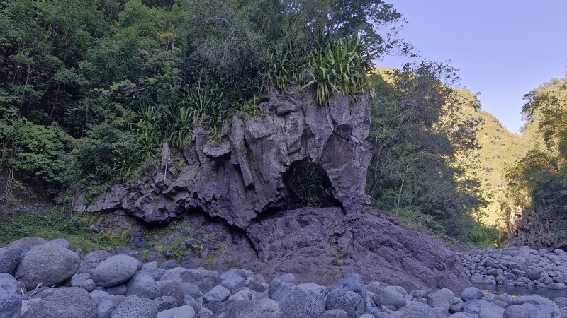 La randonnée débute à la fin de la Rue Hubert Delisle, au petit parking, toujours complet, situé au départ de sentier du Pont de La Liane. La descente débute immédiatement sur un sol alternant terre, pierre ou marches en bois. On s'approche du rempart mais on voit peu la rivière à travers la végétation. La pente est assez forte et le sentier descend en lacets plus ou moins longs (Photo 1). Après 100 m de descente il longe en corniche la falaise plein nord en direction du pont (Photo 2). Il borde une haute falaise où les coureurs n'ont pas réussi à créer des raccourcis entre les lacets comme un peu plus haut (Photo 3). Le parcours est assez plat. Les vues se multiplient sur la droite en direction du Bras de La Plaine et de la passerelle métallique qu'on devine au loin (Photo 4). Il ne faut plus que quelques minutes pour rejoindre l'ouvrage installé sur la partie la plus étroite de la rivière (Photo 5). Repérer l'aval de la vallée où va se dérouler la première partie de cette randonnée, traverser puis emprunter le sentier qui débute à gauche pour dévaler sous le pont par de hautes marches. Il se poursuit dans une faille basaltique avant d'arriver aux premiers galets. Plus d'itinéraire à respecter puisqu'on se retrouve en hors sentier. Pour économiser les chevilles, il est possible de partir vers la gauche sur les traces de l'ancienne piste édifiée pour la réparation du barrage du Bras de La Plaine. Il est bordé de hautes herbes qui ne tarderont pas à recouvrir le passage (Photo 6). La trace se rétrécit rapidement mais la progression est toujours possible. Plus loin, se rapprocher de la rivière qu'il faut traverser une première fois les pieds dans l'eau (Photo 7). Inutile de chercher à passer sans se mouiller car ces traversées vont se multiplier. Repérer dans le rempart les immenses surfaces de Merremia peltata, cette liane dangereuse pour l'environnement qui s'installe de plus en plus sur l'île et en recouvrira une grande partie dans quelques années (Photo 8). Les arbres qui soutiennent la liane sont condamnés par manque de lumière. La vallée se rétrécit, les falaises sont de plus en plus hautes et rapprochées. La rivière est large sur une pente facile pour marcher sans difficulté (Photo 9). Repérer dans la falaise les impressionnants bonsaïs qui n'ont que l'humidité dans les fissures pour se nourrir et subsister (Photo 10). La descente se poursuit en cherchant le meilleur endroit pour poser la semelle (Photo 11). On ne trouve pas de bassin propre à la baignade. On aperçoit bientôt un tuyau traversant la rivière et poursuivant sa course à flanc de falaise (Photo 12). Poursuivre et passer sous l'ouvrage situé assez haut pour éviter les crues dévastatrices de la rivière lors des cyclones (Photo 13). Une cascade attire le regard à une cinquantaine de mètres en aval. Elle est très haute, assez fine et se jette dans le Bras de La Plaine (Photo 14). Ce sont les eaux du Bras Long qui terminent ici leur course après avoir rempli plus haut le Bassin Sassa. Plus haut, dans la falaise, on devine un ouvrage édifié pour capter les eaux souterraines de la Source des Songes qui arrivent dans le Bras Long (Photo 15). En poursuivant plus loin, on rencontre une nouvelle petite chute et il est possible d'entrapercevoir le Pont de l'Entre-Deux en continuant un peu dans le lit encombré de galets. Repartir vers le Pont de La Liane en utilisant le même parcours. A l'approche du pont, il est possible, sans difficulté, de délaisser la vieille piste et de remonter sur les galets dans le lit de la rivière où le niveau de l'eau est très faible (Photo 16). A l'arrivée à la passerelle, la balade va pouvoir continuer en retrouvant le sentier dans sa faille basaltique (Photo 17). Remonter vers la passerelle pour apprécier le chemin parcouru (Photo 18). Partir vers l'îlet Crescent puis emprunter une des sentes descendant vers le cours d'eau. Entamer la remontée sur de gros galets dans le sable gris. Il faudra, comme dans la descente, franchir quelques fois la rivière bordée de plus en plus de belles concrétions basaltiques (Photo 19). L'Îlet Crescent domine la rivière sur un plateau entouré de falaises. Repérer également quelques grottes situées dans la falaise sous l'îlet Crescent (Photo 20). Dépasser la muraille basaltique de la dernière cascade du Bras de Pontho très souvent à sec (Photo 22). On s'approche assez rapidement de l'arche naturelle que l'on devine au loin en suivant au plus près les falaises (Photo 24). Ce pont naturel constitué d'orgues basaltiques biscornues couvertes de chocas peut s'atteindre en escaladant les roches qui le supportent (Photo 25). Cette arche à la forme si particulière est autant photographiée que les gorges en amont (Photo 26). Pour voir au mieux sa forme caractéristique, marcher un peu vers l'amont en traversant une dernière fois la rivière (Photo 27). Si le niveau de l'eau est assez faible, ne pas hésiter à poursuivre un peu le long de la rivière pour s'approcher du début des véritables gorges étroites. Sinon, reprendre le chemin inverse, regagner le Pont de La Liane puis remonter vers l'Entre-Deux par les multiples lacets qui coupent un peu les jambes après ces marches dans l'eau fraîche.
