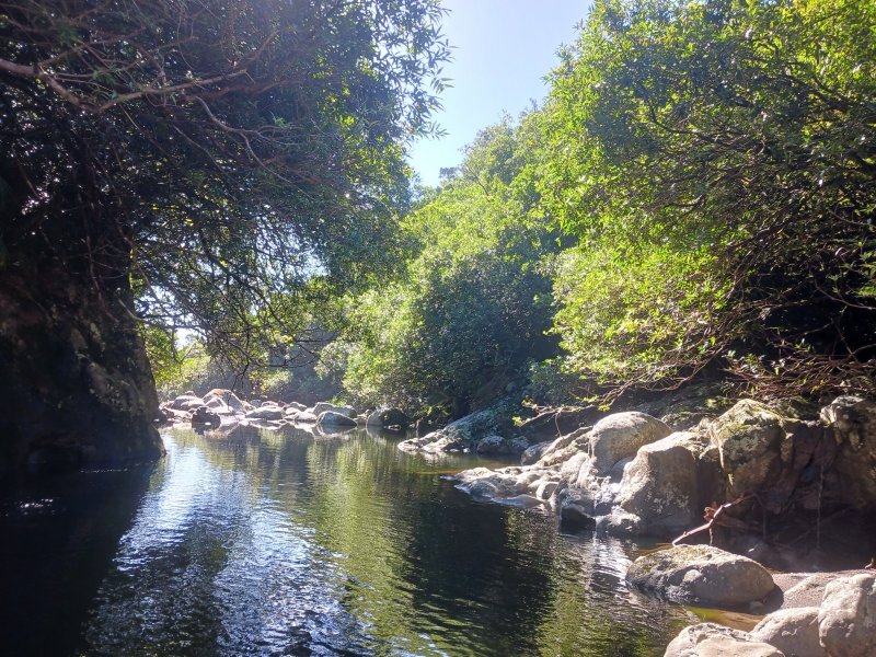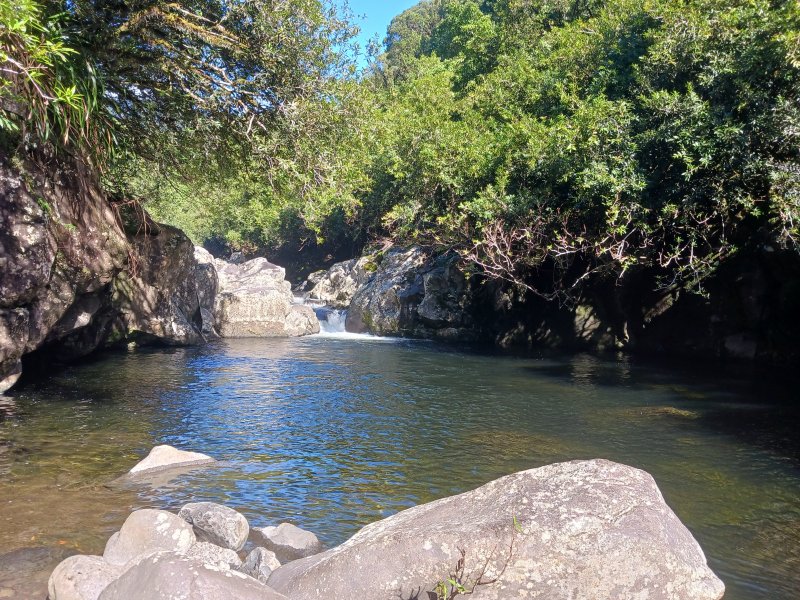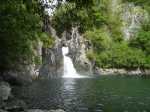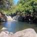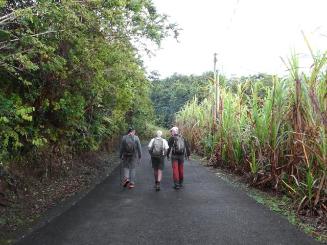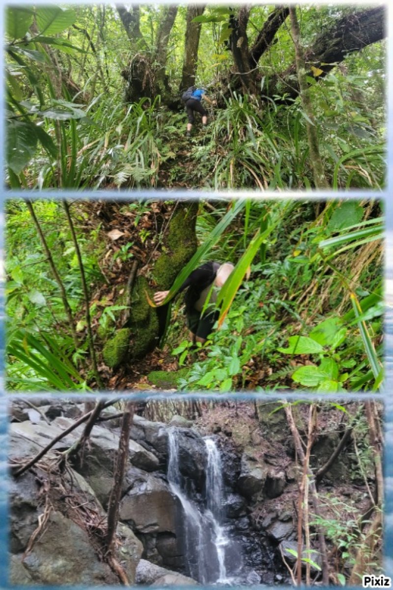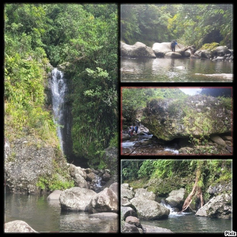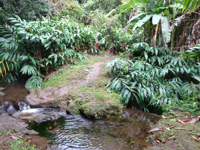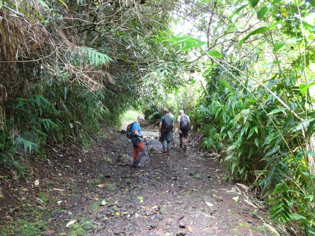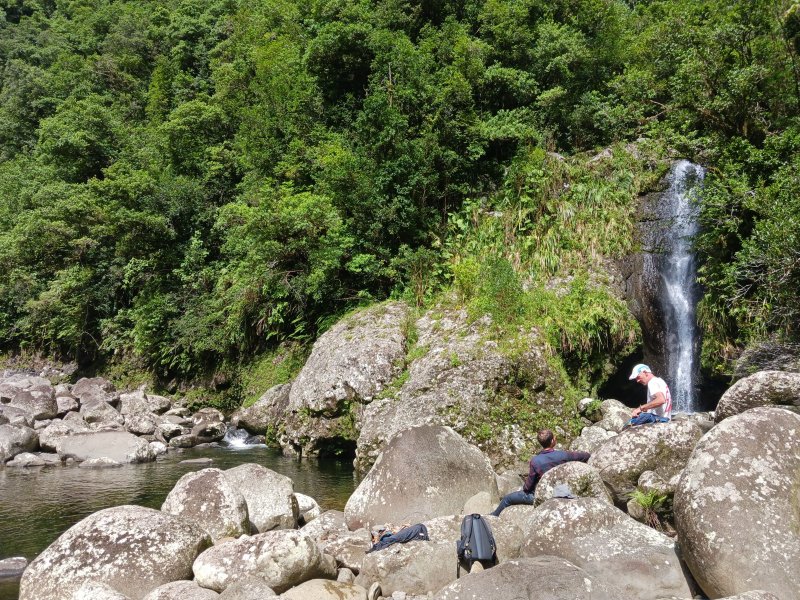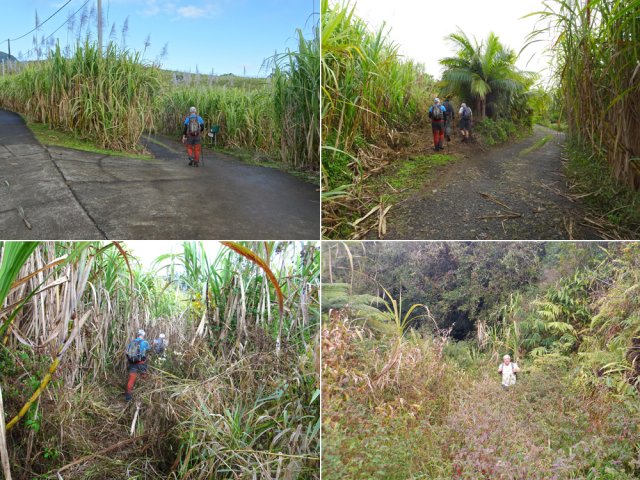 La randonnée débute sur le Chemin de Bellevue les Hauts (route de l'Eden et Cascade du Chien) que l'on a emprunté à partir de Vincendo. Plusieurs emplacements de stationnement se trouvent entre la piste de départ et celle du retour. La trace proposée commence près de la pancarte jaune du dernier parking. Il faudra obligatoirement effectuer la jonction en marchant sur la route, très peu fréquentée entre végétation assez fournie et champs de canne à sucre (Photo 1). Nombreuses sont les pistes débutant à gauche pour rejoindre des habitations ou propriétés privées. Voir la carte pour ne pas manquer celle partant vers le sentier. Emprunter une courte portion de cette large piste jusqu'aux quelques pieds de palmistes. Partir à gauche et suivre au mieux un chemin longeant les cannes, très envahi de végétation (Photo 2). Lorsque la piste, plus propre, fait un virage vers la gauche, chercher à droite le départ du sentier caché par les fougères (Photo 3). On est immédiatement surpris de trouver un sentier praticable après les 300 m effectués dans les hautes herbes pour y parvenir. Il descend entre les bois de couleurs très envahis par endroits de goyaviers (Photo 4). Le sol est terreux, parfois glissant recouvert aussi de feuilles tombées des arbres moussus (Photo 5). Des aménagements de qualité sont encore en bon état dans les parties les plus pentues (Photo 6). On rencontre une première bifurcation. Le sentier file droit en direction du Bras des Lianes. Prendre celui de droite partant à angle droit. Si le chemin parcouru jusqu'ici était en descente, ce nouveau sentier est plus facile car il longe souvent la courbe de niveau, n'effectuant des montées et descentes que pour le franchissement des ruisseaux. Plus loin, il descend également. On rencontre quelques passages délicats assez pentus et glissants lorsqu'ils sont humides (Photo 7). Le sentier traverse une zone ombragée occupée par des palmiers avant de rencontrer une ravine caillouteuse assez large qui se franchit à gué les pieds au sec (Photo 8). Toujours bordé de nombreux goyaviers il descend également au plus près de magnifiques spécimens de bois de rempart. Après 40 minutes de descente assez agréable dans ce sous-bois glissant, on se retrouve sur le sentier venant de la Rivière du Mât pour rejoindre le Bassin des Aigrettes. Les longoses cachent le départ du sentier pour les randonneurs désireux d'effectuer le parcours à l'envers. Pour être certain de ne pas le manquer, se repérer au petit ruisseau traversant le sentier et se poursuivant par une petite cascade (Photo 9). La suite est une balade en direction du bassin sur un très large sentier utilisé pour remonter vers la boucle du Bassin des Aigrettes (Photo 10). Plus loin, on rencontre le sentier venant de droite en longeant le bras depuis le village. Partir à gauche sur une forte montée et rejoindre en un petit quart d'heure le bassin que l'on peut atteindre en passant sur les gros rochers qui l'entourent (Photo 11). La chute est toujours aussi agréable dans son cadre végétal et minéral (Photo 12). Revenir un peu sur ses pas puis emprunter le sentier plus étroit mais tout aussi pentu qui remonte en direction du haut de la cascade (Photo 13). Il est possible de s'approcher du bord de la rivière pour apercevoir la chute précédant celle aperçue au bassin. Le canyon est étroit, le courant très fort, les berges glissantes, aussi, prendre garde à l'approche (Photo 14). Reprendre le sentier et entamer une courte montée qui éloigne un peu du torrent. Très vite, on trouve sur la droite une autre sente repartant vers le Bras des Lianes. Débute alors une remontée du cours d'eau qui offre déjà de très beaux bassins d'eau claire abritant quelques cabots bleus (Photo 15). L'étroite trace s'éloigne très rarement des berges. De rares rubalises rassurent lorsque l'on croit perdre la bonne direction (Photo 16). Quelques bassins méritent un arrêt pour apprécier la beauté des sites (Photo 17). Les falaises bordant le torrent empêchent parfois le sentier de passer au plus près. Il faut alors remonter un peu pour les contourner à travers les jamrosats (Photo 18). Le courant devient parfois plus violent mais il y a toujours un passage pour éviter les remous (Photo 19). Après 45 minutes de sentier, on arrive à une cascade coulant en rive gauche. On peut toujours suivre le sentier et ses rares rubalises pendant près de 30 minutes. Plus haut, il faut se rapprocher au plus près de l'eau et trouver le meilleur passage entre les rochers qui peuvent être glissants (Photo 20). Les rives s'élèvent et se rapprochent. Plus moyen d'échapper aux pieds dans l'eau et très vite, on réalise qu'il faudra se mouiller jusqu'à la poitrine (Photo 21). Il n'est pas trop tard pour renoncer en cas de panique ou du niveau trop haut qui imposerait de nager. Ces passages ralentissent considérablement la progression mais on arrive bientôt près d'un gigantesque rocher en travers du lit annonçant la fin proche de l'aventure. Franchir une dernière fois le Bras des Lianes en contournant l'énorme masse (Photo 22). Une cascade sur la droite sert de repère pour commencer à chercher le sentier remontant vers Bellevue les Hauts (Photo 23). L'endroit charmant invite à une pause avant la très sportive remontée. Repérer le départ du sentier près d'un gros rocher surmonté d'un cairn. Une fois reconnu, décider ou non en fonction du chrono, de poursuivre la remontée vers la Cascade du Chien à la recherche de nouveaux bassins ou chutes d'eau. Le sentier, principalement emprunté par les pêcheurs et canyonistes, est très facile à décrire : montée violente dans les pailles sabre et fougères où les mains s'avèrent aussi utiles que les pieds (Photo 25). Certains arbres méritent à eux seuls la pratique de ce sentier difficile (Photo 26). Compter 30 minutes pour avaler les 200 m de pente en utilisant les marches naturelles ou creu