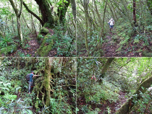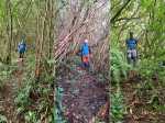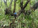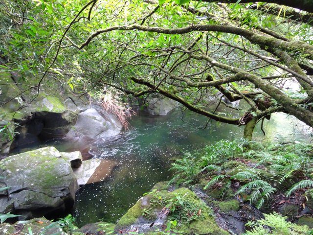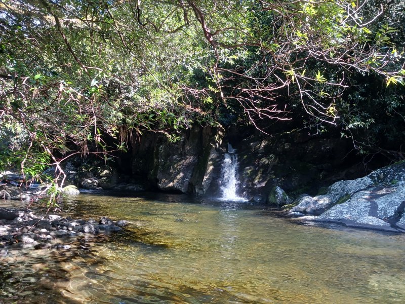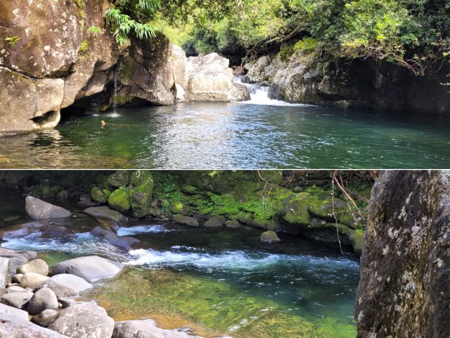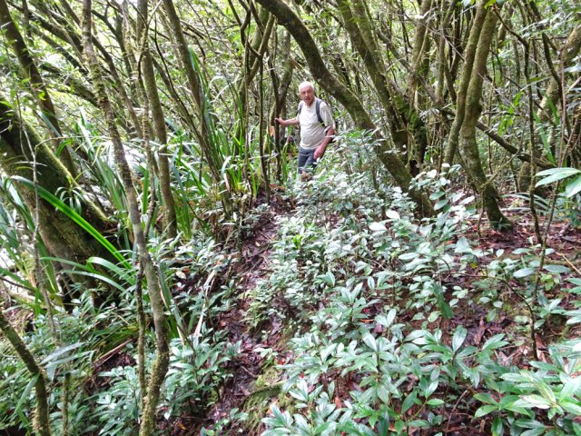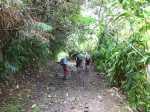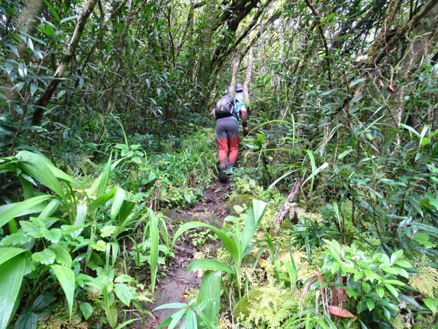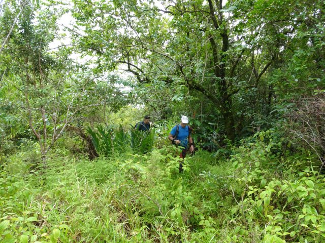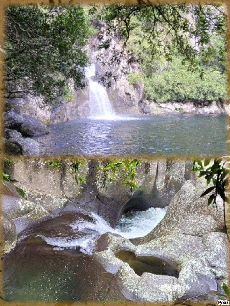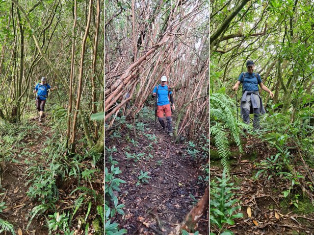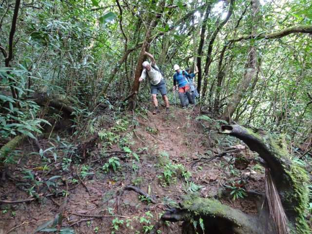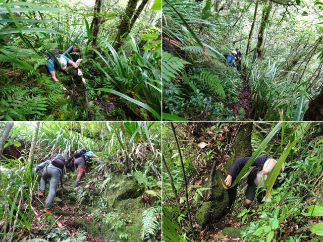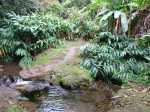 La randonnée débute sur le Chemin de Bellevue les Hauts (route de l'Eden et Cascade du Chien) que l'on a emprunté à partir de Vincendo. Plusieurs emplacements de stationnement se trouvent entre la piste de départ et celle du retour. La trace proposée commence près de la pancarte jaune du dernier parking. Il faudra obligatoirement effectuer la jonction en marchant sur la route, très peu fréquentée entre végétation assez fournie et champs de canne à sucre (Photo 1). Nombreuses sont les pistes débutant à gauche pour rejoindre des habitations ou propriétés privées. Voir la carte pour ne pas manquer celle partant vers le sentier. Emprunter une courte portion de cette large piste jusqu'aux quelques pieds de palmistes. Partir à gauche et suivre au mieux un chemin longeant les cannes, très envahi de végétation (Photo 2). Lorsque la piste, plus propre, fait un virage vers la gauche, chercher à droite le départ du sentier caché par les fougères (Photo 3). On est immédiatement surpris de trouver un sentier praticable après les 300 m effectués dans les hautes herbes pour y parvenir. Il descend entre les bois de couleurs très envahis par endroits de goyaviers (Photo 4). Le sol est terreux, parfois glissant recouvert aussi de feuilles tombées des arbres moussus (Photo 5). Des aménagements de qualité sont encore en bon état dans les parties les plus pentues (Photo 6). On rencontre une première bifurcation. Le sentier file droit en direction du Bras des Lianes. Prendre celui de droite partant à angle droit. Si le chemin parcouru jusqu'ici était en descente, ce nouveau sentier est plus facile car il longe souvent la courbe de niveau, n'effectuant des montées et descentes que pour le franchissement des ruisseaux. Plus loin, il descend également. On rencontre quelques passages délicats assez pentus et glissants lorsqu'ils sont humides (Photo 7). Le sentier traverse une zone ombragée occupée par des palmiers avant de rencontrer une ravine caillouteuse assez large qui se franchit à gué les pieds au sec (Photo 8). Toujours bordé de nombreux goyaviers il descend également au plus près de magnifiques spécimens de bois de rempart. Après 40 minutes de descente assez agréable dans ce sous-bois glissant, on se retrouve sur le sentier venant de la Rivière du Mât pour rejoindre le Bassin des Aigrettes. Les longoses cachent le départ du sentier pour les randonneurs désireux d'effectuer le parcours à l'envers. Pour être certain de ne pas le manquer, se repérer au petit ruisseau traversant le sentier et se poursuivant par une petite cascade (Photo 9). La suite est une balade en direction du bassin sur un très large sentier utilisé pour remonter vers la boucle du Bassin des Aigrettes (Photo 10). Plus loin, on rencontre le sentier venant de droite en longeant le bras depuis le village. Partir à gauche sur une forte montée et rejoindre en un petit quart d'heure le bassin que l'on peut atteindre en passant sur les gros rochers qui l'entourent (Photo 11). La chute est toujours aussi agréable dans son cadre végétal et minéral (Photo 12). Revenir un peu sur ses pas puis emprunter le sentier plus étroit mais tout aussi pentu qui remonte en direction du haut de la cascade (Photo 13). Il est possible de s'approcher du bord de la rivière pour apercevoir la chute précédant celle aperçue au bassin. Le canyon est étroit, le courant très fort, les berges glissantes, aussi, prendre garde à l'approche (Photo 14). Reprendre le sentier et entamer une courte montée qui éloigne un peu du torrent. Très vite, on trouve sur la droite une autre sente repartant vers le Bras des Lianes. Débute alors une remontée du cours d'eau qui offre déjà de très beaux bassins d'eau claire abritant quelques cabots bleus (Photo 15). L'étroite trace s'éloigne très rarement des berges. De rares rubalises rassurent lorsque l'on croit perdre la bonne direction (Photo 16). Quelques bassins méritent un arrêt pour apprécier la beauté des sites (Photo 17). Les falaises bordant le torrent empêchent parfois le sentier de passer au plus près. Il faut alors remonter un peu pour les contourner à travers les jamrosats (Photo 18). Le courant devient parfois plus violent mais il y a toujours un passage pour éviter les remous (Photo 19). Après 45 minutes de sentier, on arrive à une cascade coulant en rive gauche. On peut toujours suivre le sentier et ses rares rubalises pendant près de 30 minutes. Plus haut, il faut se rapprocher au plus près de l'eau et trouver le meilleur passage entre les rochers qui peuvent être glissants (Photo 20). Les rives s'élèvent et se rapprochent. Plus moyen d'échapper aux pieds dans l'eau et très vite, on réalise qu'il faudra se mouiller jusqu'à la poitrine (Photo 21). Il n'est pas trop tard pour renoncer en cas de panique ou du niveau trop haut qui imposerait de nager. Ces passages ralentissent considérablement la progression mais on arrive bientôt près d'un gigantesque rocher en travers du lit annonçant la fin proche de l'aventure. Franchir une dernière fois le Bras des Lianes en contournant l'énorme masse (Photo 22). Une cascade sur la droite sert de repère pour commencer à chercher le sentier remontant vers Bellevue les Hauts (Photo 23). L'endroit charmant invite à une pause avant la très sportive remontée. Repérer le départ du sentier près d'un gros rocher surmonté d'un cairn. Une fois reconnu, décider ou non en fonction du chrono, de poursuivre la remontée vers la Cascade du Chien à la recherche de nouveaux bassins ou chutes d'eau. Le sentier, principalement emprunté par les pêcheurs et canyonistes, est très facile à décrire : montée violente dans les pailles sabre et fougères où les mains s'avèrent aussi utiles que les pieds (Photo 25). Certains arbres méritent à eux seuls la pratique de ce sentier difficile (Photo 26). Compter 30 minutes pour avaler les 200 m de pente en utilisant les marches naturelles ou creu