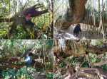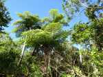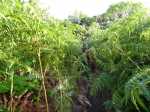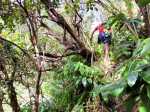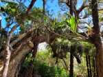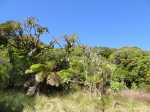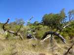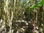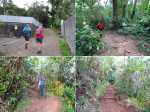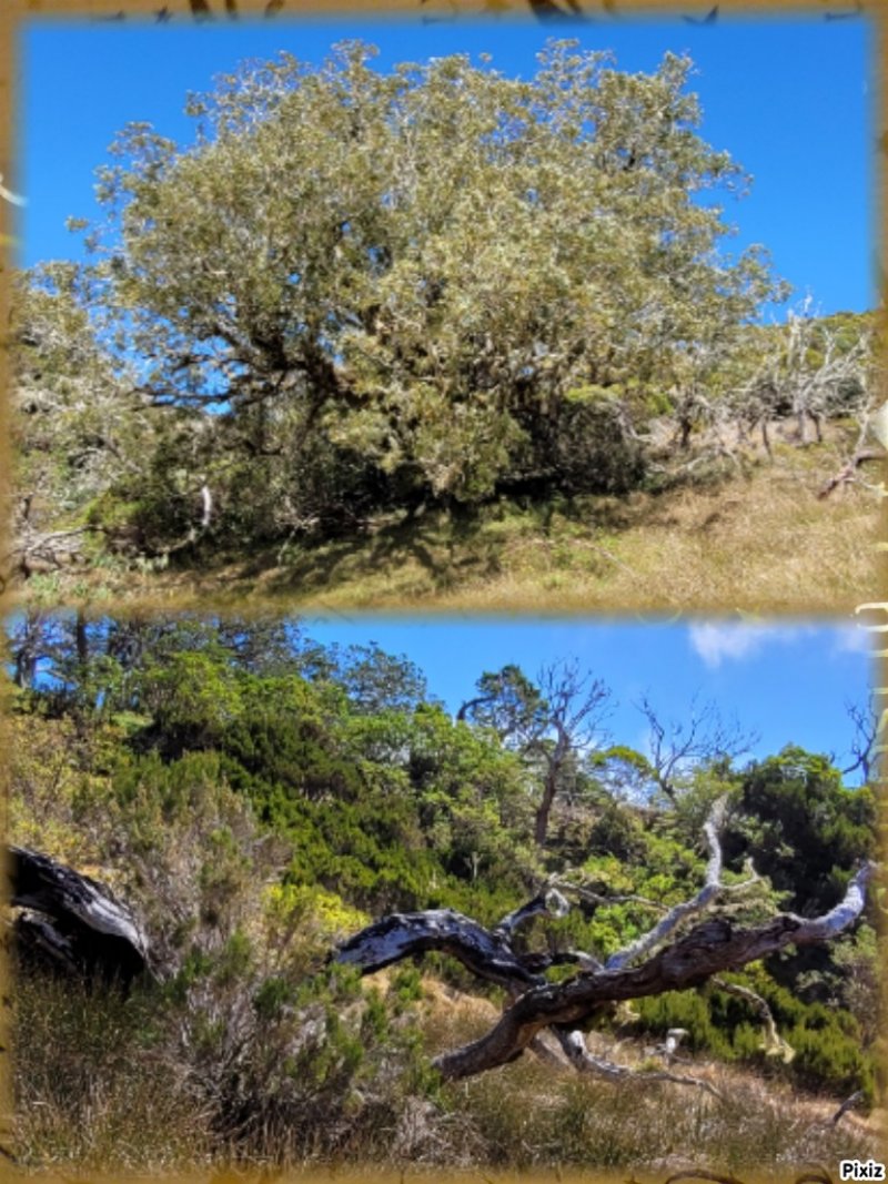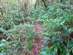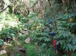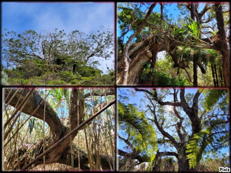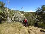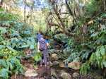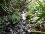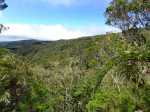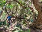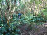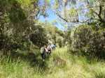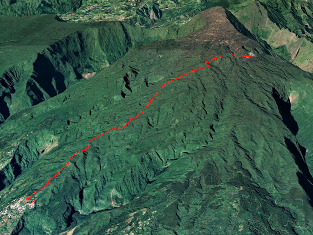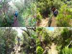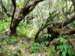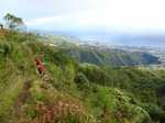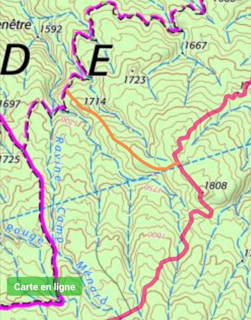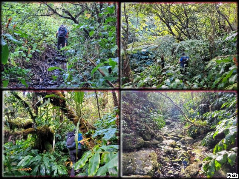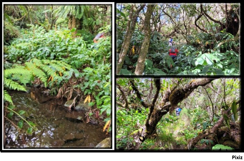 La randonnée débute aux citernes, à la fin de la Route du Piton. La montée est raide sur le béton jusqu'aux champs d'ananas qui semblent de plus en plus abandonnés. Partir à gauche, traverser l'aire de repos puis remonter par le sentier du Pic Adam qui est toujours bien entretenu entre goyaviers, filaos et déjà les premières touffes de longoses (Photo 1). La montée est sérieuse sans jamais être difficile. Quelques haltes sont possibles avant d'arriver au point de vue pour profiter des panoramas sur Saint-Denis (Photo 2). Poursuivre après le point de vue officiel et traverser de nouvelles zones envahies de goyaviers et de plus en plus de branles verts (Photo 3). Passer les deux échelles puis parvenir, une bonne heure après le départ, au grand virage à droite vers la Ravine Blanche pour poursuivre sur la boucle du Pic Adam. Marcher 100 m et repérer le discret sentier s'enfonçant à gauche dans les longoses et bois de couleurs (Photo 4). La pente est faible et la trace encore visible malgré la végétation. Les longoses ont envahi le sous-bois et il vaut mieux s'y habituer jusqu'à l'altitude de 1500 m. Quelques goyaviers cherchent encore leur place au milieu de cette jungle moussue (Photo 5). Plus loin, l'inquiétude peut naître avec l'arrivée de hautes fougères piétinées par les passages de quelques marcheurs connaissant le coin. Heureusement, cette traversée ne fait qu'une cinquantaine de mètres ne retardant pas la progression (Photo 6). Puis ce sont quelques cryptomerias qui occupent le terrain avant de rencontrer une petite ravine étroite au fond couvert de galets glissants. Il faut obligatoirement la remonter ou l'éviter de quelques mètres sans glisser ni mouiller les chaussures (Photo 7). Bifurquer à gauche au premier confluent et continuer dans les longoses. Une courte zone couverte de vigne marronne impose de sortir sécateur ou coupe-coupe pour arrondir le tunnel végétal. Les portions de sentiers se succèdent dans les longoses ou de grandes surfaces de bois de négresse (Photo 8). Heureusement, d'autres parties sont encore très bien marquées et font gagner du temps pour la progression (Photo 9). Les pailles sabres prennent le relais par endroits en cachant à nouveau une partie du sentier où l'on repère encore des marches bien taillées dans la terre ou soutenues de rondins. Parmi toutes les ravines rencontrées, peu ont de l'eau. L'une d'entre elle remplit un bassin par une chute discrète (Photo 10). Les pimpins des hauts deviennent de plus en plus présents le long du sentier ainsi que de grands fanjans qui apprécient l'humidité des lieux (Photo 11). Une descente un peu acrobatique de deux ou trois mètres est nécessaire pour rejoindre le fond d'une profonde ravine longée par le sentier en rive gauche (Photo 12). Très vite il faut à nouveau emprunter le fond comportant des blocs beaucoup plus gros et glissants que la première. Puis ce sont les branles verts qui dominent. Le sentier à travers ces arbres moussus et biscornus est encore assez visible (Photo 13). La montée est régulière malgré les nombreuses descentes et remontées de rives de ravines. Les passages dangereux sont très rares ou bien protégés par la végétation (Photo 14). Le sentier traverse une zone ombragée sous les premiers tamarins, fréquentée par les cervidés qui semblent y venir régulièrement comme le montrent les fumées au sol (Photo 15). On pénètre dans une petite clairière herbeuse, sous les premières grosses colonies de calumets. Repérer sur les branles les belles orchidées et essayons de ne pas piétiner les quelques orchidées palmiers rencontrées le long du sentier de plus en plus difficile à suivre (Photo 16). On atteint le point 1734 mais il reste encore beaucoup de chemin à parcourir. Les panoramas sont rares et surtout orientés sur l'immense Forêt Départementale Domaniale de la Roche Ecrite (Photo 17). Le sentier est devenu très difficile à suivre surtout dans les calumets (Photo 18). Quelques traces de peinture orange sur les troncs rassurent par moments. Seul le GPS peut rassurer vraiment ou réorienter pour ramener sur des tronçons de sentier que l'on reconnait sur de courtes portions. Ne pas manquer de superbes tamarins caractéristiques qui permettent de souffler durant les prises de vues (Photo 19). Certains sont énormes et servent même d'abris aux braconniers qui laissent dessous les restes de leurs passages (Photo 20). Difficile de se guider à travers les fougères et les calumets (Photo 21). Les petites clairières sont ensuite remplacées par de grandes prairies où les cerfs doivent s'en donner à cœur joie une fois le soir venu (Photo 22). De grandes caisses métalliques contiennent le poison distribué généreusement aux rats qui évoluent ici par milliers et créent d'énormes dégâts dans les nichées en général et celles des tuit-tuit en particulier. Les clairières sont bordées d'immenses pieds de fleurs jaunes ou d'ambavilles qui atteignent ici des tailles record. On a déjà repéré des rubalises depuis les derniers calumets et elles ne manqueront plus jusqu'à la fin de la randonnée. Traverser de nouvelles clairières, marcher entre les tamarins et branles en suivant les traces rouges des rubalises (Photo 23). La végétation change encore. Les tamarins sont toujours aussi impressionnants, debout ou couchés (Photo 24). On circule le plus souvent de clairière en clairière bordées de haute végétation des hauts (Photo 25). Une forte descente permet de traverser la Ravine Camp Ménard. Sur l'autre rive, quelques carcasses de tamarins terrassés par les incendies viennent rappeler la fragilité de la nature (Photo 27). Les aboiements des chiens du gîte se font entendre. Il ne faut que quelques minutes pour rejoindre le sentier de l'héliport et les premiers bâtiments du gîte de la Plaine des Chicots.