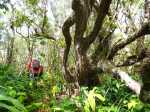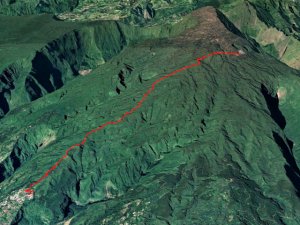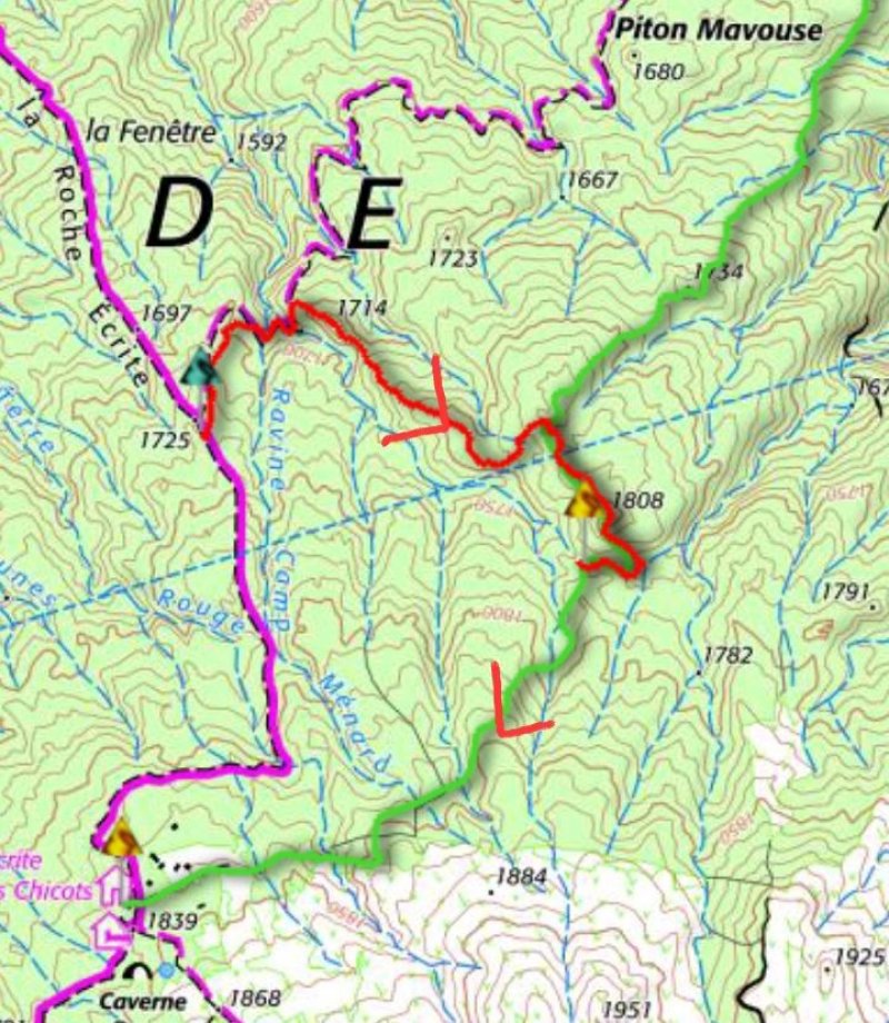 La Roche Ecrite est une destination très bien desservie par de multiples sentiers venant de nombreuses directions. Quelques décennies en arrière, l'un d'entre eux débutait à la boucle du Pic Adam puis rejoignait le gîte de la Plaine des Chicots en contournant le Piton Mavouse par l'est. Abandonné, rendu à la végétation, il demeure cependant des traces encore bien visibles pour les yeux des habitués de ce genre d'expédition. Sportivement, l'ascension n'est guère plus difficile que certaines autres malgré les 1100 mètres de dénivelé entre Bois de Nèfles et le gîte. Techniquement, c'est une toute autre affaire. Ne quitter le sentier du Pic Adam qu'en étant certain d'être sur la bonne trace. Ne jamais quitter des yeux l'ancien passage qui peut être large et pourvu de marches ou étroit et dévoré par les longoses. Le parcours se divise en trois tronçons : la première partie est encore correcte et pose peu de questionnement, la dernière est balisée par les organismes chargés d'éradiquer les rats de la forêt. La partie centrale, entre 1500 et 1800 m, demande un entraînement certain et une maîtrise de l'orientation. Le GPS est ici fortement recommandé pour éviter de se retrouver au sommet du Piton Mavouse ou près des cascades amont de la Ravine du Chaudron. La moyenne horaire est similaire aux autres aventures proposées sur ce site, c'est à dire environ 1km/h. On trouve fréquemment des traces de passage du cerf de Java dès que l'on rencontre les premiers tamarins des Hauts. S'il est possible d'entendre des tuit-tuit communiquer, il est en revanche plus difficile de les apercevoir tout comme les rats qui savent se cacher au moindre frémissement du sol sous la chaussure du randonneur. Bien évidemment, on ne partira jamais seul sur un tel itinéraire qui multiplie à chaque pas les occasions de s'égarer, de glisser sur les roches humides ou de chuter d'un sentier étroit difficile à distinguer. Partir très tôt en cas de retour dans la même journée au point de départ de Bois de Nèfles et prévoir 10 heures minimum.