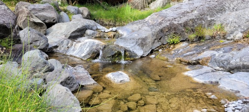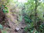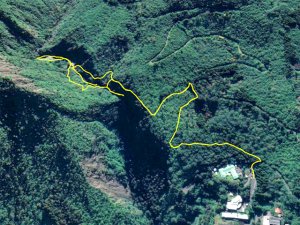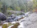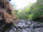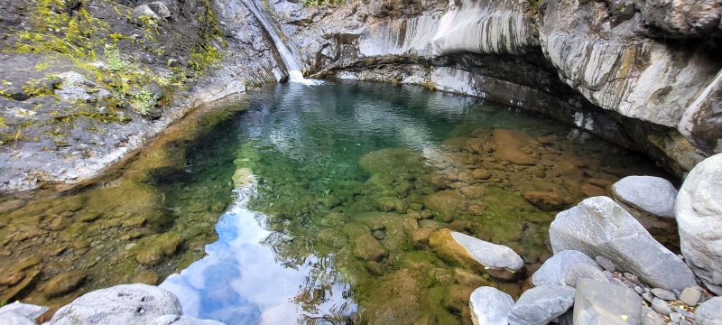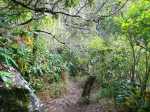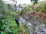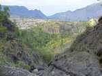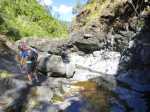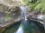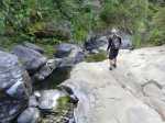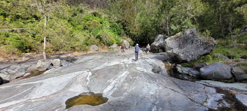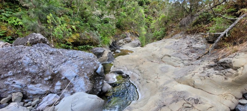 La randonnée débute à deux pas de l'Hôtel des Thermes. Rejoindre l'entrée du bâtiment et se diriger vers une grande fresque de Jace résumant le thermalisme en quelques dessins humoristiques (Photo 1). Emprunter le sentier qui jouxte le local décoré et suivre ce petit sentier jusqu'au principal qu'on aurait pu prendre à la route de Bras Sec. Il effectue quelques virages à angle droit avant de s'approcher de la piste forestière et de l'aire de pique-nique en longeant la lisière de cryptomerias (Photo 2). Partir sur la gauche après l'aire puis remonter vers le GRR1 en marchant vers le Plateau des Chênes. Le sentier, en très bon état, passe entre quelques pins mais très peu de chênes (Photo 3). A l'approche de la très discrète Ravine Prudent, guetter sur la gauche un départ de sentier tout aussi discret (Photo 4). Il plonge dans une mer de longoses laissant tout de même visible la trace empruntée par les canyonistes (Photo 5). On parvient très vite au Bras des Etangs que l'on domine de quelques mètres sans possibilité de le rejoindre (Photo 6). La descente dans le lit s'effectue après avoir passé le tuyau, qui franchit le petit canyon, attaché à un câble (Photo 7). On parvient au bras sur quelques plaques basaltiques encombrées de rochers (Photo 8). La descente vers la cascade s'effectue sans problème sur ces plaques, sans mouiller les pieds (Photo 9). On arrive très vite au haut de la cascade l'Eau Chaude qu'on peut approcher en prenant garde à la glissade (Photo 10). On a, depuis les roches, une vue très dégagée sur Cilaos et une bonne partie du cirque en direction du Dimitile, de la Fenêtre des Makes et de la mer (Photo 11). On se trouve à quelques mètres de la trace venant du pied de la cascade. Après avoir profité des panoramas, entreprendre la remontée du bras. On retrouve les mêmes facilités pour la marche si le niveau de l'eau est assez bas (Photo 12). Quelques petites chutes d'eau viennent égayer la montée (Photo 13). On pénètre petit à petit dans le canyon qu'on dominait en arrivant (Photo 14). Passer sous le tuyau et poursuivre sur une portion plus rocheuse (Photo 15). On se retrouve très vite devant le Bassin Bleu qui tire surtout sur le vert. Il est peu profond et alimenté par un toboggan (Photo 16). Le bassin est bordé d'une haute falaise en rive gauche et d'une barre rocheuse en rive droite. Le passage pour contourner le bassin est facile à deviner au niveau du bassin. Grimper sur les roches puis poursuivre en rive droite en longeant un sentier bien marqué (Photo 17). On devine le trajet que l'on effectuera en fin de randonnée pour s’approcher du toboggan en suivant la ravine (Photo 18). Une forte grimpette amène à un sous-bois avant de retrouver rapidement le GRR1. Partir à droite sur ce sentier en forte descente par endroits (Photo 19). Sur la fin, il comporte quelques roches qui ne ralentissent pas la marche (Photo 20). Le GRR1 traverse le Bras des Etangs sur un gué facile à négocier malgré les plaques qui peuvent être glissantes. Ne pas hésiter à partir vers l'amont visiter le lit du bras très large et constitué de vastes plaques basaltiques (Photo 22). Deux grosses roches marquent le début de la remontée de la rivière pour qui aime ce genre d'exercice (Photo 23). Quand l'eau est propre, certains des petits bassins incitent à la trempette (Photo 24). On peut rester ici autant de temps que nécessite le repos éventuel. Reprendre le chemin inverse jusqu'au gué. Entamer ensuite la courte descente en cherchant le meilleur passage sans danger. Il faut contourner une petite chute en sautant de roche en roche (Photo 25). La marche, là aussi, est facilitée par l'absence de roches au sol (Photo 26). On atteint en quelques minutes le rocher utilisé pour remonter par les roches en rive droite (Photo 27). La descente prend obligatoirement fin en arrivant au toboggan alimentant le Bassin Bleu (Photo 28). Les canyonistes descendent ce toboggan mais ils sont munis de combinaisons. De plus, une fois dans le bassin, il faudrait refaire toute la boucle précédente pour revenir sur ses pas. Reprendre donc la remontée jusqu'au gué puis partir à droite sur le GRR1. On retrouve très vite la Ravine Prudent et le petit sentier. La fin du parcours a déjà été empruntée en débutant la petite boucle.