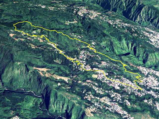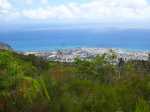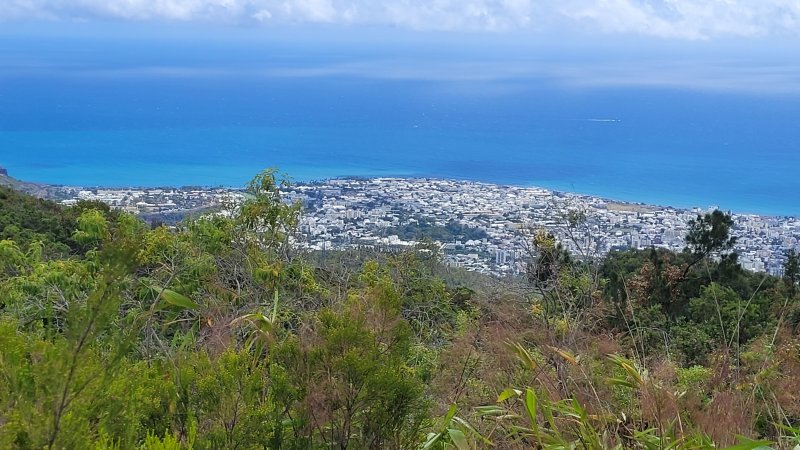 Quelques sentiers connus dans les hauts de Saint-François pour rejoindre le Morne St-François ou se balader sur le Sentier Laverdure ont déjà été présentés ici. D'autres n'apparaissant pas sur les cartes permettent de proposer de nouvelles idées de sorties. L'un d'entre eux passe au plus près du sommet discret du Piton du Butor. Un autre relie la D43 au quartier de Comète. Ils ne sont pas égaux en difficulté ni en entretien. Pour ne parcourir que les sentiers, il faudra prendre le bus jusqu'au dernier arrêt de Macassis. A pied sur la totalité de la boucle, il sera indispensable d'enchaîner les dizaines de lacets du Chemin Macassis. Pourtant, même les grands allergiques au goudron ou au béton trouveront de l'intérêt à cette grimpée de plus de 500 m entre grosses touffes de bambous, jardins fleuris et beaux points de vue sur la ville blanche du chef-lieu. Un coupe-coupe dans le sac à dos pourra s'avérer utile pour élaguer quelques goyaviers du sentier du Piton du Butor même si la trace se voit très bien. On traverse un endroit couvert d'azalées de toutes les couleurs. Les autres sentiers sont en bon état, connus et pratiqués principalement par les sportifs. Le dernier de la descente se termine à une aire de jeux et de pique-nique assez difficile d'accès autrement qu'à pied. Il faudra, pour terminer, retrouver la route avant d'attaquer la dernière montée du Raidillon de Saint-François, une longue série de marches sur de nombreux raccourcis évitant les lacets de la route. Dans la descente, il est possible de s'éloigner un peu du parcours et d'accéder en quelques minutes à un belvédère rudimentaire offrant une magnifique vue sur la cascade de la Ravine du Butor.