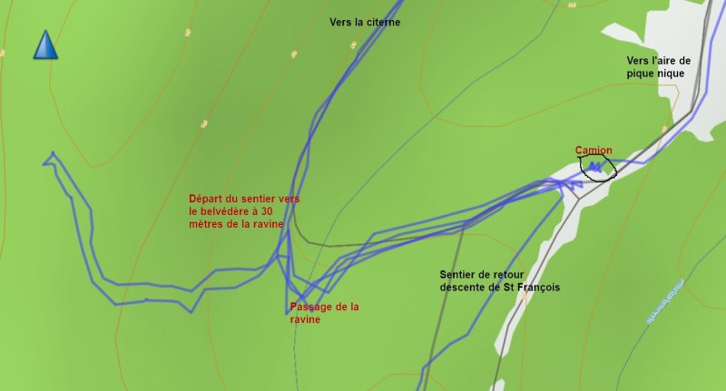 Depuis le Boulevard Sud de Saint-Denis, rouler en direction de Saint-François puis monter jusqu'à l'église du village - Entamer la montée par les escaliers et entreprendre la très longue jonction avec le Sentier Laverdure par le sinueux Chemin Macassis - Emprunter le Sentier Laverdure jusqu'à 1000 m et bifurquer à droite sur le discret sentier passant au Piton du Butor - Descendre jusqu'à la D43 - Partir à droite et récupérer le sentier suivant dans un lacet de la route - Suivre ce sentier jusqu'à la piste repérable à la carcasse d'un vieux camion - Effectuer ou non l'aller-retour jusqu'au point de vue sur la cascade de la Ravine du Butor puis revenir à la carcasse - Entamer la dernière descente sur une large piste passant plus bas par l'aire de jeux et de repos - Prendre à droite le Chemin de la Glacière puis la Route de St-François sur 100 m - Repérer et emprunter le Raidillon de Saint-François pour remonter jusqu'à l'église, fin de la boucle.