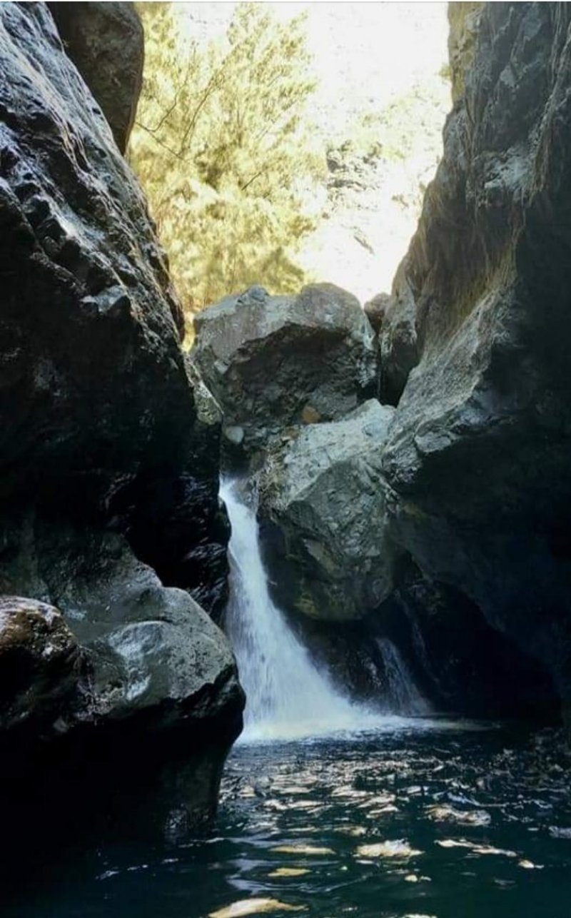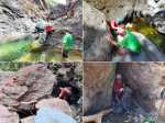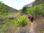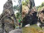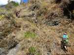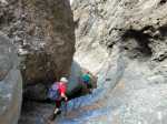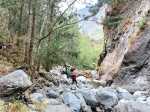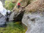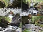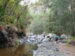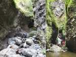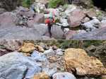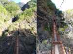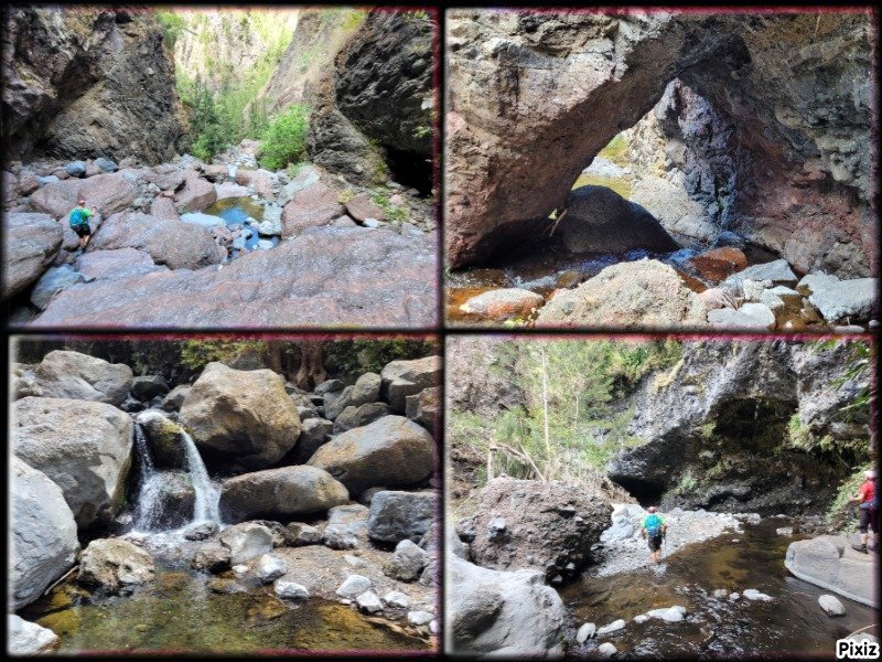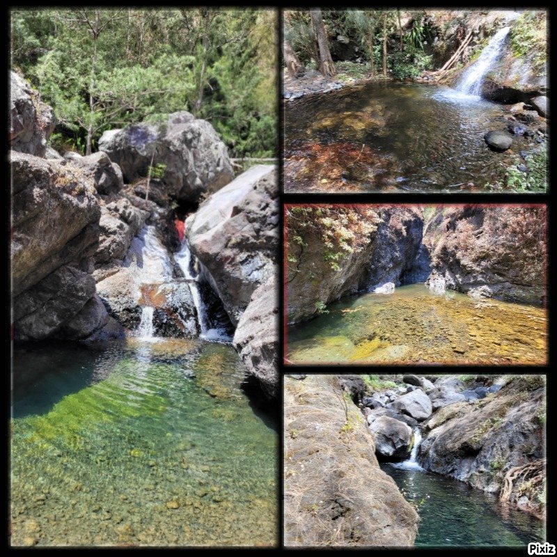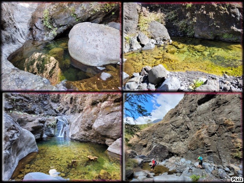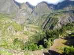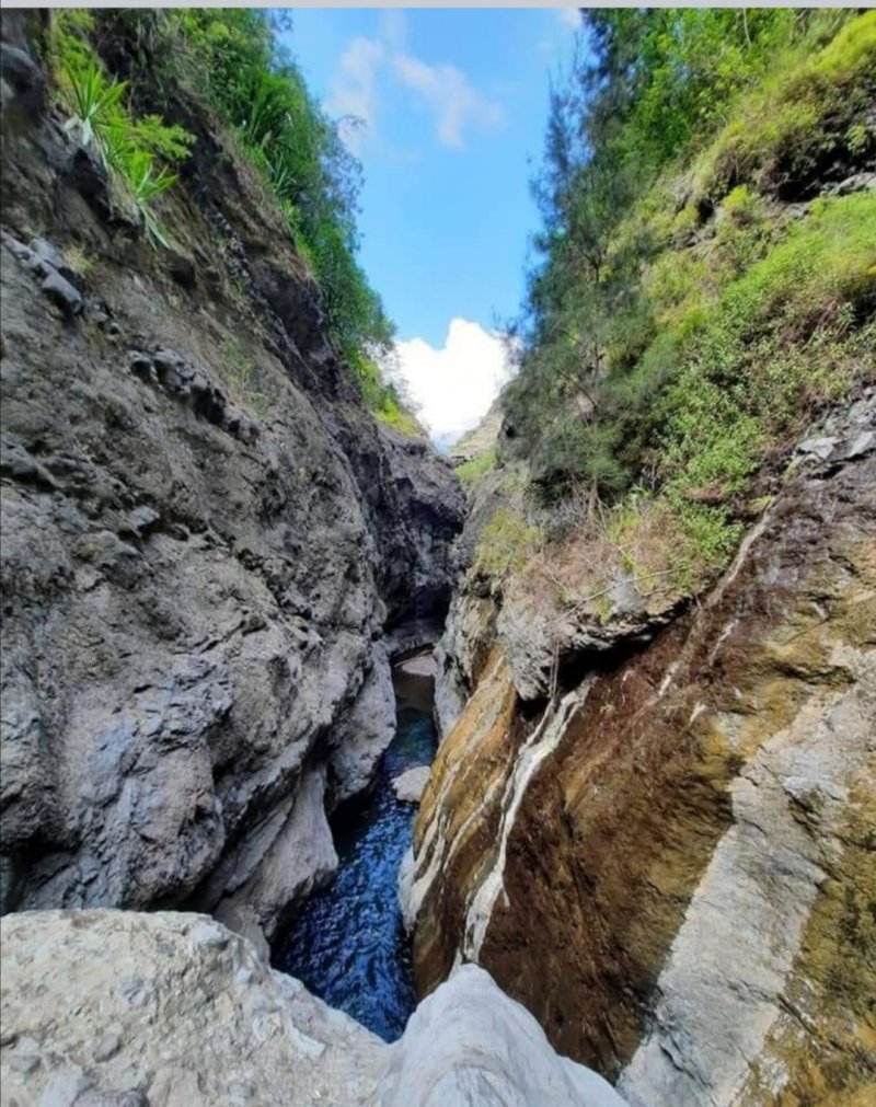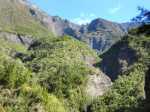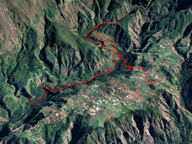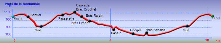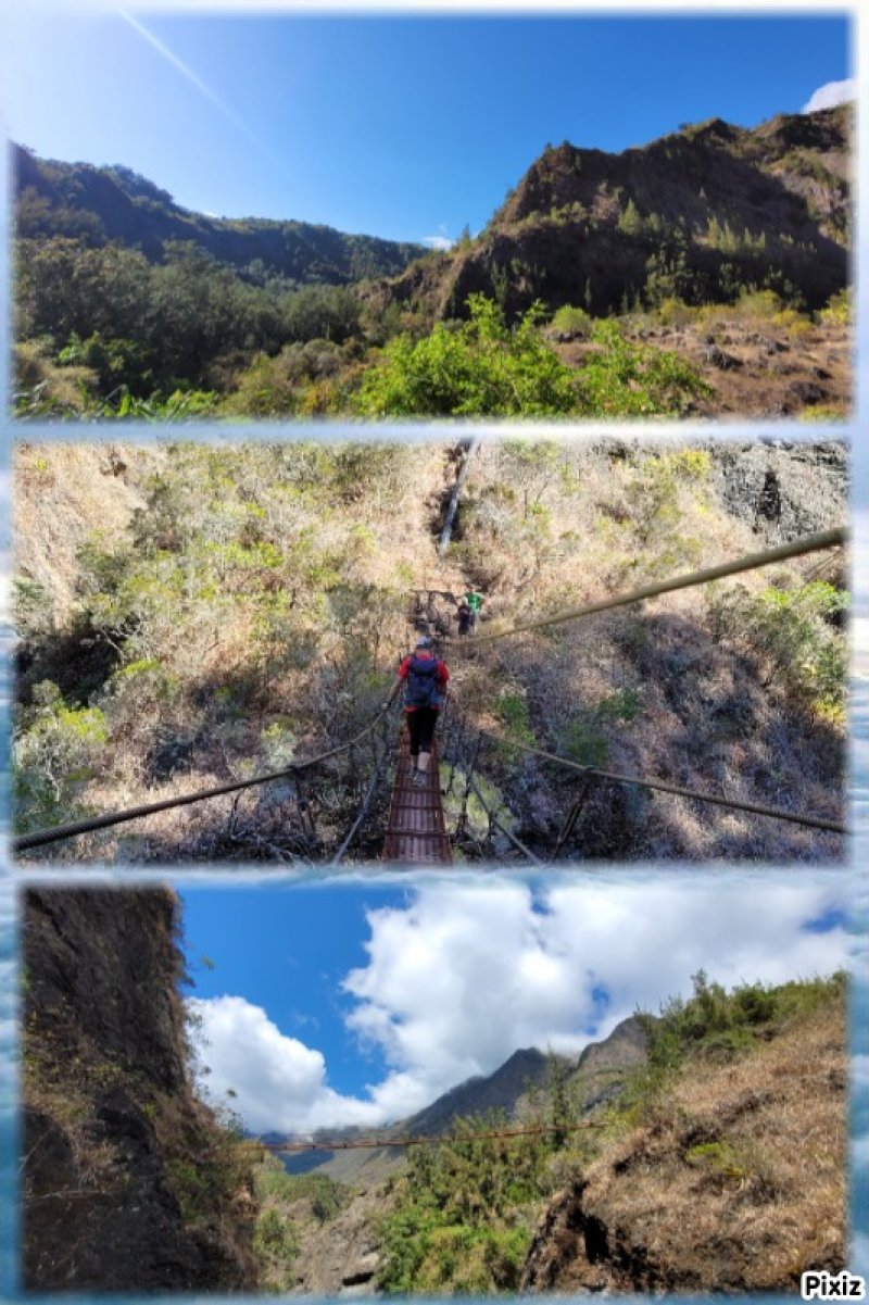 La randonnée débute à l'école de l'Îlet à Cordes où les emplacements de stationnement sont plus faciles à trouver qu'au départ du sentier. Quel plaisir d'être élève dans cette école entourée de fleurs et de paysages grandioses (Photo 1). Les points de vue sont nombreux dans toutes les directions, principalement vers le village et ses plantations de lentilles (Photo 2). Le Dimitile et le Gros Morne de Gueule Rouge dominent l'ensemble. Marcher vers Cilaos et emprunter à gauche le Chemin du Bras de Saint-Paul. A la fin de la descente, avant d'entamer la jonction avec le bras, profiter du paysage avec vue sur l'Îlet du Grand Coude qu'on rejoindra dans 30 minutes (Photo 3). Débuter la descente dans chocas et jouvences sur un sentier en bon état comportant une portion bétonnée et plusieurs lacets. En fin de descente le sentier traverse un bois de filaos avant d'arriver au bras de Saint-Paul. Traverser une première fois le ruisseau puis partir sur la droite par le nouveau sentier pour franchir le deuxième gué (Photo 4). Le parcours remonte ensuite en contournant l'ancien îlet du Bras de Saint-Paul en partie abandonné puis se poursuit vers l'îlet du Grand Coude. Une longue canalisation venant du Bras de la Vierge traverse les champs encore assez bien entretenus et plantés de lentilles (Photo 5). Plus haut, le sentier frôle une case en tôle entourée d'arbres fruitiers que l'on ne touche qu'avec les yeux. Un peu plus loin, après le contournement d'un rein, on s'approche de la passerelle surplombant le Bras Crochet en profitant d'exceptionnels panoramas sauvages sur les remparts du Petit Bénare et la Ravine de la Vierge (Photo 6). L'édifice, malgré la rouille et quelques trous dans le sol grillagé est très solide. Il supporte la canalisation du Bras de la Vierge. Le moindre rien fait vibrer et onduler l'ouvrage aussi est-il conseillé de le franchir une personne à la fois (Photo 7). La canalisation grimpe fort vers la cascade. Marcher en longeant le tuyau une quinzaine de mètres et l'enjamber pour emprunter une sente menant au Bras Crochet par une pente de plus en plus forte et glissante. Heureusement, des câbles sont là pour ralentir la descente s'effectuant sur un sol sableux très friable (Photo 8). Une fois dans le lit du torrent, remonter en évitant les obstacles plus ou moins faciles à contourner et parvenir à un goulet de canyon fermé par un bassin et son toboggan. L'endroit est charmant pour la première pause avant d'entamer la longue descente (Photo 9). Retrouver les passages délicats de la montée (Photo 10) et rejoindre le bas du sentier. On se retrouve à l'aplomb de la passerelle qui enjambe la vallée étroite. Très vite, il faut chercher un passage près d'un bassin qu'on devine plus bas. Passer en rive droite dans une faille comblée de gros blocs où un câble électrique aide à franchir les 8 mètres de descente abrupte (Photo 11). On se retrouve au bassin aperçu depuis la passerelle où prend fin le cours du Bras de la Vierge. L'eau du bassin est limpide avec de magnifiques reflets jaunes et verts. La difficulté suivante consiste à descendre prudemment du gros bloc basaltique dominant le bassin. C'est parti pour tenter de rejoindre la Ravine Bananes en moins de trois heures. De nouveaux blocs monstrueux obstruent le lit mais se contournent aisément s'il n'y a pas trop d'eau (Photo 12). Le lit est comme la plupart de ceux présentés sur ce site : des blocs qu'il faut éviter, enjamber ou franchir en sautant de l'un à l'autre. La pente est faible et le courant jamais dangereux. On se retrouve en 5 minutes, près d'un nouveau bassin créé par les derniers mètres de la Ravine Raisin (Photo 13). Une grosse racine et deux troncs posés sur la paroi laisse à penser que quelqu'un passe par ici. S'il est assez facile de monter en prenant garde, la descente peut s'avérer dangereuse et il est conseillé de ne visiter la belle vallée de la Ravine Raisin qu'en se munissant d'une corde pour la redescente. Reprendre la descente et parvenir en 5 minutes à un impressionnant cassé comportant deux cascades surmontées d'une dent rocheuse très pointue (Photo 14). Contourner la dent par la droite par une montée sérieuse dans les jouvences suivie d'une très forte descente. Il faut nager pour parvenir à la cascade mais l'eau est glaciale. Préférer cette visite sans danger en saison chaude. Le fond de la vallée est de plus en plus envahi de rochers et de filaos dont certains présentent des racines tourmentées par les crues (Photo 16). La descente se poursuit sans grandes difficultés nouvelles jusqu'au nouveau bassin alimenté par un toboggan où l'eau est tout aussi glaciale qu'en amont (Photo 17). La vallée se rétrécit. Le fond est de plus en plus envahi d'énormes blocs rouges (puis jaunes un peu plus bas), issus d'éboulis venant des falaises (Photo 18). Ne pas pratiquer cette descente de rivière en période de fortes pluies favorisant les chutes de roches dont certaines sont énormes. Ne pas manquer une arche basaltique en rive droite (Photo 19) qui doit se contourner par un étroit boyau imposant de se séparer du sac à dos (Photo 15). Une dizaine de minutes plus tard, quitter la rivière au gué franchi au début puis emprunter le sentier des Îlets du Bras de Saint-Paul à travers une végétation pauvre de galaberts, chocas, filaos rabougris et hautes herbes (Photo 20). Le sentier rejoint un plateau. Avant d'entreprendre la descente vers la rivière, ne pas manquer la très discrète sente permettant, au prix d'importants efforts et de quelques glissades de s'approcher d'un grand bassin (Photo 21). L'endroit est sauvage et l'étroite gorge située en amont doit également pouvoir se visiter plus aisément en période chaude après avoir traversé le bassin (Photo 22). Remonter sur le plateau puis entamer la descente vers la rivière par le sentier qui a disparu sur une centaine de mètres suite à un violent éboulis ay