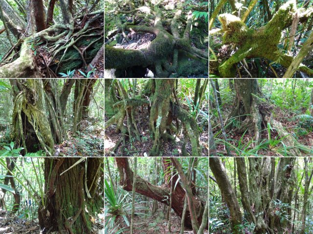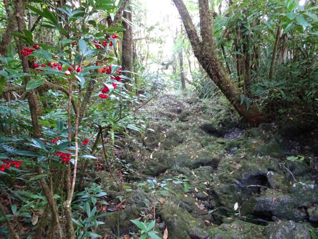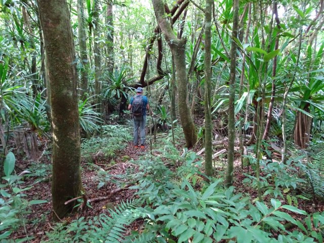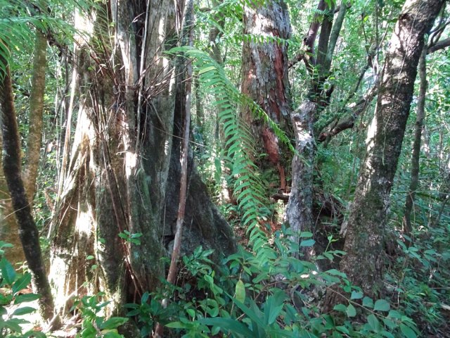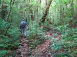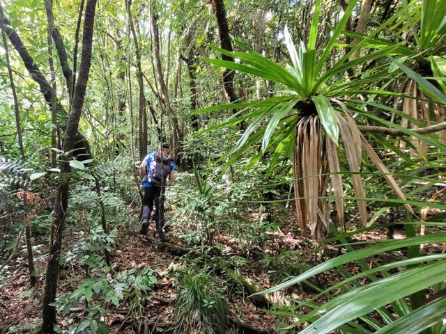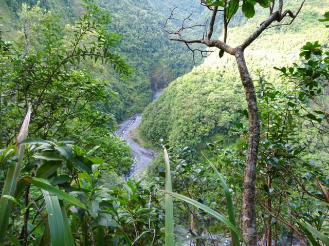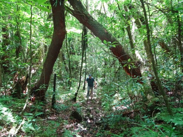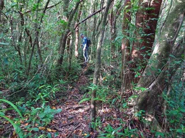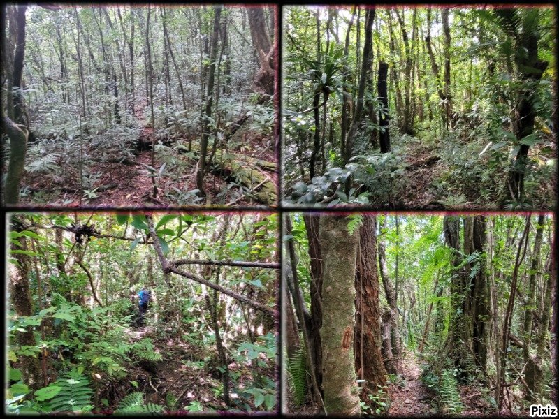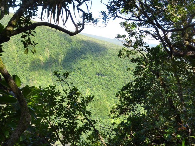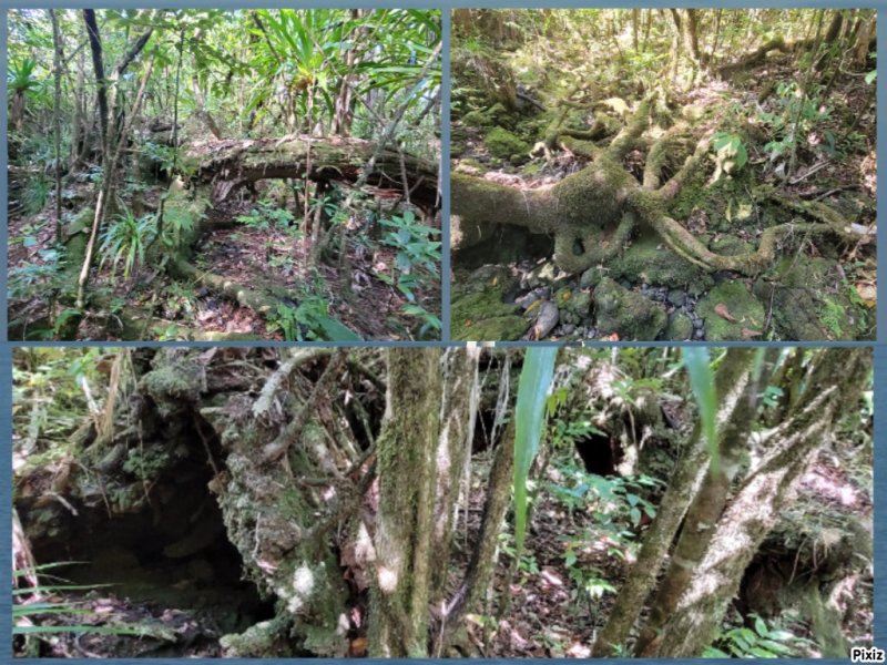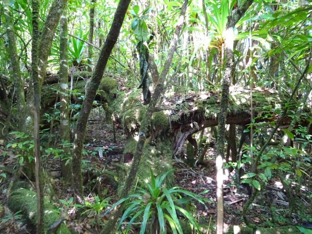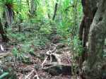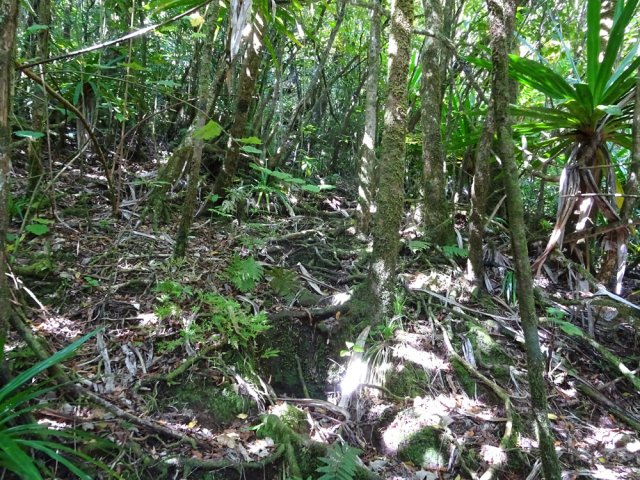 La randonnée débute au plus près de la route des Radiers par une discrète trouée dans la végétation constituée en partie de goyaviers (Photo 1). C'est parti pour 3300 m de montée constante à travers bois de couleurs et goyaviers sur les 300 premiers mètres (Photo 2). Tout au long de la montée, le sentier restera toujours visible et le sous-bois clairsemé et aéré (Photo 3). Les amateurs de beaux arbres seront gâtés même si l'on rencontrera toujours les mêmes espèces (bois maigres, de rempart, nattes, tans rouges, mahots, etc. - Photo 4). Les arbres de grande taille sont nombreux mais rares sont ceux qui ont été terrassés par les cyclones (Photo 5). Le sentier emprunte souvent de minuscules fonds de rus créés par les écoulements. Il est même possible de les confondre par endroits (Photo 6). Durant la montée, on emprunte un tronçon dans un fond de petite ravine. On semble perdre le sentier mais il est simplement barré par un arbre couché qu'il faut enjamber avant de retrouver la trace (Photo 7). Trente minutes après le départ, on se rapproche du rempart. La végétation très touffue n'empêche pas totalement d'apercevoir la Rivière de l'Est coulant dans son étroite vallée (Photo 8). La suite de la montée s'effectue assez près de ce rempart sans pour cela profiter de panoramas. Les ravines sont rares et souvent peu profondes excepté l'une d'entre elles qu'on longe un moment (Photo 9). Les goyaviers ont disparu depuis longtemps et le cheminement est toujours aisé entre les bois de couleurs et les pimpins de plus en plus nombreux (Photo 10). La zone assez pluvieuse de la côte Est favorise la poussée de mousses du sol jusqu'au sommet de la canopée (Photo 11). Même si le passage comporte quelques petites plantes ou fougères, le sentier est toujours visible (Photo 12). Il vaut mieux ne pas le perdre de vue mais dans ce cas, le sous-bois est si clairsemé qu'on retrouve facilement la trace surtout si l'on repère de loin la bouteille vide d'une boisson gazeuse. Pas de balisage hormis ces tristes détritus et quelques traces de coupe-coupe sur les écorces. La pente est régulière et sans grandes difficultés (Photo 13). Ce sont les pandanus qui créent le plus de verdure au plus près du sol (Photo 14). Les rares passages plus pentus se franchissent sur des racines ou des pierres moussues sur une trace qui a relativement bien vieilli (Photo 15). Une heure après le départ, on marche à nouveau au plus près du rempart pour quelques petites fenêtre végétales sur la rivière (Photo 16). Le sol y est en général assez plat et le cheminement s'effectue sans fatigue même si la marche est moins rapide que sur un GRR (Photo 17). Il faut traverser à gué une ravine plus importante que les autres comportant marmites, fissures et roches moussues assez glissantes (Photo 19). En la descendant sur une vingtaine de mètres, on domine à nouveau la Rivière de l'Est proche d'un cassé dangereux entouré de superbes arbres (Photo 20). Un peu plus loin, le sentier oblique sur la droite après un arbre couché formant deux arches moussues (Photo 21). La petite ravine suivante est la plus belle de la sortie ; une exploration ne prend que peu de temps pour profiter des beautés de la nature (Photo 22). Le fond se parcourt sans danger à la recherche de bassins ou de très belles racines (Photo 23). Plus on monte et plus le sentier se rétrécit, demandant un peu plus d'attention (Photo 24). A 900 m, l'emplacement d'un abri de fortune est l'endroit idéal pour la pause casse-croûte à deux pas du rempart (Photo 26). La vallée est toute proche mais il est très difficile d'en apercevoir le fond en raison de l'importante végétation (Photo 27). Les derniers 100 m de montée deviennent de plus en plus difficiles car le sentier est devenu une trace braco et il peut être facile de s'égarer (Photo 28). Les 1000 m sont atteints et il faudrait prendre beaucoup de temps pour tenter de rejoindre le Sentier des Citernes sans certitude de retrouver des bribes de la trace historique. Le demi-tour s'impose et le retour prend à peu près la même durée jusqu'au sentier Touzier.