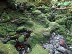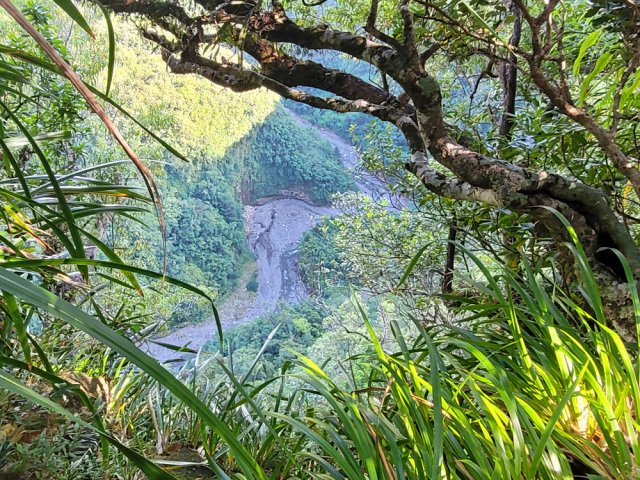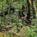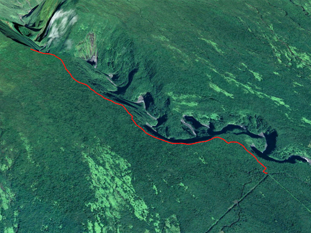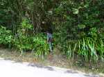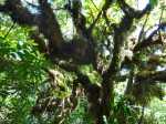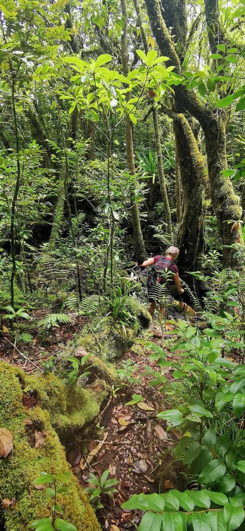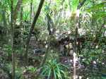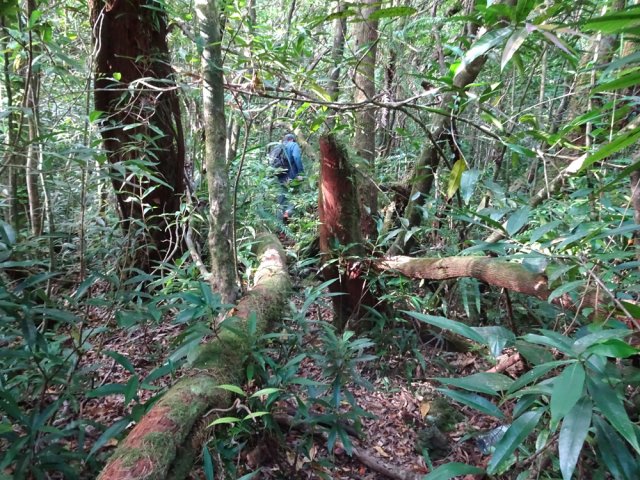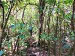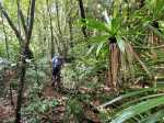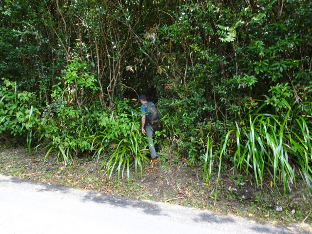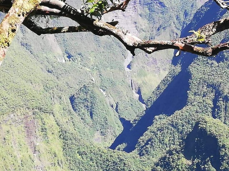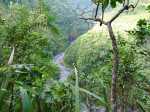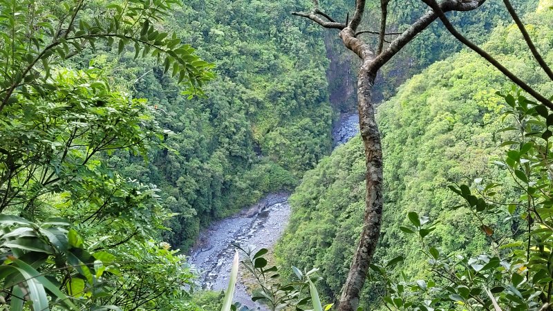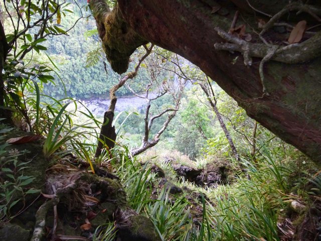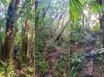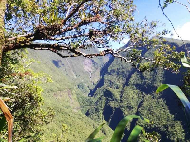 La randonnée débute au plus près de la route des Radiers par une discrète trouée dans la végétation constituée en partie de goyaviers (Photo 1). C'est parti pour 3300 m de montée constante à travers bois de couleurs et goyaviers sur les 300 premiers mètres (Photo 2). Tout au long de la montée, le sentier restera toujours visible et le sous-bois clairsemé et aéré (Photo 3). Les amateurs de beaux arbres seront gâtés même si l'on rencontrera toujours les mêmes espèces (bois maigres, de rempart, nattes, tans rouges, mahots, etc. - Photo 4). Les arbres de grande taille sont nombreux mais rares sont ceux qui ont été terrassés par les cyclones (Photo 5). Le sentier emprunte souvent de minuscules fonds de rus créés par les écoulements. Il est même possible de les confondre par endroits (Photo 6). Durant la montée, on emprunte un tronçon dans un fond de petite ravine. On semble perdre le sentier mais il est simplement barré par un arbre couché qu'il faut enjamber avant de retrouver la trace (Photo 7). Trente minutes après le départ, on se rapproche du rempart. La végétation très touffue n'empêche pas totalement d'apercevoir la Rivière de l'Est coulant dans son étroite vallée (Photo 8). La suite de la montée s'effectue assez près de ce rempart sans pour cela profiter de panoramas. Les ravines sont rares et souvent peu profondes excepté l'une d'entre elles qu'on longe un moment (Photo 9). Les goyaviers ont disparu depuis longtemps et le cheminement est toujours aisé entre les bois de couleurs et les pimpins de plus en plus nombreux (Photo 10). La zone assez pluvieuse de la côte Est favorise la poussée de mousses du sol jusqu'au sommet de la canopée (Photo 11). Même si le passage comporte quelques petites plantes ou fougères, le sentier est toujours visible (Photo 12). Il vaut mieux ne pas le perdre de vue mais dans ce cas, le sous-bois est si clairsemé qu'on retrouve facilement la trace surtout si l'on repère de loin la bouteille vide d'une boisson gazeuse. Pas de balisage hormis ces tristes détritus et quelques traces de coupe-coupe sur les écorces. La pente est régulière et sans grandes difficultés (Photo 13). Ce sont les pandanus qui créent le plus de verdure au plus près du sol (Photo 14). Les rares passages plus pentus se franchissent sur des racines ou des pierres moussues sur une trace qui a relativement bien vieilli (Photo 15). Une heure après le départ, on marche à nouveau au plus près du rempart pour quelques petites fenêtre végétales sur la rivière (Photo 16). Le sol y est en général assez plat et le cheminement s'effectue sans fatigue même si la marche est moins rapide que sur un GRR (Photo 17). Il faut traverser à gué une ravine plus importante que les autres comportant marmites, fissures et roches moussues assez glissantes (Photo 19). En la descendant sur une vingtaine de mètres, on domine à nouveau la Rivière de l'Est proche d'un cassé dangereux entouré de superbes arbres (Photo 20). Un peu plus loin, le sentier oblique sur la droite après un arbre couché formant deux arches moussues (Photo 21). La petite ravine suivante est la plus belle de la sortie ; une exploration ne prend que peu de temps pour profiter des beautés de la nature (Photo 22). Le fond se parcourt sans danger à la recherche de bassins ou de très belles racines (Photo 23). Plus on monte et plus le sentier se rétrécit, demandant un peu plus d'attention (Photo 24). A 900 m, l'emplacement d'un abri de fortune est l'endroit idéal pour la pause casse-croûte à deux pas du rempart (Photo 26). La vallée est toute proche mais il est très difficile d'en apercevoir le fond en raison de l'importante végétation (Photo 27). Les derniers 100 m de montée deviennent de plus en plus difficiles car le sentier est devenu une trace braco et il peut être facile de s'égarer (Photo 28). Les 1000 m sont atteints et il faudrait prendre beaucoup de temps pour tenter de rejoindre le Sentier des Citernes sans certitude de retrouver des bribes de la trace historique. Le demi-tour s'impose et le retour prend à peu près la même durée jusqu'au sentier Touzier.