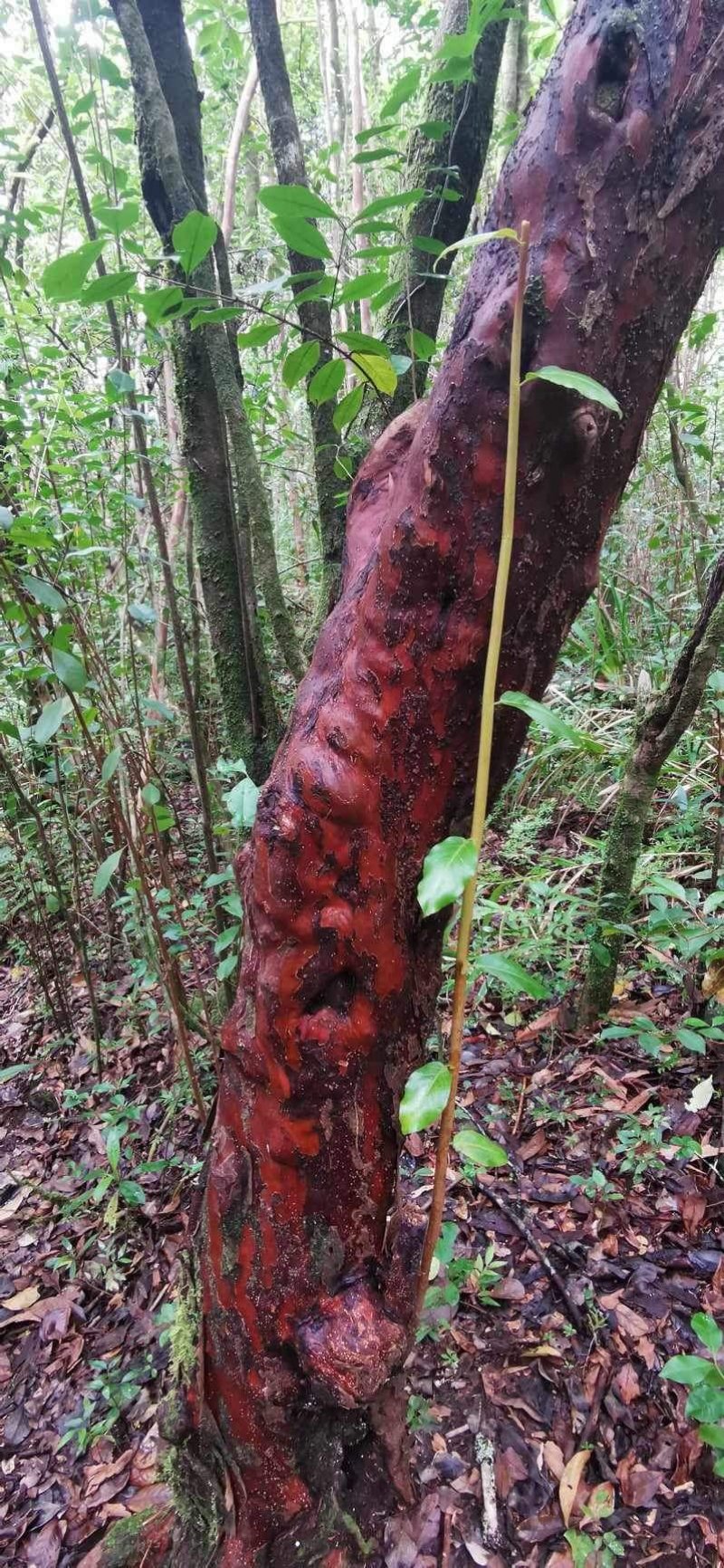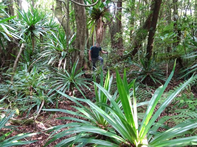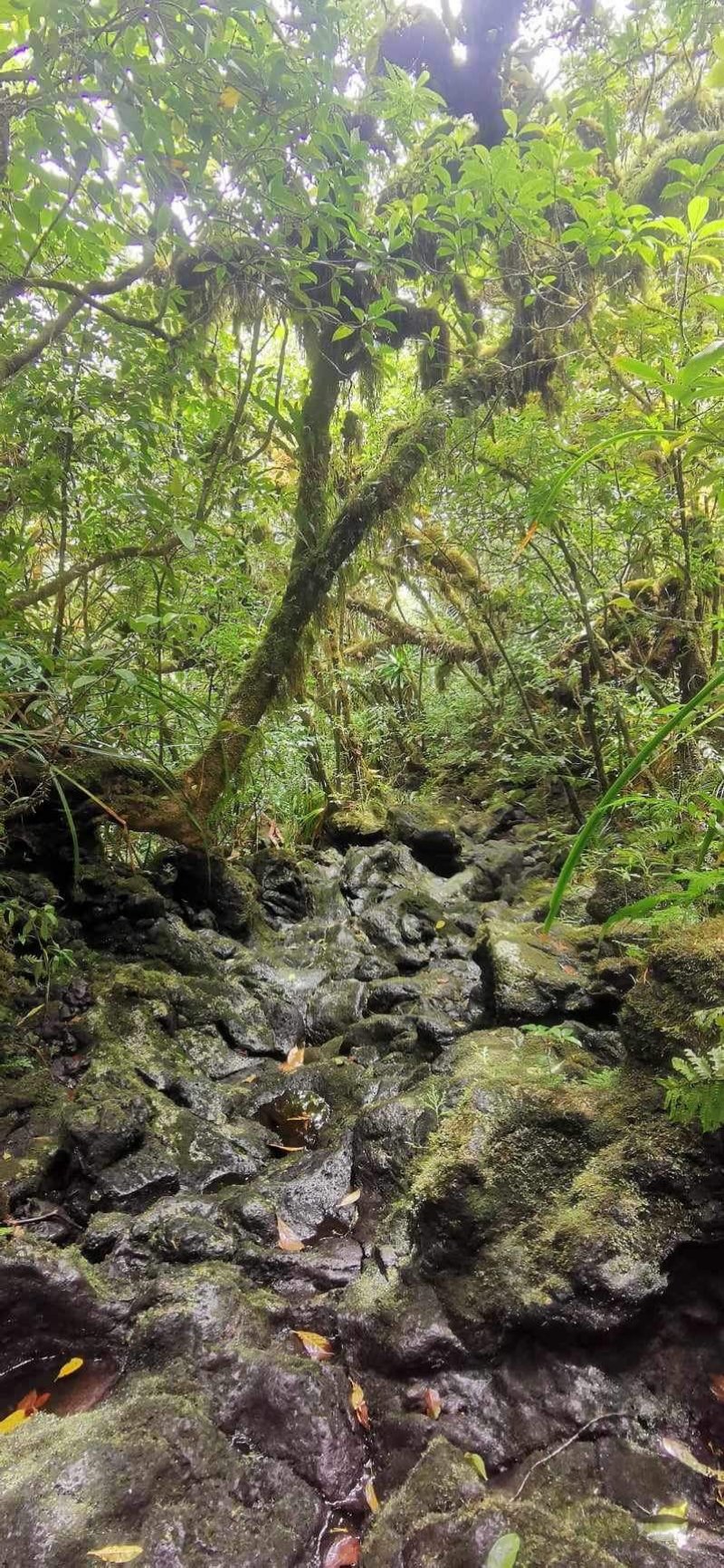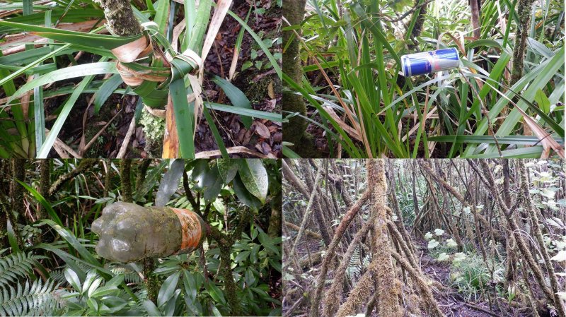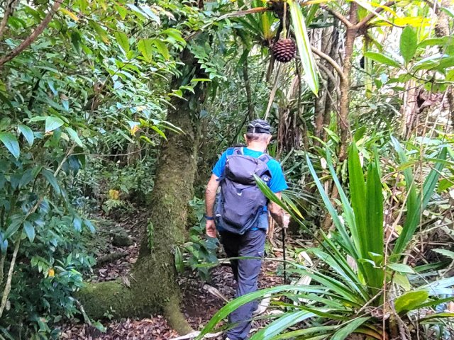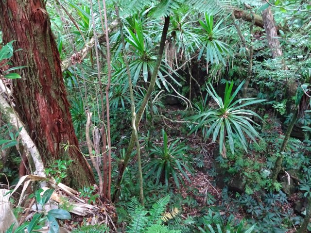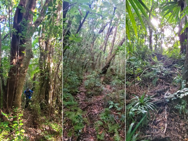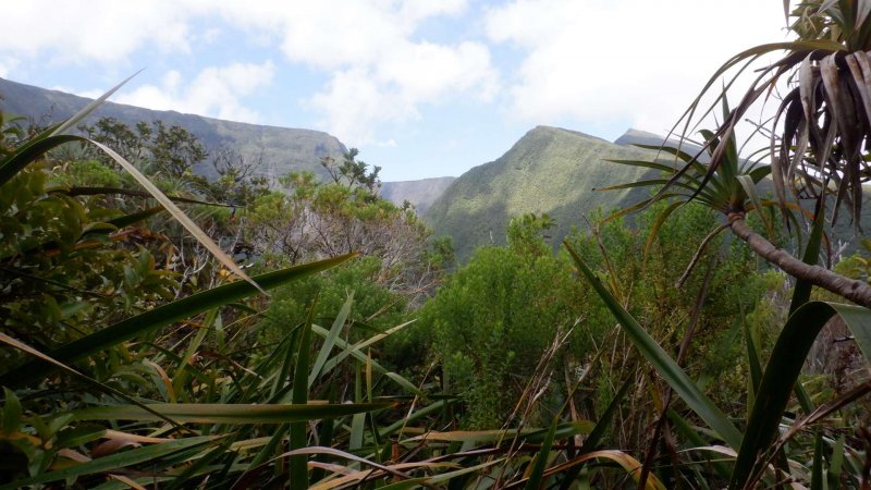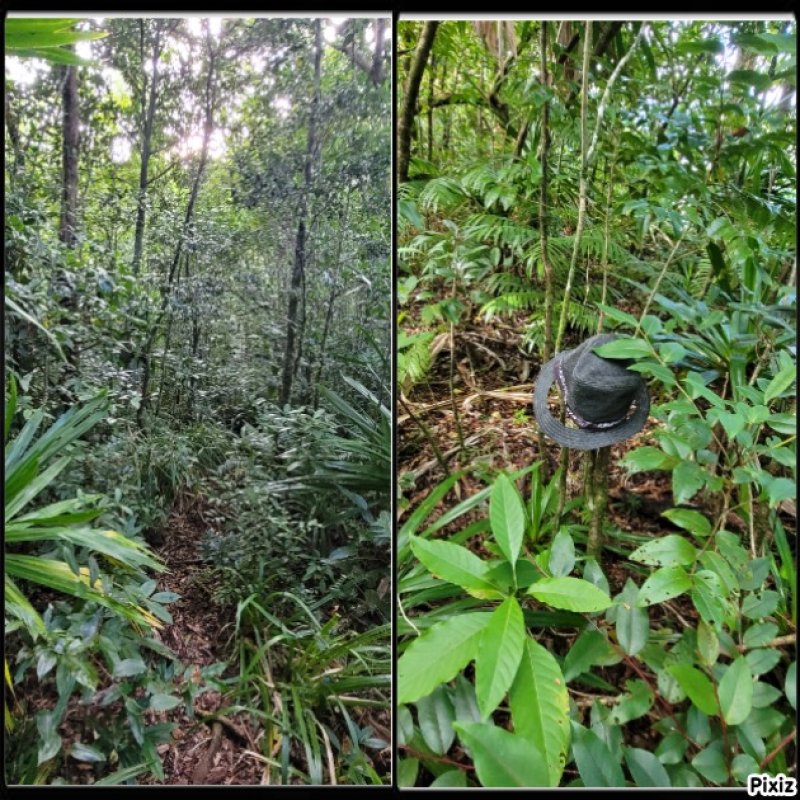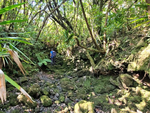 Un sentier historique permettait de rejoindre la côte jusqu'au volcan en suivant le long rempart de la Rivière de l'Est en rive droite. Il a été oublié, après la construction des citernes destinées à l'alimentation de la centrale hydraulique de Sainte-Rose, au profit d'un autre sentier délaissant le nord pour filer vers l'est en direction des réservoirs. Le Sentier des Citernes a été remis en état il y a quelques années mais se trouve à nouveau abandonné en raison de violents effondrements au cassé de la Rivière de l’Est. La partie jamais rénovée reste praticable sans avoir à trop chercher le passage dans la magnifique forêt Mourouvin. Si peu de randonneurs y ont mis le pied depuis des décennies, il en va autrement des braconniers qui entretiennent le parcours par de nombreux passages comme en témoignent les multiples déchets laissés dans la nature. Si le bruit des tangues sur les feuilles mortes ou les palmistes peuvent les attirer, il est très difficile de comprendre pourquoi ils laissent autant de déchets derrière eux. Les agents du parc rencontrés le jour de la création de la fiche n'aimeraient pas que des randonneurs viennent grossir les détritus laissés au sol. Espérons de tout cœur que ces derniers respecteront cette magnifique zone très peu colonisée par les classiques invasives. Ce n'est pas de l'humour que de rajouter que les bouteilles vides servent de balises et rassurent sur la direction à emprunter en cas de doute. Comme le sentier ne rejoint pas celui des Citernes, l'aller-retour est obligatoire mais pas rébarbatif car on aperçoit différemment la flore dans un sens ou dans l'autre.