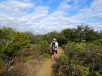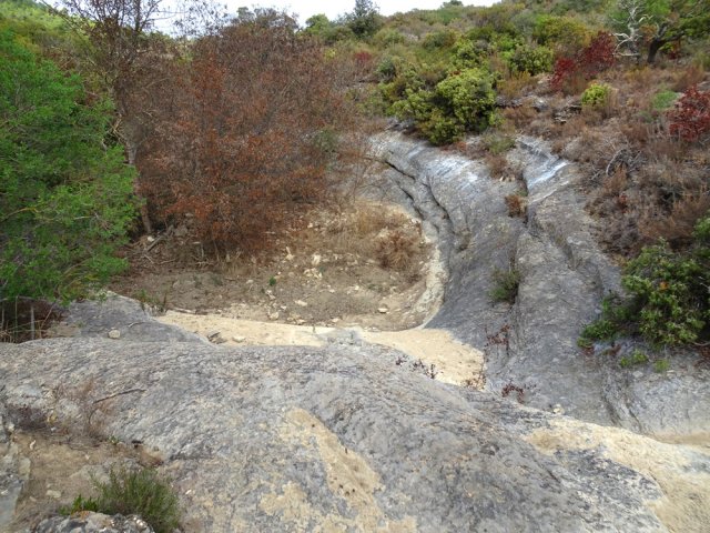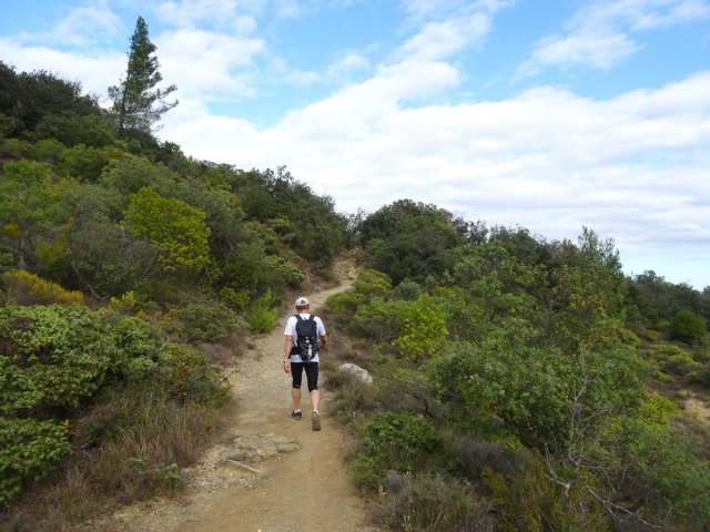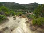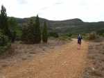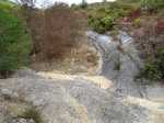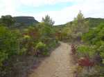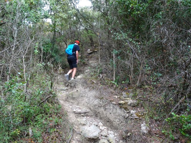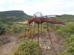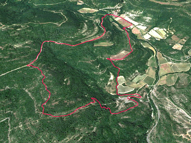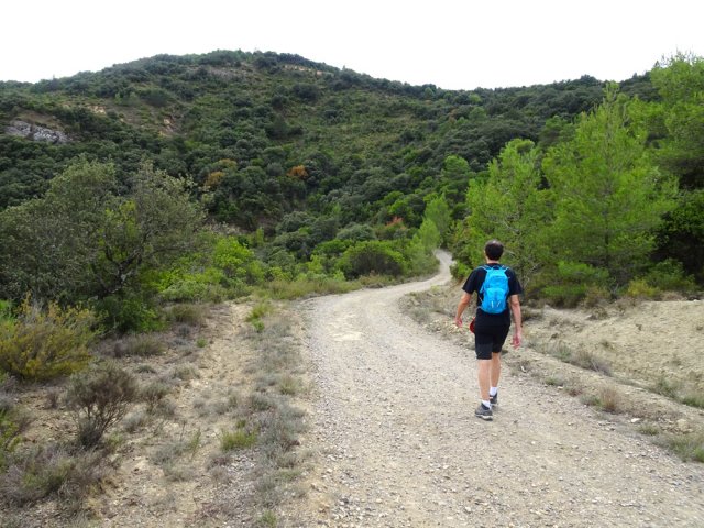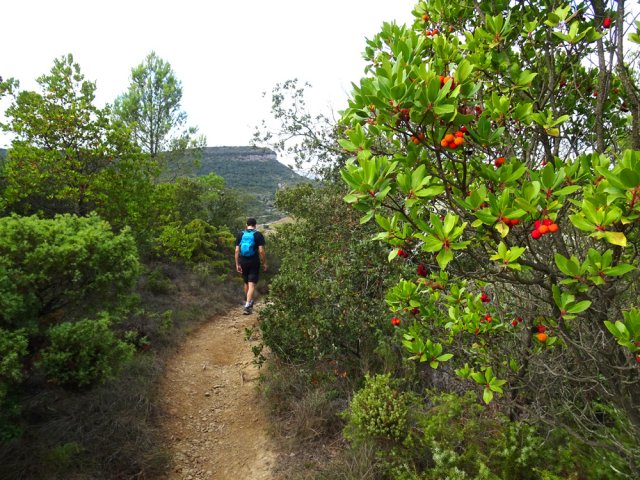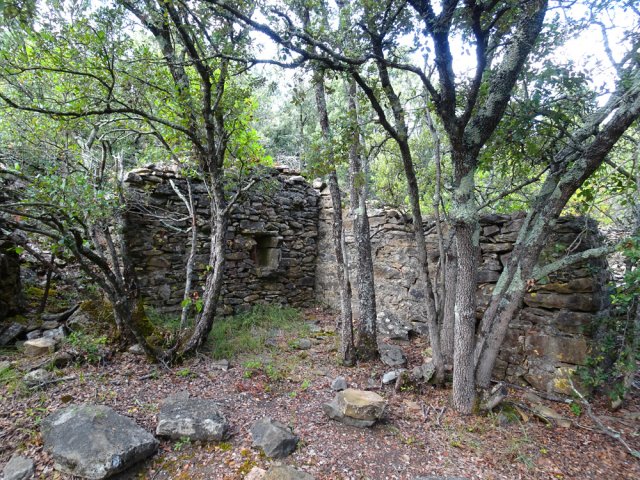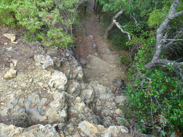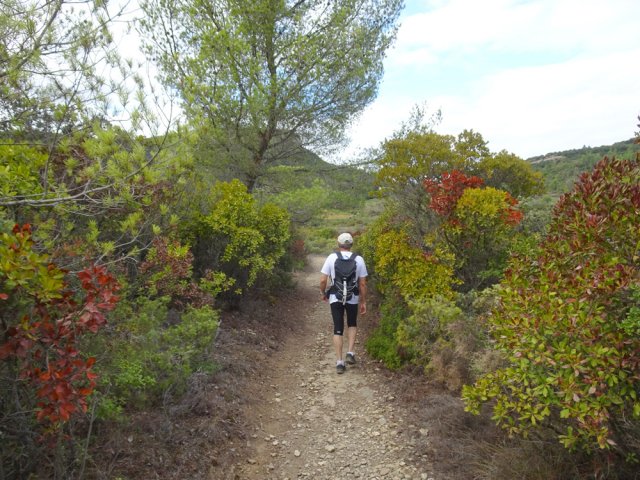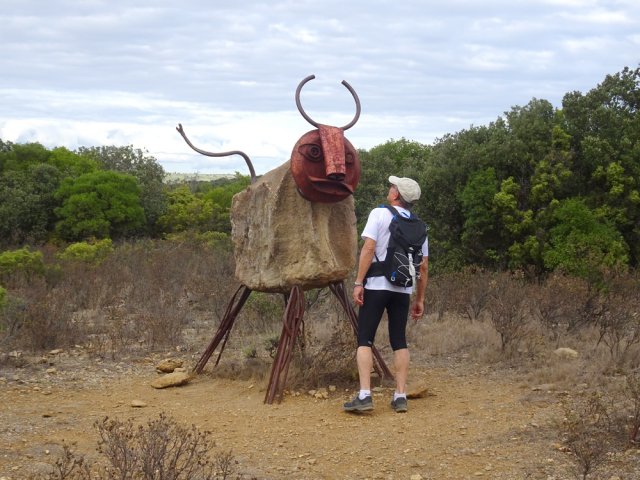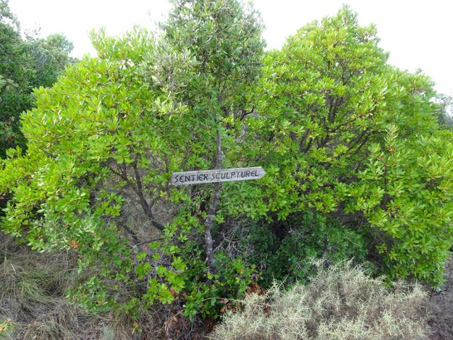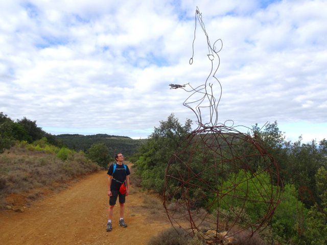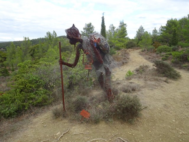 La randonnée débute ici à l'entrée du village où six emplacements supplémentaires permettent de stationner facilement. Il est souvent plus aisé de stationner sur le parking situé 300 m avant les premières habitations et de marcher vers le village par la route ou le sentier sculpturel lui-même. La première rencontre est une cabine téléphonique destinée aux échanges de livres pour les amateurs de lecture (Photo 1). Pourquoi ne pas en déposer deux ou trois en allant ce jour là effectuer la boucle ? Longer jardins et habitations pour gagner le départ du sentier (Photo 2). Le départ, bien indiqué par les panneaux, est impossible à manquer (Photo 3). Le parcours débute en montée sur un sol terreux et caillouteux pour rencontrer une première sculpture en fil de fer représentant un couple de danseurs (Photo 4). Le coq fabriqué à l'aide de centaines de pièces détachées marquera le départ de l'exposition permanente dans la garrigue de Mayronnes (Photo 5). Inutile de beaucoup chercher ; elles sont toutes au plus près du passage des curieux et randonneurs. La pente est parfois sérieuse sur de courtes distances (Photo 6). On s'élève donc rapidement pour profiter des premiers points de vue sur le village ou la région (Photo 7). La végétation classique de ces régions est assez variée le long du sentier comportant parfois des portions sableuses (Photo 8). Puis il s'élargit pour devenir une belle piste facile à suivre offrant de superbes paysages et bien sûr des sculptures à découvrir durant la progression (Photo 9). Certaines, un peu rouillées, dépassent les 5 m de hauteur (Photo 10). Le cheminement le long du GR36 est une balade sans difficulté au milieu des collines verdoyantes (Photo 11). Suivre ce GR, large et roulant, jusqu'à un croisement de parcours et obliquer à gauche en délaissant le GR pour ce sentier sculpturel toujours aussi bien fléché (Photo 12). On quitte la partie large et facile pour entamer une descente sur un sentier plus étroit mais de qualité (Photo 13). Les sculptures et natures mortes crées par les marcheurs jalonnent la boucle sans jamais avoir à fouiller dans la végétation (Photo 14). Le sentier se poursuit en descente légère à travers une agréable végétation composée de genévriers, arbousiers et pins (Photo 17). Une ancienne fermette en ruine dans les chênes verts peut donner lieu à une halte dans la descente, à quelques mètres du sentier (Photo 18). A partir de la ferme, la dernière descente débute à travers les arbousiers couverts de fruits à la saison (Photo 19). On aperçoit de plus en plus souvent les falaises dominant Mayronnes ou la route prise à l'aller à travers les arbustes (Photo 21). Franchir plus loin un ruisseau à sec après avoir frôlé de nouvelles ruines (Photo 23) et s'approcher d'un élevage clôturé. Le sentier remonte alors fortement en sous-bois parfois assombri (Photo 24) où l'on rencontre de nouvelles œuvres naturalistes représentant d'énormes nids de tisserins. Les roches sont parfois le seul passage obligé (Photo 25). Plus loin, d'anciennes vignes arrachées et abandonnées accueillent une œuvre monumentale représentant un taureau (Le Dahut) planté sur ses fers à béton (Photo 26). On retrouve le GR36, large et facile à suivre à travers fourrés et bosquets (Photo 27). Le village fait son apparition et une dernière descente amène vers la route au premier parking (Photo 28). Il est possible de terminer par la petite route ou finir le parcours en revenant au point de départ et la cabine bibliothèque, fin de cette sortie originale qui mériterait un petit ravalement de sculptures.