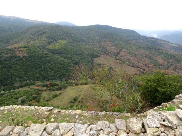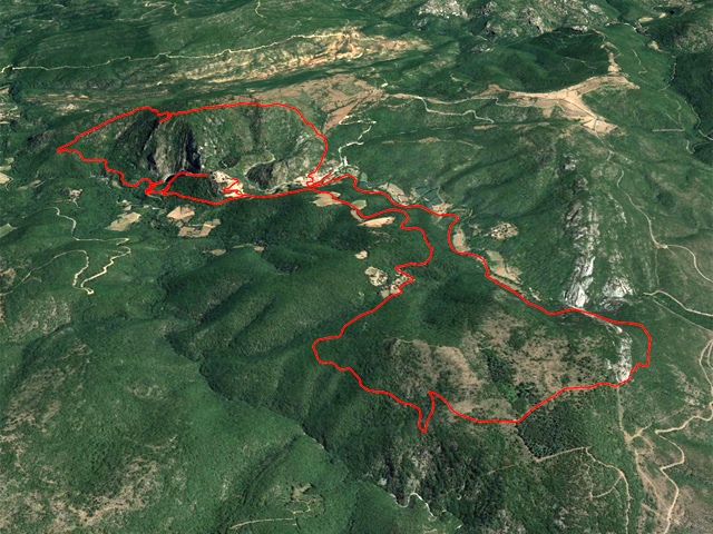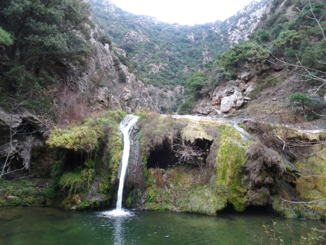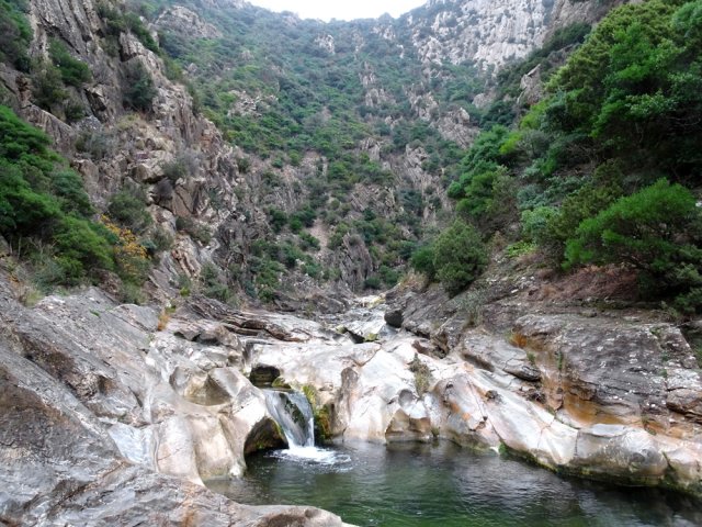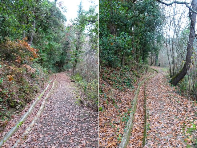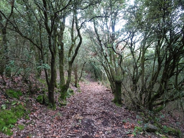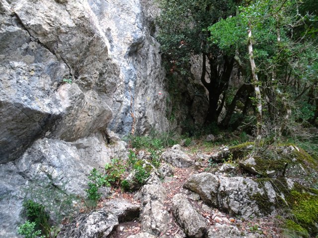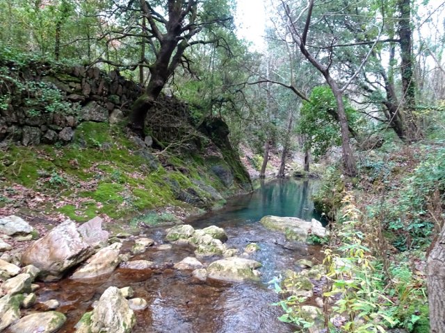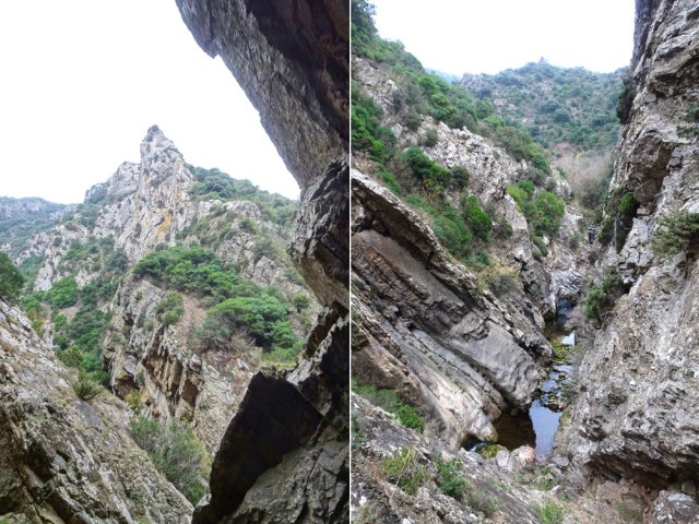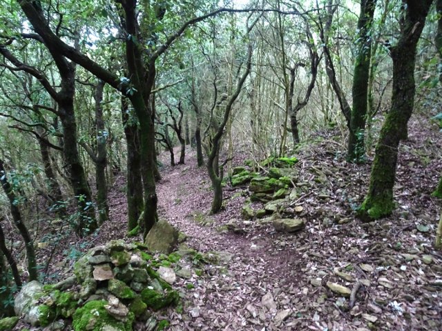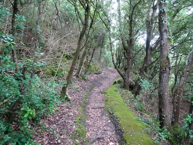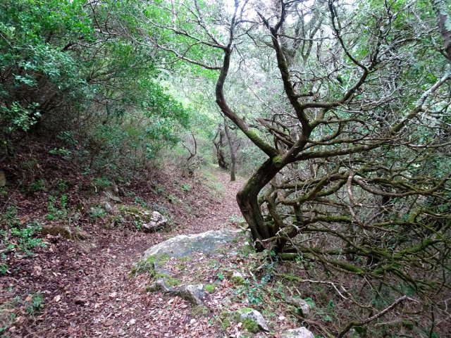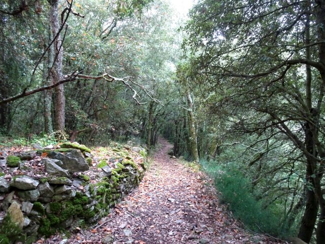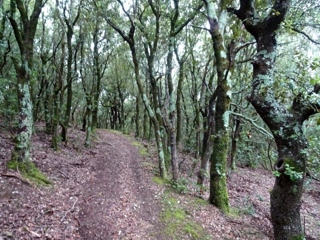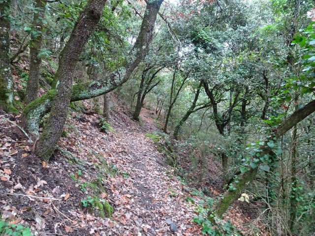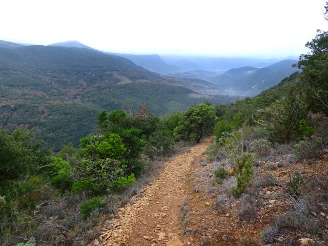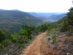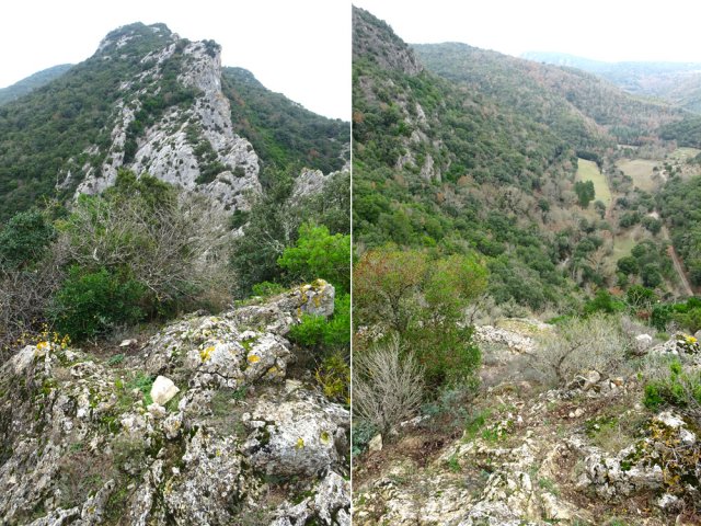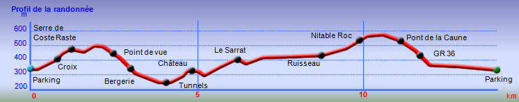 La randonnée débute au petit village de Termes sur l'un des parkings situés en début ou en fin d'agglomération. Plusieurs ruelles ou escaliers entre les habitations permettent de rejoindre le début de la boucle après avoir dépassé l'église (Photo 1). On réservera une dizaine de minutes à la fin de la boucle pour visiter le village. Dès la fin de la bourgade, le circuit pédestre débute par un large sentier caillouteux dans les garrigues. Il se poursuit à l'ombre de quelques arbres qui deviennent de plus en plus nombreux (Photo 2). On s'élève rapidement et le sentier tourne régulièrement vers la gauche. On domine souvent les collines environnantes dont celle abritant le château. Puis le parcours devient presque plat pour traverser la Serre de Coste Raste. Les panoramas sont constants jusqu'au petit sentier partant sur l'ouest pour rejoindre en une minute un point de vue dégagé sur la région (Photo 3). La descente débute peu après le point de vue. Le sentier en sous-bois traverse des zones anciennement habitées ou cultivées comme le montrent les murets encore debout (Photo 4). La forêt de jeunes chênes a tout envahi. Les sangliers défoncent de grandes surfaces des sous-bois et même le sentier. La descente s'intensifie sur un sol plus sableux comportant parfois quelques lacets (Photo 5). La pente disparaît presque par moment et le cheminement s'effectue à l'ombre des nombreux chênes (Photo 6). On frôle plus loin une ruine qui menace de tomber. On devine bientôt la route de Termes et l'on aperçoit le moulin de la Buade en rive droite du Sou. La zone ayant été exploitée au siècle précédent, les sentiers sont presque des pistes bordées de murets (Photo 7). De hautes falaises se dessinent devant à l'emplacement des Gorges de Terminet qui approchent. Au premier croisement, partir à gauche puis passer devant un dispositif de pompage entouré de grillage. On entend très bien le bruit d'une chute que l'on aperçoit à travers les arbres. On vient d'arriver au Sou et aux gorges. Câbles, mains courantes et barreaux fixés dans la roche permettent de descendre au plus près de l'eau en amont de la cascade. Les gorges s'admirent vers la gauche. Si le sol est sec, la remontée est aisée pour admirer bassins et petites chutes en longeant le cours d'eau à l'instinct (Photo 8). Faire demi tour, rejoindre le passage protégé et entamer une descente assez sportive pour rejoindre le bassin alimenté par la chute repérée en arrivant au Sou (Photo 9). A partir de la cascade, le but consiste à rejoindre la route et les tunnels dominant les gorges. Des sentiers et pistes partent dans plusieurs directions tant en rive droite qu'en rive gauche. Cette trace prévoit de traverser à gué le Sou près d'un bassin puis d'entamer directement la forte montée menant à la route (Photo 10). Plusieurs sentiers sans doute utilisés par les pêcheurs ou canyonistes rejoignent la RD40. Avant de partir à droite vers les ruines du château, marcher vers le village et passer au moins les deux tunnels (Photo 11). On domine les gorges et l'on aperçoit la cascade et d’autres petites chutes après le petit tunnel. Des sentes plus ou moins difficiles filent vers le fond des gorges constituées de plissement des couches de calcaire (Photo 12). Après cette visite intéressante mais facultative, revenir sur ses pas et emprunter la première piste sur la gauche. Très vite, on rencontre le sentier grimpant en pente douce sous les chênes en direction du château (Photo 13). Au prochain croisement, prendre à gauche et remonter vers le château par la piste caillouteuse ou par le sentier Nature. Les ruines dominent la région qu'on peut observer de toutes parts (Photo 14). On aperçoit le village de Termes qu'on rejoindra bientôt (Photo 15). Il est possible de suivre le parcours de visite lorsque le château est ouvert. On passe de ruine en ruine en devinant l'usage des bâtiments ou en lisant les panneaux indiquant leur fonction. Redescendre après cette balade avec panoramas à 360° et rejoindre la route. La deuxième boucle peut débuter. Pour cela il est possible de continuer sur la piste de droite ou de la rejoindre en passant par le village. Dans ce cas, partir à gauche et marcher jusqu'à la fontaine de marbre gris. Tourner à droite entre des bâtiments, longer une clôture puis un sentier agréable en sous-bois (Photo 16). On rejoint après quelques montées la piste menant au château. Partir à gauche et entamer une jonction très facile sur pistes en direction de la ferme isolée des Courtives (Photo 17). Après les prairies et bâtiments de ferme, poursuivre sur un agréable sentier, toujours en sous-bois de chênes, comme depuis le début de la journée (Photo 18). On parvient assez vite malgré la distance aux premières falaises de Nitable Roc bien connues des grimpeurs de la région (Photo 19). Le sentier, très rocheux, longe tout d'abord les rochers puis effectue de fortes descentes sur hautes marches (Photo 20). La pente se calme dans les bois que l'on retrouve avec de beaux spécimens de chênes centenaires. Plus bas, on devine les Gorges de Caune Pont (Coynepont) dominées par une imposante barre rocheuse (Photo 21). Un gros trou de trente mètres sur la gauche attire l'attention. Il s'agit d'un effondrement important ayant donné naissance au grand pont naturel de Caune sur lequel passe le GR (Photo 22). Un sentier partant vers les gorges dans les rochers peut s'avérer vertigineux pour certains marcheurs (Photo 23). Laisser cet endroit rocheux de Fenne Prenz et entamer la longue descente menant aux prairies qu'on aperçoit depuis le sentier en lacets très rocailleux (Photo 24). On retrouve une dernière descente en sous-bois bordée de genévriers centenaires, morts ou vivants (Photo 25). On se retrouve sur la rive gauche du Sou. De l'autre côté, quelques fermettes et prairies sont encore exploitées. La rivière comporte souvent de petits barrages na