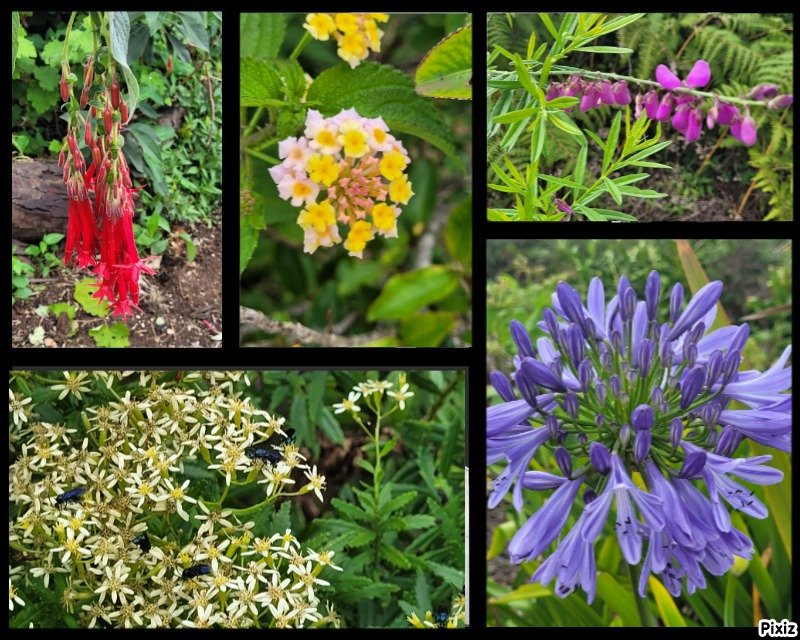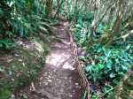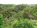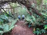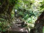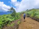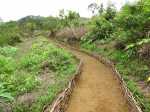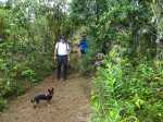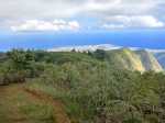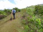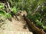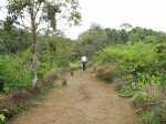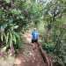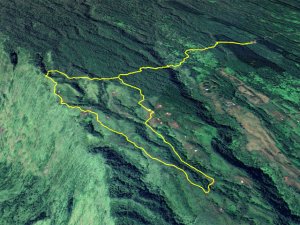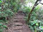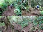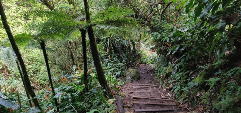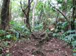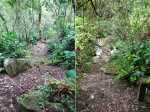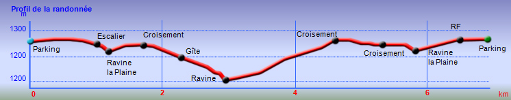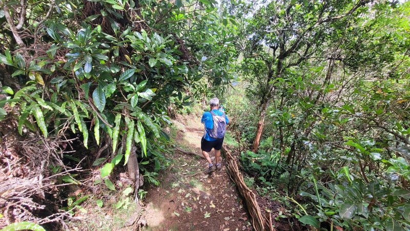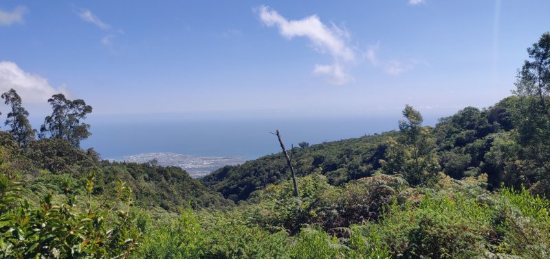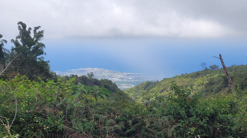 La randonnée débute à la fin de la Route Forestière des Cryptomerias. Elle sera plus longue et plus difficile à partir de Sans Souci. Après avoir remonté l'allée bordée de cryptomerias, on se retrouve au départ du sentier de l'Îlet Alcipe par la Forêt de Sans Souci. Quelques panneaux donnent des indications et matérialisent les sentiers à parcourir dans la forêt (Photo 1). Le sentier plonge littéralement vers un affluent de la Ravine la Fontaine par une pente assez raide bordée de fascines de bois de goyaviers (Photo 2). Franchir la ravine et entamer une traversée de la belle forêt de bois de couleurs, hélas envahie par les longoses (Photo 3). C'est le domaine de la verdure omniprésente (Photo 4). La marche s'effectue le plus souvent entre les racines ou les marches aménagées par l'ONF. A l'approche de la Ravine la Plaine, le sentier traverse une aire aménagée qui peut servir de coin de repos grâce aux sièges en rondins (Photo 5). L'échelle en bois qui permettait de franchir une cassure du terrain est désormais remplacée par un large et stable escalier métallique (Photo 6). Le terrain pour rejoindre la ravine peut être glissant avec de fortes descentes parfois boueuses (Photo 7). On rejoint assez rapidement le départ de la boucle des Boucans en poursuivant sur racines et marches parmi les bois de couleurs et longoses (Photo 8). Au croisement des sentiers, prendre à gauche en suivant l'indication du poteau ONF (Photo 9). On reviendra, près de deux heures plus tard au sentier repéré à droite. Après une courte portion boisée, on parvient dans des clairières et zones anciennement défrichées et cultivées. Le sentier, large et propre, semble entretenu régulièrement (Photo 10). Son tracé correspond à une piste apparaissant encore sur certaines cartes IGN. Une bifurcation mène au gîte Tagoute situé à moins de 100 m (voir § ci-dessous). Poursuivre toujours en descente en profitant de quelques points de vue et de la flore. On remarque aussi des zones couvertes de vigne marronne et d'autres où des milliers de mouches bleues (Tenthrede cibdela janthin) butinent les ambavilles et les passiflores (Photo 12). La friche semble avoir tout recouvert mais on devine ça et là des feuilles de curcuma et de taros dépassant des invasives (Photo 13). La longue descente sur sentier large et propre se termine à une ravine. Il faut remonter quelques marches pour se diriger vers le sentier de Sans Souci (Photo 14). On parvient rapidement à une nouvelle aire avec ses poufs en bois d'acacia noir située au bord du sentier vers l'Îlet Alcipe (Photo 15). Après la longue descente il faut désormais s'attendre à une aussi longue montée sur un sentier de qualité exceptionnelle (Photo 16). De nombreuses touffes de bec zozo marron (Polygala virgata) bordent le large sentier (Photo 17). Tout comme à la descente, on profite, en se retournant, de larges panoramas sur la côte et sur la ville du Port (Photo 18). On aperçoit ou l'on devine ces fameux boucans qui semblent désertés pour la plupart (Photo 19). Il est bien sûr évident qu'on ne pénètre pas dans les propriétés privées en l'absence du propriétaire. En revanche, les rencontres sont toujours agréables lorsque la discussion s'engage avec l'un d'entre eux. Pour les marcheurs superstitieux, de vastes étendues de trèfles à quatre feuilles (Oxalis tetraphlla) entourent des boucans ou poussent sur le bord du sentier (Photo 20). Vers la fin de la montée, la pente s'accentue par endroits et le prochain sentier approche (Photo 22). Il plonge lui aussi vers une première ravine dont la remontée en rive gauche comporte de hautes marches en bois (Photo 23). Fin des champs car l'on arrive dans la forêt de Sans Souci. On retrouve les racines et quelques beaux bois de couleurs que l'on a rencontrés en début de boucle (Photo 24). Quelques dents de scie parfois abruptes et glissantes tirent un peu sur les muscles des cuisses mais la boucle est courte (Photo 25 et 26). On arrive rapidement au croisement emprunté précédemment et la fin du parcours suit le même itinéraire. On retrouve la vallée de la Ravine la Plaine (Photo 27), l'escalier métallique et les racines des bois de couleurs jusqu'à la fin du sentier. Le parcours prend fin sous les cryptomerias jusqu'au stationnement en fin de route (Photo 28).