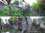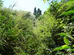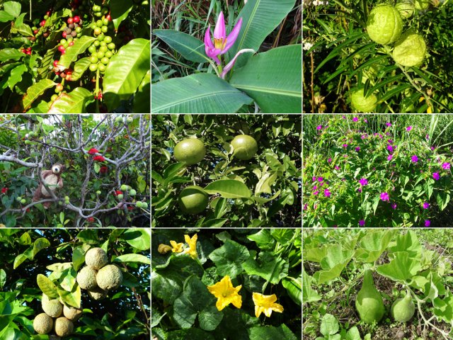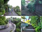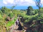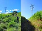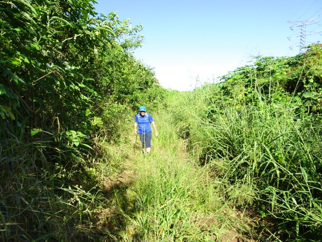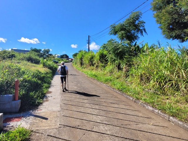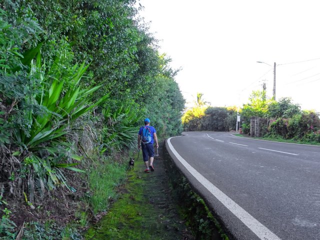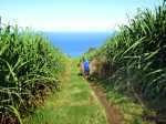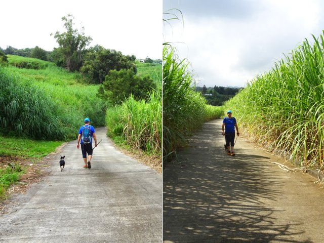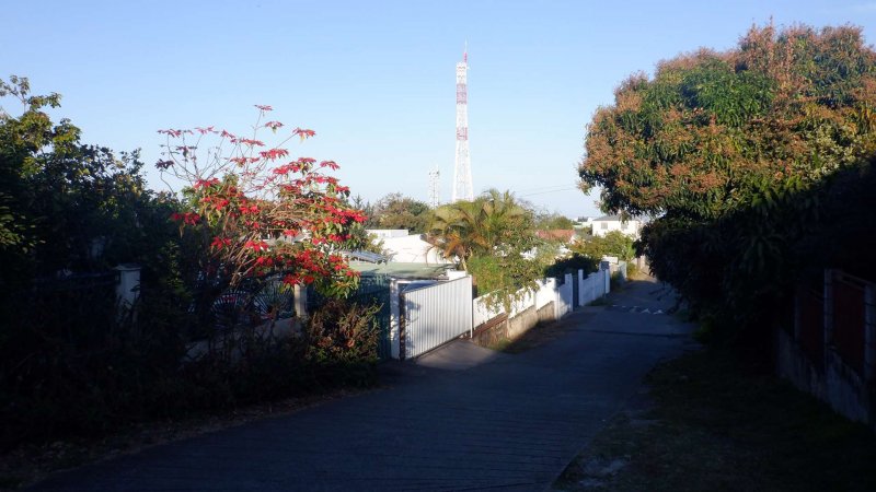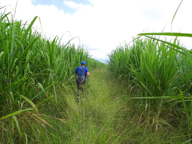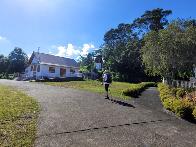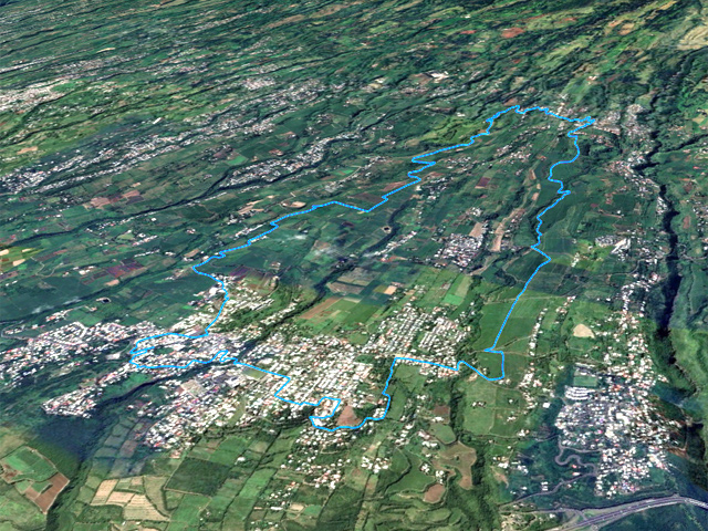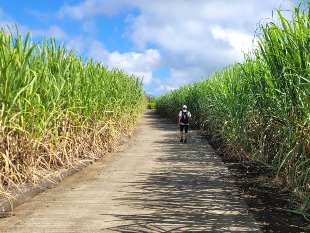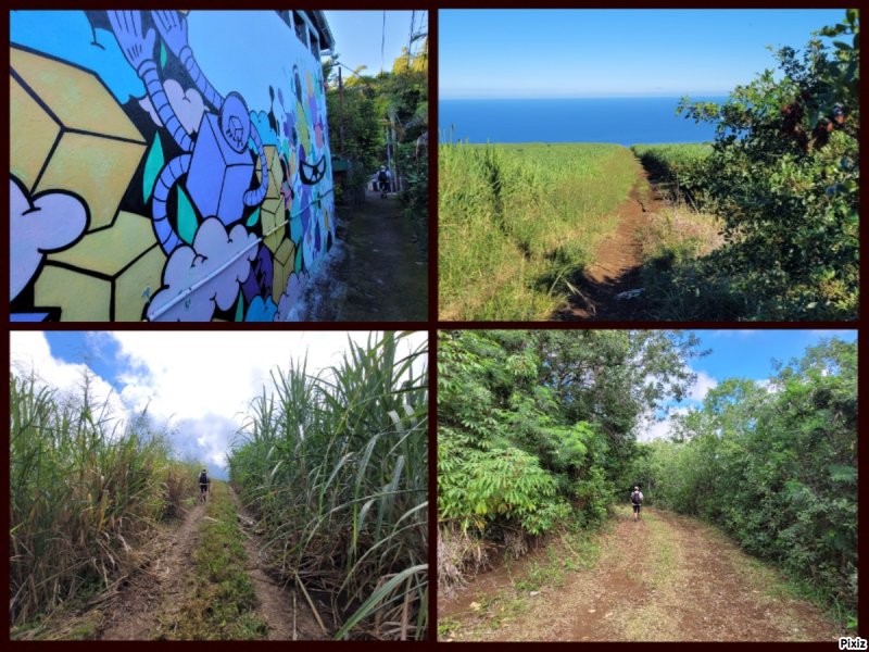La randonnée débute ici à la poste de la Saline mais peut tout aussi bien commencer n'importe où en ville comme par exemple à l'église ou à l'ancienne usine. Contre les bâtiments de la poste, un premier passage bordé de belles de nuit permet d'éviter la route. Il y en aura bien d'autres jusqu'à l'église (Photo 1). Rejoindre la Rue Welsch puis le Chemin de la Mairie. Contourner la mairie puis emprunter de nouvelles ruelles étroites et des escaliers avant de rejoindre la Ravine de la Saline qui se franchit par un petit pont avant de remonter vers l'église (Photo 2). L'élégante église jaune peut se longer par la gauche (Photo 3). La traversée de cette partie des faubourgs de la Saline emprunte plusieurs petites rues, souvent en cul de sac nécessitant d'avoir la carte en main. Aucune monotonie cependant car les jardins fleuris et les arbres fruitiers créent souvent des occasions de haltes ou de discussion avec les habitants (Photo 4). Ne pas manquer de nouveaux raccourcis étroits à partir de la Rue Essob et descendre vers la RD9 près d'une boulangerie de quartier vendant de délicieuses viennoiseries. Le parcours emprunte 400 m de route mais le large caniveau permet de marcher sereinement sans risque lié à la circulation (Photo 5). Au premier croisement à gauche, emprunter la Rue Poter finissant en impasse. Une clôture ferme l'accès aux véhicules à la dernière propriété sur la gauche. L'habitant des lieux, très aimable, conseille d'emprunter le sentier bordant ses clôtures (Photo 6). Très fréquenté, il est large entre grillage et champ sur la droite. On parvient à la piste indiquée sur la carte IGN mais trop encombrée dans sa partie ouest pour envisager de l'emprunter à la rue Essob. Partir à droite et marcher dans l'herbe en direction du Chemin de l'Evêque qu'on empruntera vers la droite (Photo 7). Une grande statue de la Vierge occupe le prochain croisement (Photo 8). Ne pas manquer la première piste partant sur la gauche. Elle sera la première d'une très longue série sans doute correctement balisée le jour de la compétition. Aucune difficulté pour suivre le chemin offrant, en se retournant, de beaux points de vue sur l'océan (Photo 9). Plus haut, les cannes occupent tout le terrain, la montée est régulière et le cheminement facile sur l'herbe courte (Photo 10). Traverser la RD6 baptisée ici le Chemin d'Eau et filer tout droit à travers champs en profitant de la vue sur les pentes du Maïdo (Photo 11). Rejoindre ainsi la D4 et ne pas franchir la Ravine Tabac. Poursuivre sur le chemin qui commence par endroits à se couvrir de hautes herbes tout en longeant la ravine (Photo 12). La ligne haute tension, repérée depuis le village, est au plus près et sert de repère pour ne pas s'égarer (Photo 13). Plus haut, partir à gauche, traverser la très modeste Ravine Tabac, passer au plus près d'un pylône et marcher dans les hautes herbes avant de rencontrer des parties du chemin raviné par les pluies. On se retrouve plus haut sur l'emplacement d'anciennes cultures abandonnées envahies de galaberts et de grandes surfaces de colle-colle (desmodium). Le chemin est tout de même marqué mais perd en attrait pour la marche (Photo 14). A partir de 750 m, on gagne en fraîcheur mais on perd en vitesse car les hautes herbes ralentissent sans pour cela arrêter (Photo 15). A 800 m, on est accueilli par un beau bosquet d'eucalyptus suivi plus haut par un tunnel sombre de tournesols mexicains (Photo 16). Le sentier se termine à la Rue Tauran qui grimpe fortement vers la Route Hubert Delisle (Photo 17). Avant d'entreprendre la descente vers la Saline, pourquoi ne pas s'écarter un peu du parcours du trail pour monter à la Chapelle Notre Dame de Lourdes même si l'édifice est banal avec son clocher attenant (Photo 18). La vue sur la côte, en revanche, vaut le court effort pour s'y rendre. Pour les curieux, un sentier débute derrière le clocher. Rejoindre la route en empruntant l'escalier (Photo 19). La traversée de Ravine Daniel est courte et la circulation assez faible. On parvient donc rapidement à un affluent du Bras d'Aniel (seuls les habitants du coin peuvent connaître la différence entre Daniel et d'Aniel). Le lit du ruisseau bordé de fleurs et d'eucalyptus est du plus bel effet sous le soleil (Photo 20). Après ces 500 m de montée le Chemin Sadeyen paraît aussi large que la Route des Tamarins et la cadence atteint vite les 6km/h dans la descente bordée de hautes cannes à sucre (Photo 21). La circulation y est anecdotique. La balade doit être agréable lorsque les cannes sont coupées, offrant des points de vue vers le lagon (Photo 22). Quitter le chemin vers le hameau de Bassin Souris pour entamer une nouvelle série de pistes et chemins avec des vues plus nombreuses sur la campagne environnante (Photo 23). Rien à voir avec les chemins de la montée ; on marche sur de l'herbe régulièrement coupée et aussi propre qu'un green de golf (Photo 24). La multiplication des voies impose de se référer souvent à la carte pour rester au plus près du parcours du trail. En cas d'erreur, il est possible de retrouver le trajet par n'importe quelle piste. Certaines sont également envahies mais on passe toujours sans hésitation (Photo 25). Retrouver la D4 vers Notre Dame des Champs, partir à gauche vers la Saline qu'on devine facilement à la haute cheminée de l'usine de Vue Belle (Photo 26). Cette usine en ruine vieillit bien mal et il est dommage qu'une partie n'ait pas été récupérée pour y abriter des activités municipales (Photo 27). Plus bas, après le lycée, on se retrouve au centre ville pour une rapide visite au temple malabar très coloré (Photo 28). Pour coller au plus près du parcours officiel il faudra remonter un peu par le Chemin Vue Belle sinon la poste est tout près en poursuivant par la rue principale.