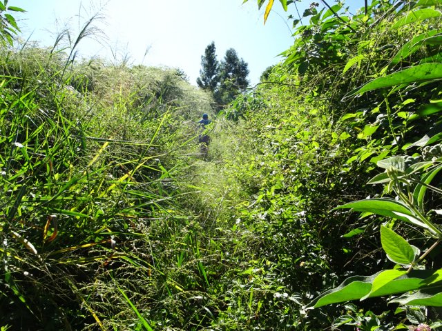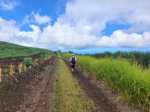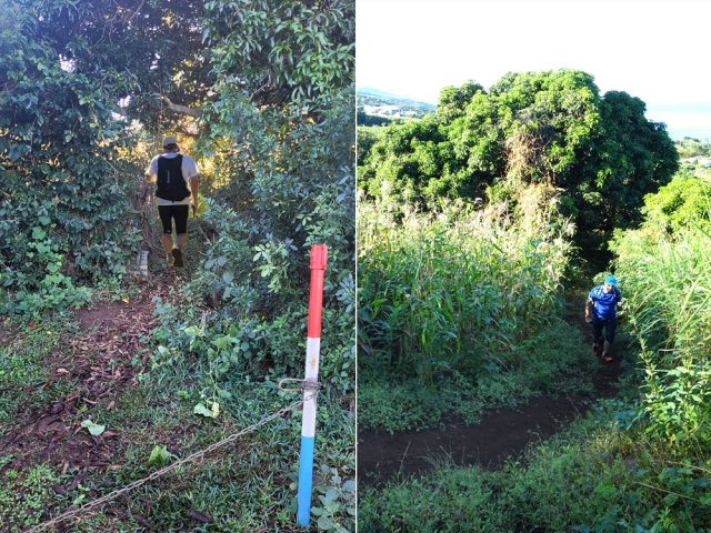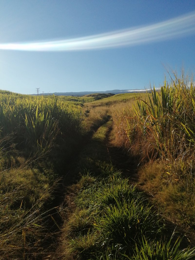 Le Trail des Trois Salines a lieu chaque année en juin autour de la petite ville de la Saline les Hauts. Cette longue course de 35 km débute et finit à la Saline les Bains, emprunte des sentiers, de la route et des chemins. De multiples pistes sillonnent les champs de canne à sucre, d'autres traversent d'anciennes cultures abandonnées laissées à la végétation invasive. Autant les premières sont de bonne qualité en raison des fréquents passages d'agriculteurs, autant les secondes sont vite envahies de hautes herbes une fois la course terminée. La boucle présentée ici ne passe pas en aval de la Route des Tamarins car les sentiers ont déjà été présentés sur d'autres circuits. La portion de boucle de 16 km proposée traverse la Saline en essayant de s'éloigner au maximum des rues fréquentées puis emprunte fidèlement le tracé de la course. C'est donc au cours du deuxième semestre de l'année que le parcours est le plus facile avant l'envahissement des chemins. Heureusement, ce sont surtout les hautes herbes qui sont présentes même si on devine ça et là des galaberts qui ne demandent qu'à grandir. Au premier semestre, ce n'est pas l'aventure mais il faut parfois chercher des yeux le passage. Un petit écart est conseillé à Ravine Daniel pour rejoindre Notre Dame de Lourdes et bénéficier de larges panoramas sur l'océan ou poursuivre vers l'est par le sentier débutant au clocher de la chapelle.