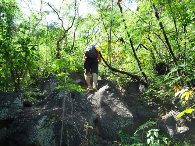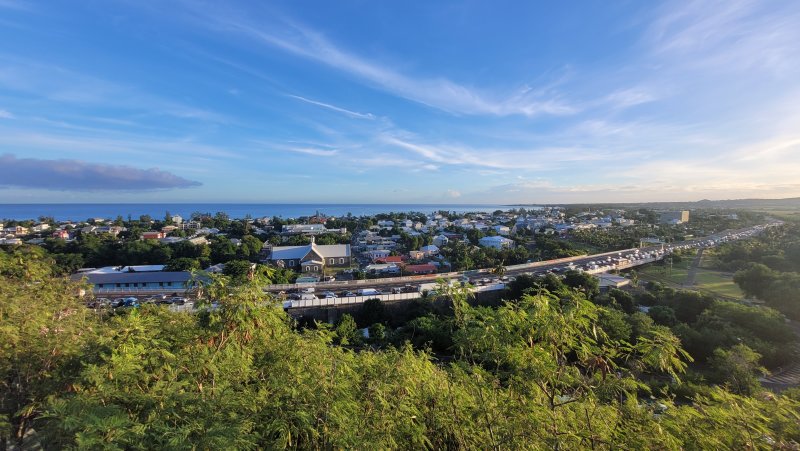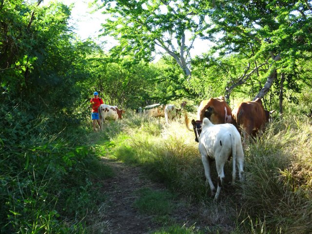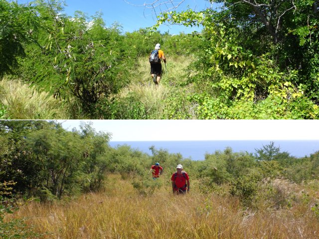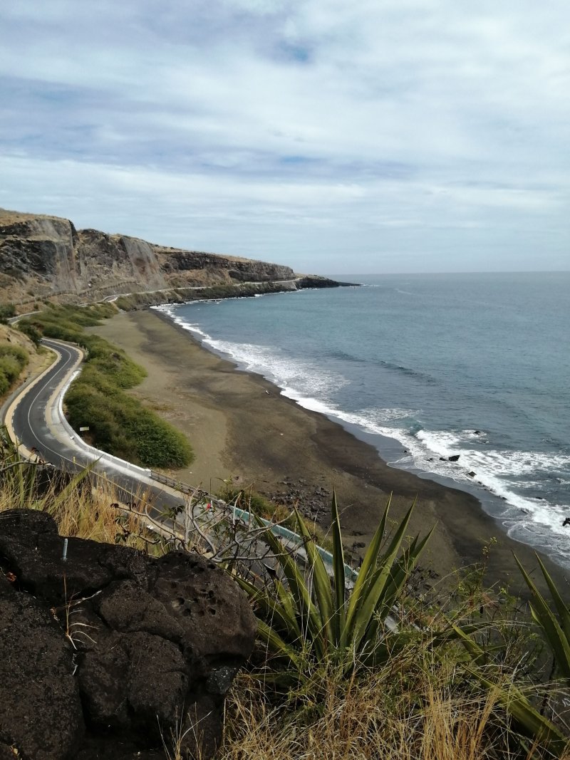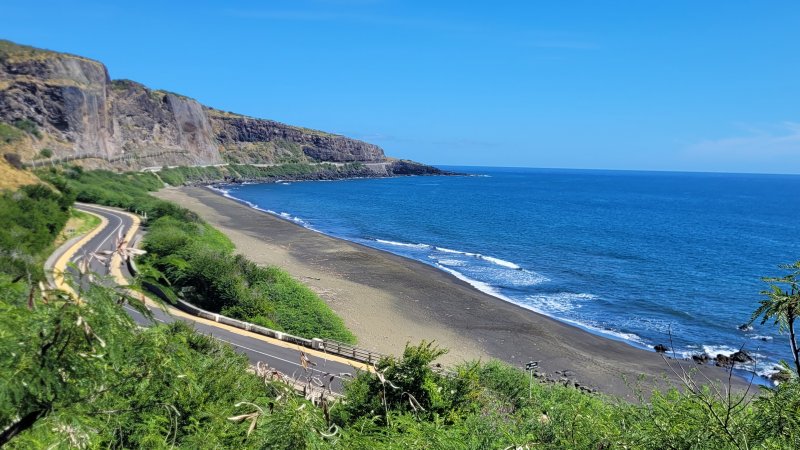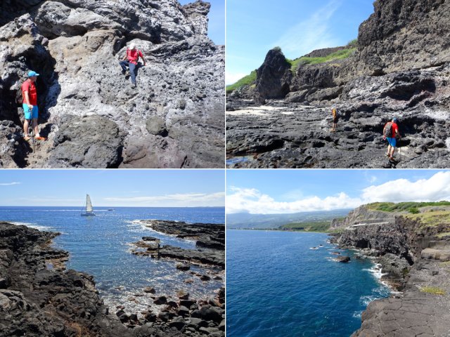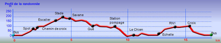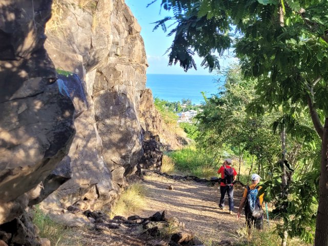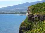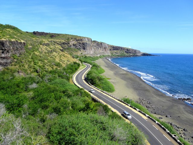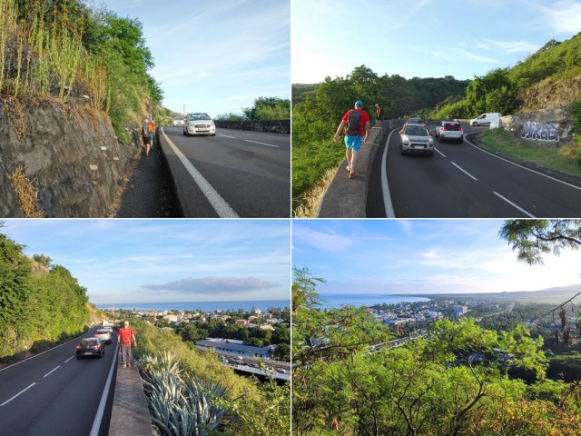Randonnée pour à peu près tout le monde : La randonnée débute ici à la gare routière de Saint-Paul où il est aisé de se rendre en bus. De grands parkings attendent les randonneurs gagnant la ville en voiture. Longer tout d'abord la Chaussée Royale en marchant au plus près du canal envahi de végétation et peuplé de nombreux tilapias (Photo 1). Quitter le boulevard bruyant pour préférer la large esplanade bordée de cocotiers en direction de la RN1 qu'on franchit par en-dessous (Photo 2). La randonnée bruyante n'est pas encore terminée. Il faut longer une partie de la Route de Plateau Caillou, très fréquentée aux heures d'embauche. La marche pourrait y être dangereuse sans la possibilité de marcher dans les caniveaux bétonnés ou sur les larges murs en bordure permettant de bénéficier de beaux panoramas sur la ville (Photo 3). Après quatre lacets et des centaines d'automobilistes, prendre la petite rampe à gauche de la route et rejoindre la falaise. On se retrouve face au panneau du site d'escalade "Les Gaillards". Ne pas hésiter à prendre une dizaine de minutes pour longer la falaise vers la gauche et apprécier la qualité du site, l'originalité des spots et le remarquable aménagement de la zone plate (Photo 4). Ce site est certainement l'un des mieux aménagés de l'île et mérite une visite, surtout si des grimpeurs sont en action. Revenir au panneau et entamer une longue montée bordée des stations blanches d'un chemin de croix assez peu fréquenté. On s'élève rapidement en dominant l'église de la Conversion datant de 1708, maintes fois détruite et reconstruite (Photo 5). Le franchissement du rempart s'effectue donc sur des dizaines de marches surchauffées en pleine journée (Photo 6). Une fois au sommet, on se retrouve face à la dernière station représentée par une haute croix datant du Jubilé de 1950. Contourner le monument par la droite sur un sentier ayant remplacé l'escalier (Photo 7). De nombreux petits panneaux rappellent qu'on est sur le circuit du trail de la boucle du Belvédère. Longer la piste qui file en direction des premières habitations de Plateau Caillou (Photo 8). Un belvédère vieillissant trône sur la droite. On y trouve quelques explications et de belles vues sur la Baie de Saint-Paul (Photo 9). La piste prend fin à la D6 qui contourne Plateau Caillou. Repérer la station service et se diriger plein sud entre l'AFPAT et le collège. Prendre l'Avenue Blanche Pierson sur quelques mètres avant de repérer le premier raccourci longeant deux écoles. On empruntera plusieurs de ces raccourcis jusqu'à l'Avenue des Martins, toujours dans la verdure ou dans des zones de repos ou d'activités sportives (Photo 10). Suivre un peu l'Avenue des Martins puis prendre à gauche une série d'escaliers toujours éloignés de la circulation dans la même verdure (Photo 11). Suivre un peu de l'Avenue Winson en profitant des paysages sur la savane qu'on va bientôt rejoindre (Photo 12). Emprunter le Chemin Summer avant de bifurquer vers la Savane du Cap La Houssaye en longeant une casse automobile sur un petit sentier (Photo 13). Si les biquettes rencontrées ignorent les randonneurs, les taureaux moka surveillent de près leurs femelles et veaux lorsqu'il faut traverser le troupeau (Photo 14). Marcher dans les médeciniers rouges, épineux et hautes herbes en direction de la Ravine Fleurimont (Photo 15). Traverser le gué à sec et entamer la montée en direction du haut de la colline. On s'élève sans difficulté sur ce sentier bordé d'herbes hautes en profitant de vues de plus en plus larges sur l'océan et la Route des Tamarins qui pénètre dans le long tunnel (Photo 16). Poursuivre à plat sur un sentier parfois étroit selon la hauteur des herbes (Photo 17). Entamer ensuite la descente qui mène vers la Ravine Boucan Canot, totalement à sec également. Le cheminement s'effectue sur des sentiers étroits, de larges pistes caillouteuses, des portions envahies de hautes herbes ou en pénétrant dans les parties boisées longeant les ravines (Photo 18). Aucune difficulté pour la marche mais un peu plus dans l'orientation si l'on décide comme ici de suivre un itinéraire bien particulier. Celui-ci longe la Ravine de Boucan Canot, monte en direction d'une citerne et redescend calmement vers le Cap La Houssaye qu'on devine au loin. Le terrain et la végétation ne changent pas jusqu'à la route littorale. Une fois sur la route, traverser et rejoindre la mer par un sentier dans les épineux. Aucune difficulté pour marcher sur le platier basaltique très déchiqueté jusqu'au Rocher de Chien qui nécessite quelques courtes ascensions et descentes techniques (Photo 19). Eviter la baignade qui peut être dangereuse du côté du souffleur et reprendre le chemin inverse jusqu'au Trou du Cuisinier (Photo 20). Après un court passage sur route il est agréable de redescendre au plus vite sur la plage pour éviter la circulation. Hélas, en raison d'importants travaux d'élargissement de la route, la jonction avec le Cap de la Marianne s'effectue par la piste cyclable (Photo 21). Une fois à la Marianne, lever les yeux pour l'apercevoir, franchir le tunnel ou la plage puis rejoindre Saint-Paul par le cimetière ou la Grotte des Premiers Français en visitant les lieux importants.