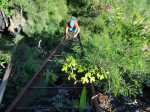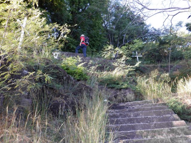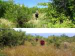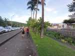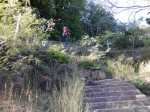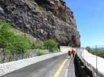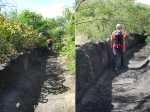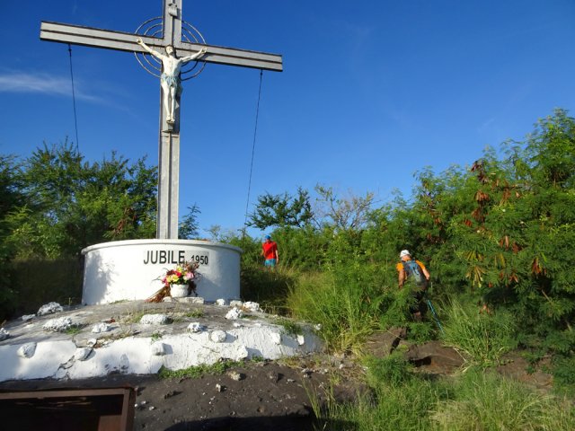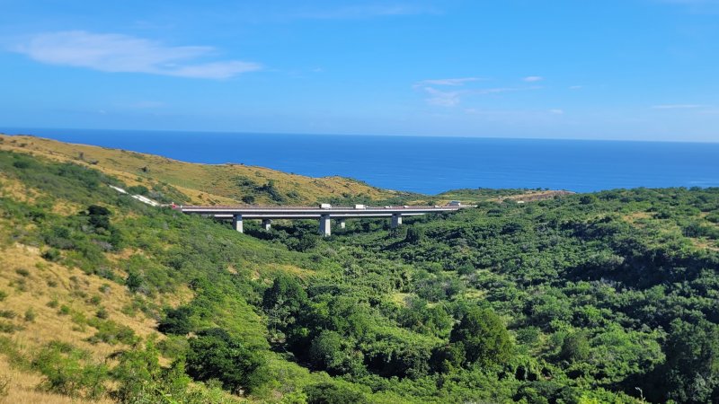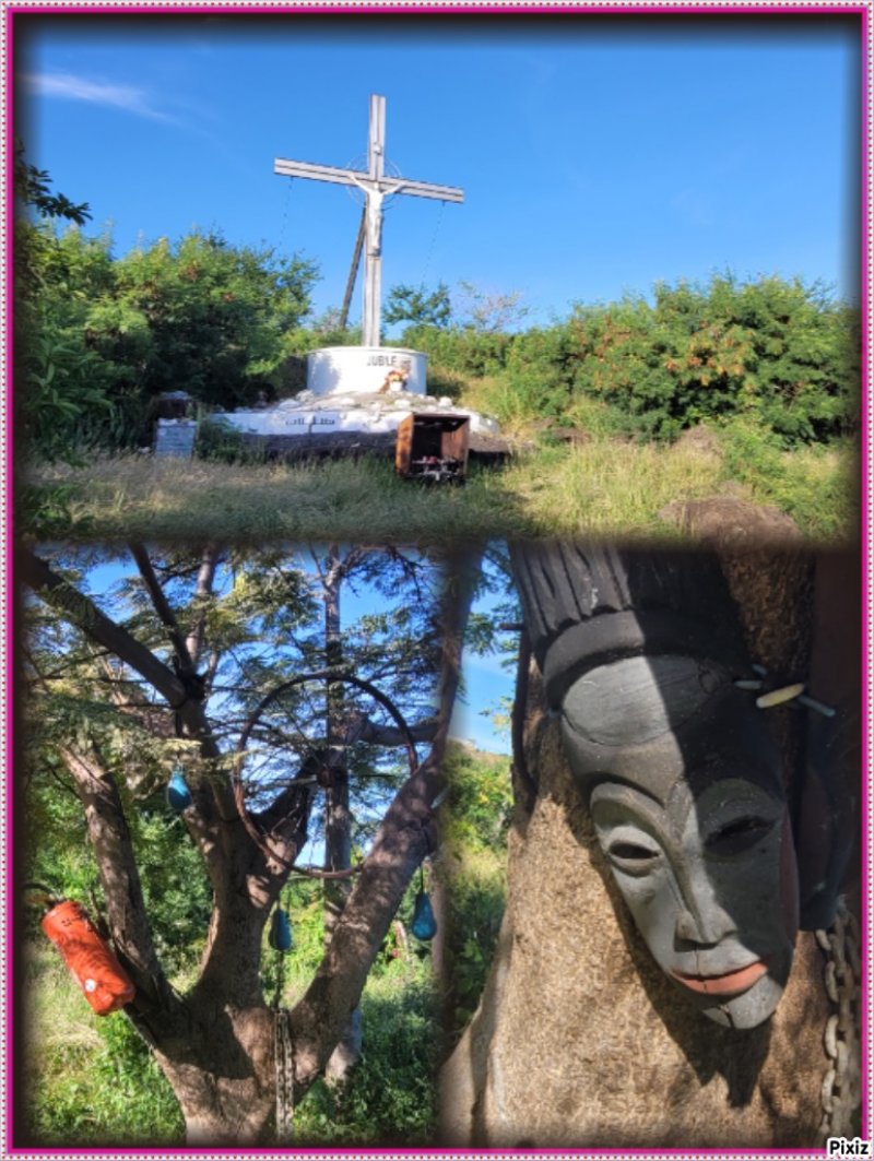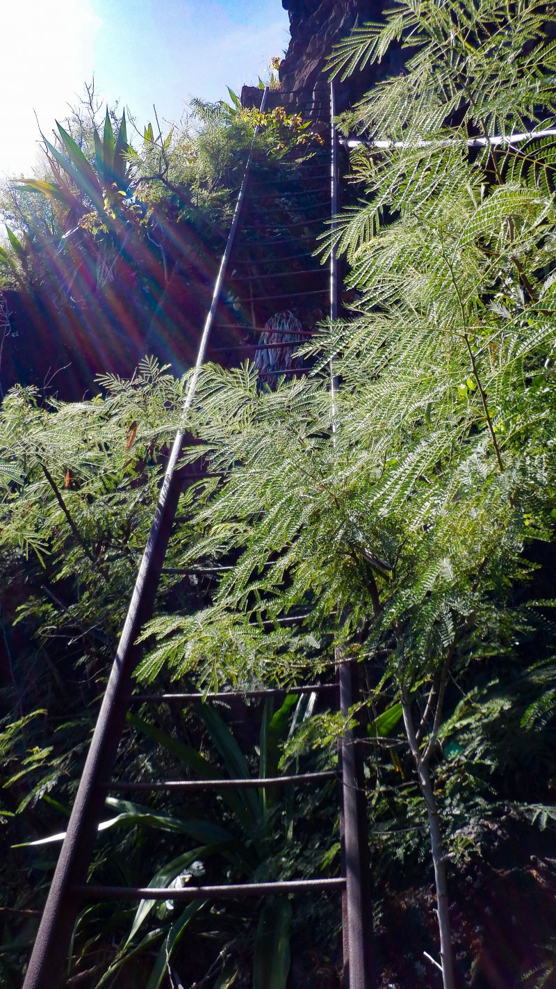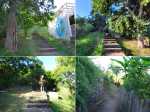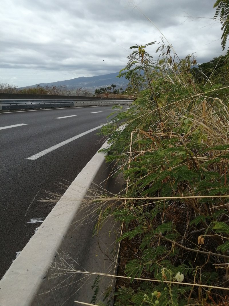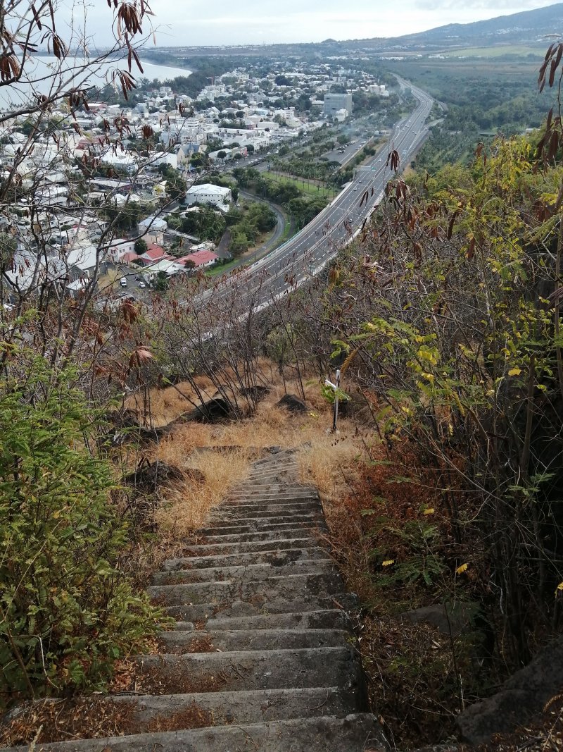 Randonnée pour peu de monde : Au lieu de filer à Saint-Paul à partir de la Ravine Fleurimont, repérer l'échelle qui domine la vallée sur la gauche. Entamer le premier hors sentier dans les roches entourées d'épineux qu'il vaut mieux ne pas utiliser pour se maintenir (Photo 22). Malgré la pente, on se retrouve rapidement au pied d'une très longue échelle fabriquée à l'aide des rails du chemin de fer qui passait à quelques mètres. Elle est longue et semble solide malgré la rouille et un barreau dessoudé. Prendre son temps pour l'ascension qui peut inquiéter si on souffre de vertige (Photo 23). Depuis le rempart rocheux, on a de belles vues sur les Petits Récifs et la route en travaux (Photo 24). De l'autre côté, on se retrouve à la hauteur du rocher peint en blanc qui fait ressortir les contours d'un visage ayant donné son nom au Cap de la Marianne (Photo 25). Les curieux ne voulant voir que l'échelle peuvent également faire demi-tour et rejoindre Saint-Paul. Les autres, plus téméraires ou inconscients, poursuivront assez longuement dans le lit d'une ravine bétonnée destinée à détourner les eaux de la falaise et de la route (Photo 26). Quitter le lit et partir plein est pour retrouver les vestiges de la piste se trouvant là au siècle dernier. Il faut de l'imagination pour la deviner au milieu des hautes herbes, lianes, épineux et zépinards (Photo 27). Le bruit de la RN1 guide les pas jusqu'à l'échangeur de Plateau Caillou. On a sous les yeux le paysage traversé en total hors sentier et, comme on ne peut pas franchir la voie rapide, longer tout simplement la route et la bretelle dans le goulet cimenté la bordant (Photo 28). La demi-boucle est très longue mais sans danger pour parvenir à la station service repérée en arrivant à Plateau Caillou. A la station, traverser la route pour reprendre la piste jusqu'à la croix rencontrée en début de boucle. Terminer par les escaliers du chemin de croix, le fossé longeant les lacets et rejoindre la gare par le même itinéraire ou, comme ici, en empruntant l'Impasse Pied des Rampes pour passer sous la RN.