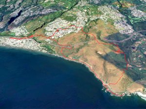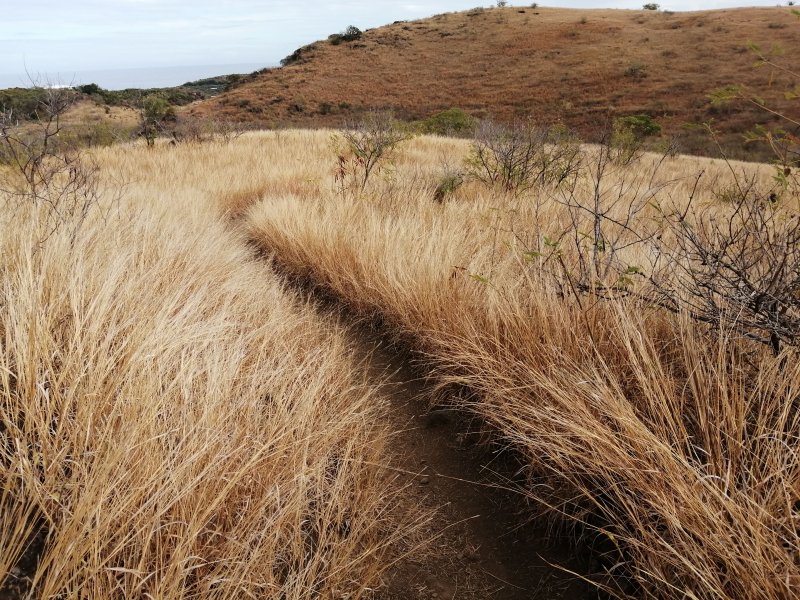 Cette longue boucle éclectique emprunte tour à tour des portions de boulevards et un chemin de croix, longe des spots d'escalade, traverse une ville sans jamais rencontrer un véhicule, sillonne la savane du Cap La Houssaye sur de nouveaux sentiers, explore le platier entourant le Rocher de Chien, utilise une longue échelle pour s'approcher de Marianne et de son long nez blanc avant d'explorer une véritable savane africaine sans risque d'y rencontrer de carnassier. En revanche, s'il est impossible d'y croiser une girafe, on est certain de rencontrer des cabris, des bœufs moka, des cailles et même des lièvres. Difficile d'imaginer qu'il est possible de courir l'aventure à moins de 300 m de la ville de Saint-Paul ; c'est pourtant ce que propose ce circuit qui ne conviendra pas à tous les marcheurs. Pourtant, la quasi totalité de l'itinéraire est réalisable par tout le monde à condition d'abandonner à la Ravine Florimont et de rejoindre le point de départ en longeant la plage des Petits Récifs jusqu'au cimetière de Saint-Paul (voir détails ci-dessous). On sait qu'une vingtaine de sentiers traversent la savane du Cap la Houssaye mais on ignore souvent qu'il est possible de traverser Plateau Caillou sans risque de se faire renverser par une voiture. Nous avons pris plaisir à reconnaître cette boucle et prenons le pari qu'elle séduira d'autres curieux qui prendront bien soin d'avoir suffisamment d'eau et se couvriront de crème solaire.