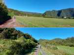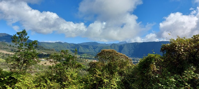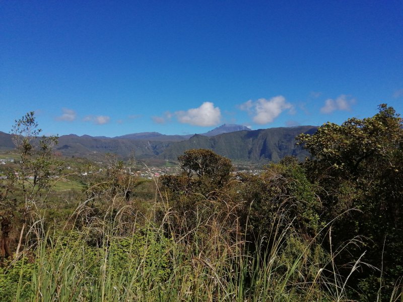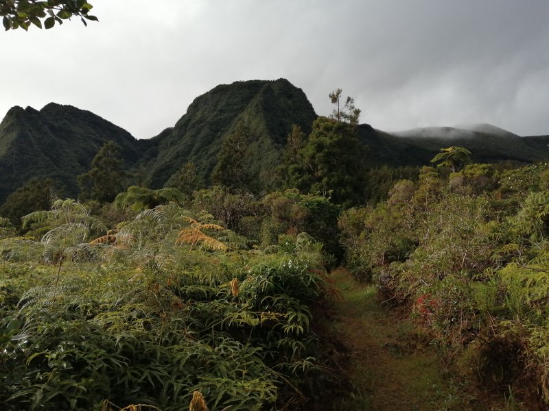 Il y a peu de temps, j'avais voulu effectuer la randonnée 1122 - Le Piton des Cabris par la Route Omega, etc- dans le même secteur. J'ai démarré vers la ruelle des Acacias. La pluie s'est invitée rapidement, alors j'ai préféré dévier sur le sentier menant au départ du sentier Piton Textor, puis la RF, la rue Saint Ange Vella, et retour par les rues parallèles à la RN5. Une boucle incluant la foret des Cryptomérias, la route Omega, le sentier des ligne 500 et des ruelles avec des jolies cases et jardins qui m'a donné envie d'y retourner. Donc quand j'ai vu cette proposition, j'ai foncé! Cette fois-ci, j'ai démarré à Bras des Calumets en faisant la boucle dans le sens indiqué sur la fiche. Eh bien, je suis déçue...mais uniquement par le nom de la randonnée. En cette saison, je pensais me gaver de goyaviers sur tout le parcours! Hé non, ils se méritent! Si 5+h de marche avec autant de béton/goudron ne vous inspire pas, sachez que vous pouvez aisément raccourcir. La Plaine des Palmistes vaut le coup d'être visité.