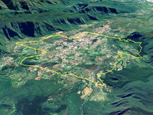 La Ronde des Goyaviers est une course organisée par la ville de La Plaine des Palmistes en mai de chaque année sur 24 km autour du village. En juillet, le Trail des Trois Pitons en refait le tour mais s'intensifie sur les 20 km permettant de rejoindre Piton de l'Eau et Piton Textor. Cette boucle passe au plus près de la partie urbaine de ces deux courses. La fiche propose un tour complet de La Plaine des Palmistes avec quelques variantes pour diminuer le parcours ou éviter la route en empruntant par exemple des raccourcis entre les habitations en fin de boucle. Pas de difficulté sportive, hormis un court tronçon de sentier dans la forêt de cryptomerias sur des racines glissantes et sur des pentes où les mains s'avèrent utiles. La Plaine des Palmistes vaste et plate, offre constamment de magnifiques panoramas sur les pitons environnants. La ville également plate est de plus en plus urbanisée. En revanche, l'espace entre chaque habitation et les vastes jardins fleuris qui les entourent donnent rarement l'impression de se trouver en ville. On parle souvent des cases créoles de l'Entre Deux mais il faut avoir vu au moins une fois celles de La Plaine des Palmistes. 50% de la boucle s'effectue sur goudron, 50% sur pistes et sentiers. A faire pour mieux connaître cette commune de l'île située à 1000 m d'altitude. Les sportifs apprécieront le calme et la faible circulation pour courir sereinement. Les cyclistes, une fois le tour terminé, voudront sans doute le refaire pour mieux l'apprécier à condition de couper par le Chemin Frémicourt à Bras Piton qui permet d'éviter les racines de cryptomerias.
