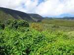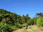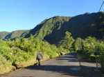Marcher sur des routes ou pistes ne me dérange pas du moment qu'il n'y a pas de circulation, ce qui était le cas aujourd'hui (et doit l'être souvent car nous sommes sur des axes secondaires, voire tertiaires !). Et si en plus c'est presque plat, qu'il fait 15 à 17 degrés avec du soleil et une brise stimulante, et qu'on trouve des goyaviers à point, c'est encore mieux ! Les passages de ravine ne posent plus problème : pour ravine sèche l'accès a été nettoyé et on voit bien que ça part sur la gauche pour retomber sur la ruelle ; pour Grand bras Piton il y a un marquage rose.