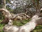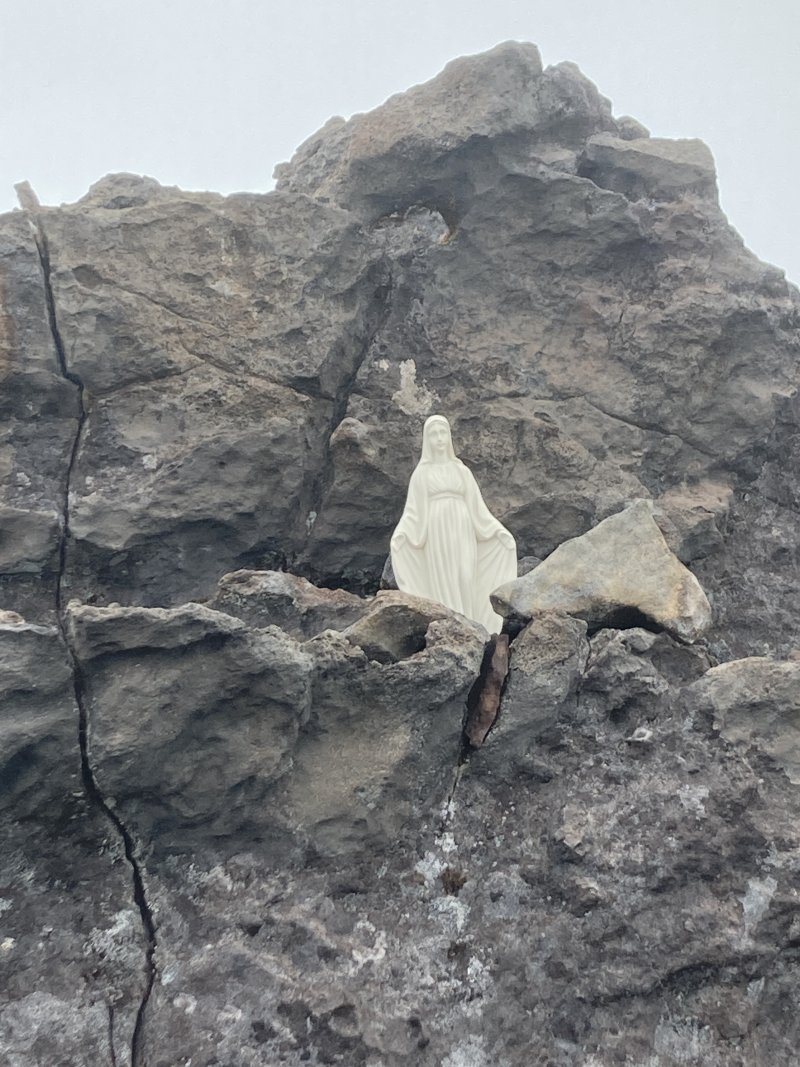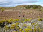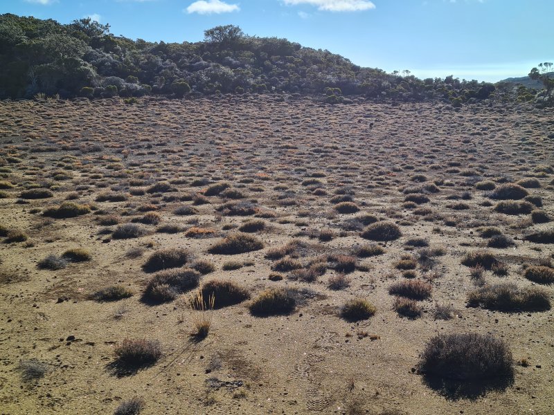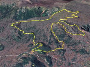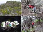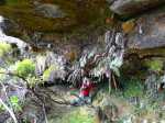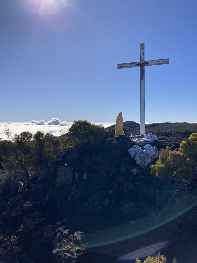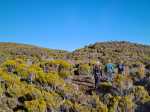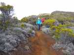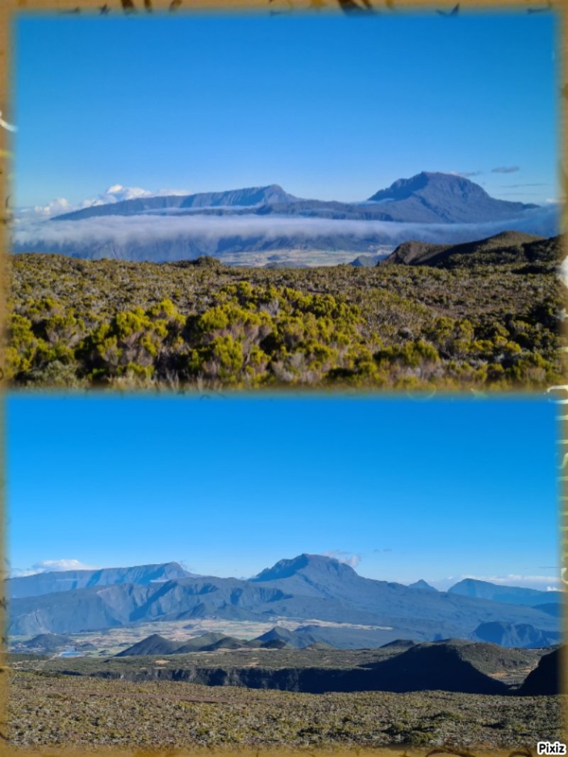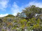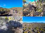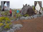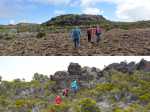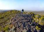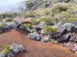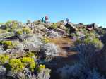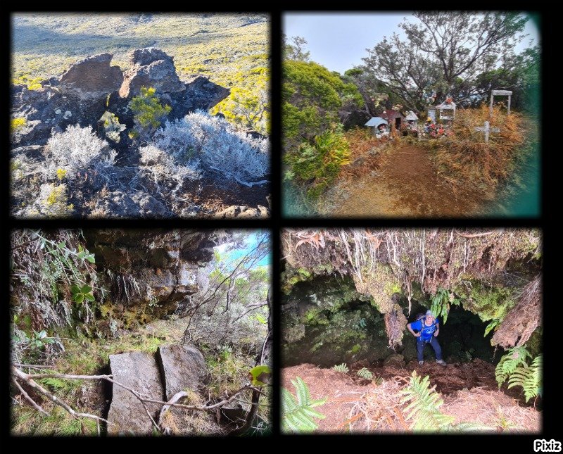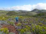 La randonnée débute à l'aire de pique-nique de Bois Ozoux sous des dizaines de petits tamarins. Rejoindre le GRR2 qui remonte vers l'Oratoire Ste-Thérèse. Le sentier, en pente légère, est bien marqué à travers les brandes d'altitude (Photo 1). Marcher jusqu'à la Stèle Josémont Lauret en profitant de magnifiques panoramas sur le Piton des Neiges et vers le Nez de Bœuf. Dix mètres avant le monument vieillissant, obliquer à gauche puis emprunter un étroit sentier remontant en direction du sommet du Piton des Feux de Manzac. Il est emprunté principalement par les fidèles qui viennent prier la petite vierge perchée à 2384 m d'altitude. La croix qui lui tient compagnie et qui orne le sommet n'est visible ni de la route ni sur les cartes (Photo 2). Poursuivre sur l'arête sommitale rocheuse où peu de végétation vient gêner la marche (Photo 3). Redescendre et obliquer à droite pour retrouver pour quelques instants le GRR2 et la piste empierrée menant à la Caverne des Lataniers. La caverne, fouillée par les archéologues en 2017, a retrouvé son aspect habituel et peut abriter plusieurs personnes en cas de pluie. Elle aurait longuement abrité le roi Manzac, sa femme la Reine Fouche, plusieurs marrons au 18ème siècle ainsi que des chasseurs d'esclaves ou premiers explorateurs. Les abords de la caverne auraient même accueilli un abri dont on peut apercevoir quelques traces de murets (Photo 4). Quitter les lieux pour marcher vers l'ouest en direction de collines non marquées sur la carte mais bien visibles sur le terrain (Photo 5). La marche est aisée et respectueuse de la flore si l'on prend soin de contourner les touffes de branles blancs ou verts (Photo 6). La végétation rase de la région permet des panoramas de tous côtés. On domine la Plaine des Cafres, la vallée de la Rivière des Remparts et le Cratère Commerson datant de 60 ap. JC (Photo 7). Se diriger ensuite vers le piton 2390 qui se remarque aux roches empilées au sommet et se rejoint très rapidement à travers de vastes étendues de thym marron (Photo 8). Le chaos rocheux se traverse facilement avant d'entreprendre la jonction avec le piton 2399 (Photo 9). Les grandes étendues de thym permettent une marche rapide totalement à plat (Photo 10). Le bord du cratère comporte des zones rocheuses avec de belles formes minérales (Photo 11). Longer le cercle presque parfait du cratère puis prendre ensuite la direction du Rempart des Basaltes en escaladant ou en évitant le piton 2412 déjà présenté dans une autre boucle hors sentier (Photo 12). Rejoindre la piste puis le sentier menant à l'oratoire Ste-Thérèse et le Piton des Basaltes surmonté d'antennes. Profiter des superbes vues sur le Fond de la Rivière de l'Est et sur le piton éponyme (Photo 13). On peut filer en hors sentier pour rester dans l'esprit de cette boucle ou longer le sentier menant au Piton de l'Eau pour continuer à profiter des paysages sur la droite (Photo 14). Rapidement, trouver un passage facile dans la végétation pour atteindre le piton 2361 que l'on remarque depuis le sentier (Photo 15). La montée rapide est facile. Poursuivre vers l'est en serpentant entre les touffes de diverses brandes. Après un km on se retrouve face à un cône éruptif récent, nu, où des traces de sentiers montrent qu'il est régulièrement visité (Photo 16). Les gratons de la coulée de lave du Petit Cratère sont instables autour de la bouche abritant quelques instruments de l'observatoire du volcan. Après ce cratère, se diriger ensuite vers le Piton Sauvetage qu'on escalade quelques minutes plus tard. Une fois au sommet on domine à nouveau la région et la prairie circulaire occupant le fond de l'ancien cratère (Photo 17). Partir sur la gauche en longeant l'arête du cratère et trouver dans le bas le petit sentier menant à la prairie (Photo 18). Avant de poursuivre, monter un peu dans les branles puis rejoindre la grotte qu'on devine depuis la prairie. Cet abri naturel a sans doute connu la visite de Manzac même si on n'en trouve mention nulle part (Photo 19). Il reste dans la région de nombreux petits cônes éruptifs anciens entre le Piton Sauvetage et la Piste Forestière du Piton de l'Eau (Photo 20). Le premier rencontré est le piton 2276 recouvert de tant de végétation qu'on n'y trouve que très peu de traces de passages des bovins. Son ascension est courte mais intense car il faut se baisser constamment pour passer sous les branches. Il faut même ramper par endroits pour faire passer plus facilement le sac à dos (Photo 21). Cette ascension est facultative pour cette raison même si on y rencontre une grotte originale dans la descente. Le piton 2220 est plus facile d'accès. On chemine dans des branles plus grands que depuis le départ, ponctués par endroits de quelques tamarins (Photo 23). On peut là aussi éviter le piton ou en escalader les flancs en passant toujours sur des zones sableuses sans végétation ou sur des sentiers créés par les petites vaches. La végétation devenant plus dense, filer plein nord pour rejoindre le sentier du Piton de l'Eau. Partir à gauche pour traverser la tamarinaie au pied du Piton Tangues, idéale pour une pause sur la pelouse. Certains arbres, tombés au sol, poursuivent leur croissance dans des positions très biscornues (Photo 24). Il est alors possible de poursuivre par les sentiers jusqu'au Bois Ozoux ou, comme ici, entamer une longue boucle pour atteindre et contourner le piton 2368. C'est parti pour un long périple qui zigzague entre les touffes ou bosquets en cherchant toujours à marcher sur les plaques sableuses (Photo 25). Ces espaces deviennent glissants dans les fortes pentes (Photo 26). Une fois au plus près du sommet il est possible de rejoindre le Piton des Feux de Manzac ou de longer la vallée d'un affluent du Grand Bras Piton. Dans ce cas, le parcours passe près d'un rocher dans lequel on voit deux nouvelles Vierges. Seuls les randonneurs aimant le ho